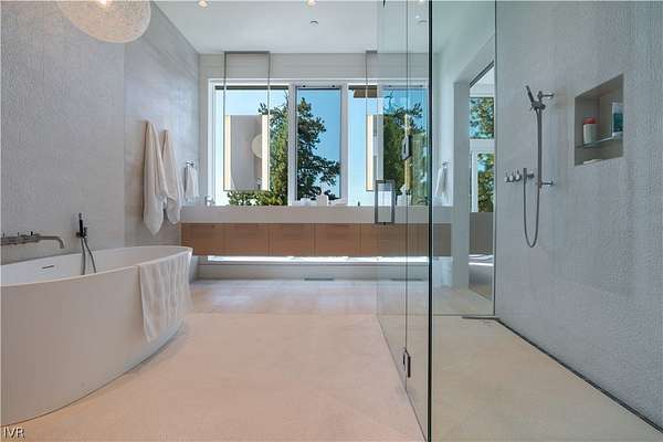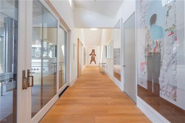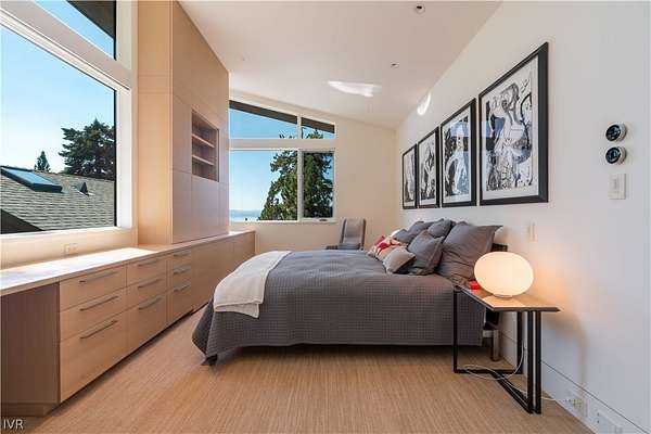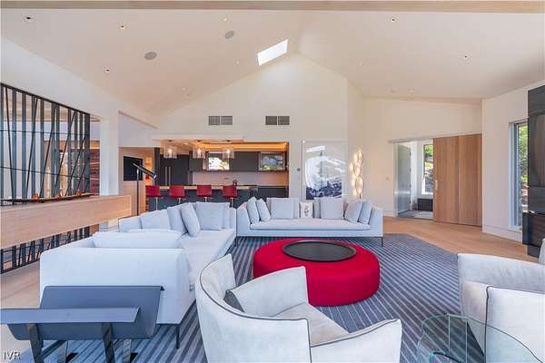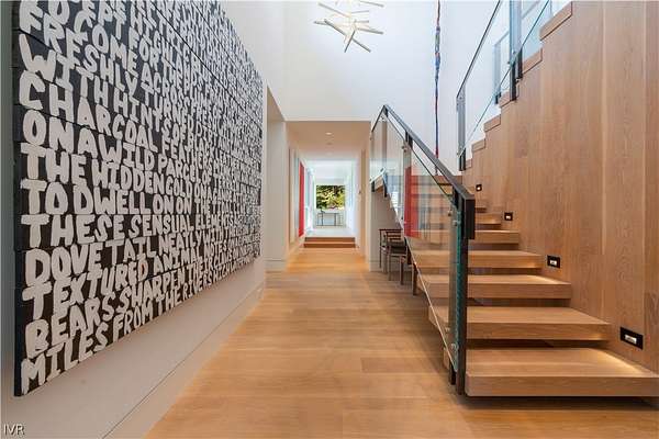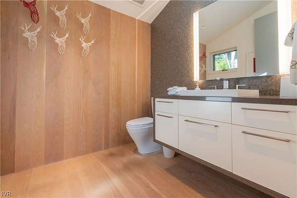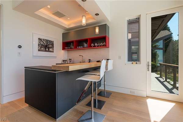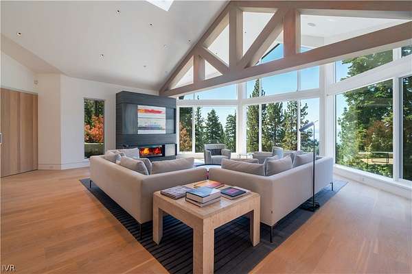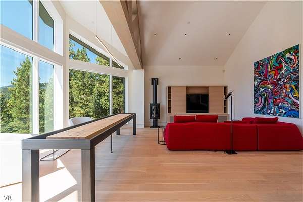 Contemporary estate by Doc Gelso completed in 2015 and set on a private 5-acre street-to-street parcel with gated entry & exceptional seclusion. The exterior is clad in reclaimed 100-year-old barnwood, blending warmth with refined modern design. Expansive southwest-facing glass, clean architectural lines, & high-gloss cabinetry define the interior, complemented by a striking wine wall & a primary suite featuring a mirrored bath positioned to capture lake views. The main level offers seamless, step-free access & includes the living room, dining area, primary suite, office, & family room with panoramic doors opening to an expansive deck. Designed for indoor-outdoor living, the grounds feature extensive landscaping, water feature, spa, built-in BBQ, and generous entertaining areas overlooking the private acreage. Amenities include geothermal heating, air conditioning throughout, a three-car garage, and additional guest parking. Excess land coverage allows for a future casita or expansion.