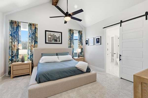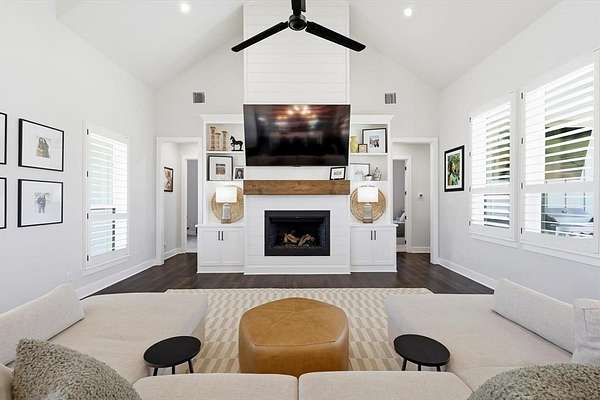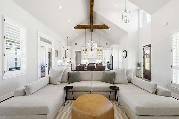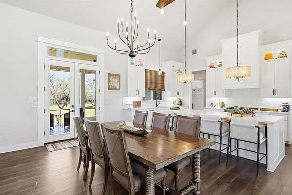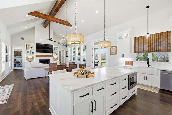 Welcome to the perfect blend of modern farmhouse charm and country space on over 2 beautiful acres within a gated community. This thoughtfully designed home offers a warm, inviting interior with stunning vaulted ceilings and natural light throughout. The gorgeous kitchen features a window overlooking the peaceful backyard and seasonal creek, creating the perfect view while cooking or entertaining. Gas stove, large island and a wet bar off of the kitchen with tons of storage throughout.