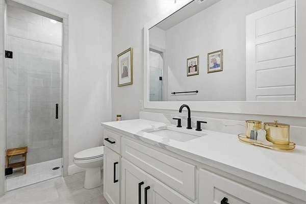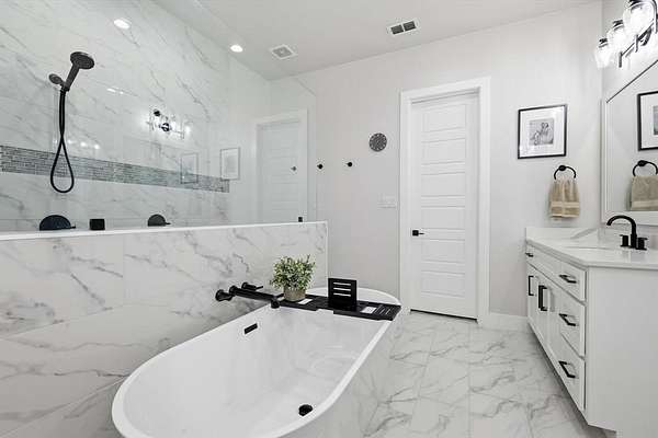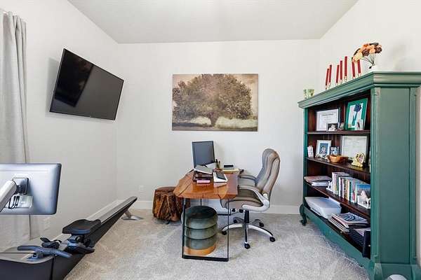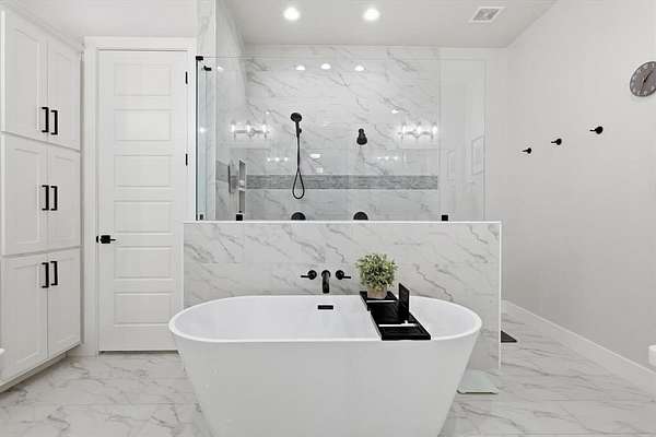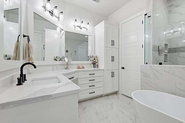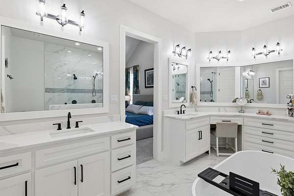 The luxurious primary suite includes an amazing spa-like bath designed for comfort and relaxation. Step outside to enjoy the outdoor kitchen and patio area, with a convenient fenced dog run nearby.