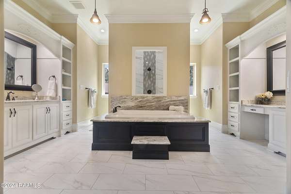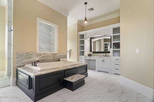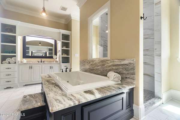 - 9+ ft Ceiling, Cathedral Ceiling, Cathedral Ceiling(s), Crown Molding, Double Vanity, Dual Closets, Gas Stove Con, Granite Counters, High Ceilings, Separate Shower, Varied Ceiling Heights, Walk-In Closet(s)