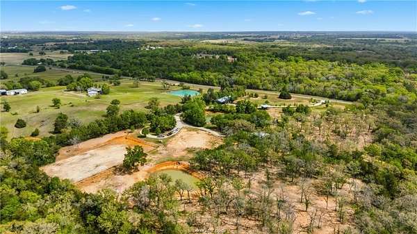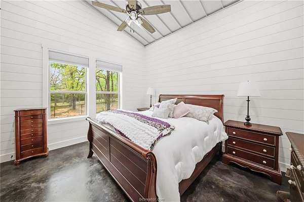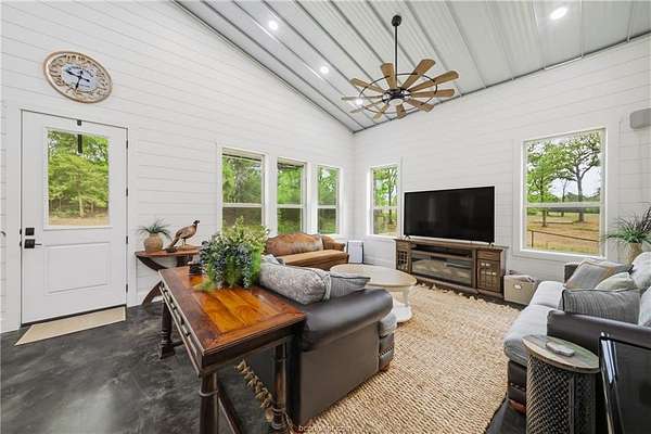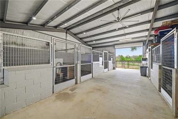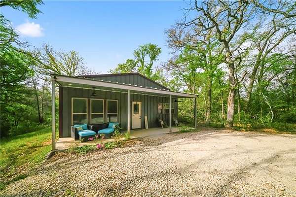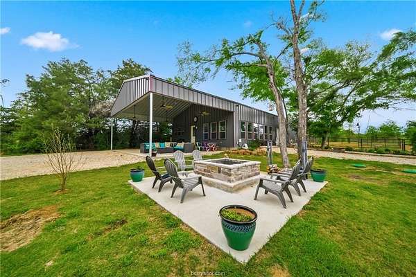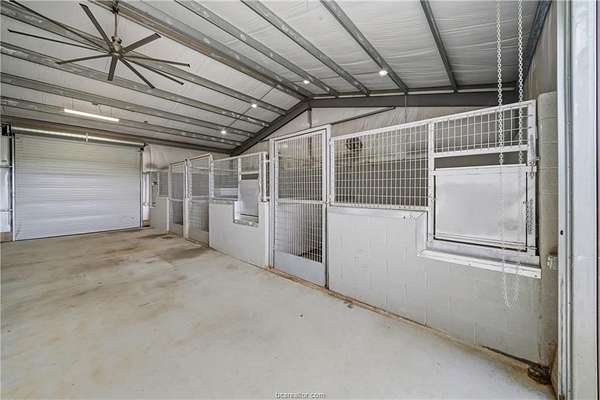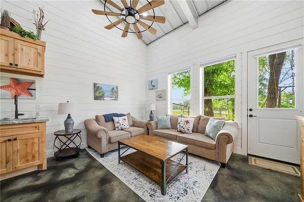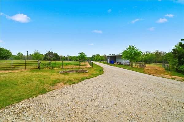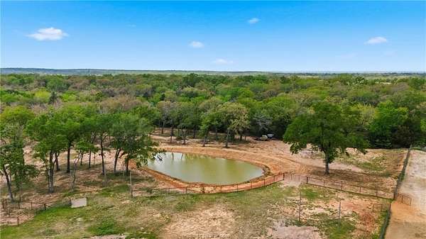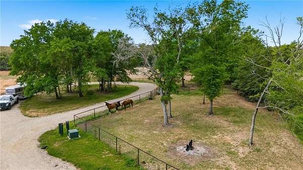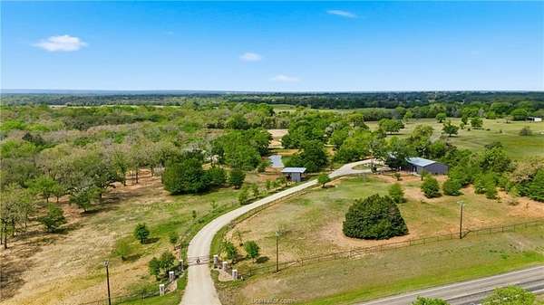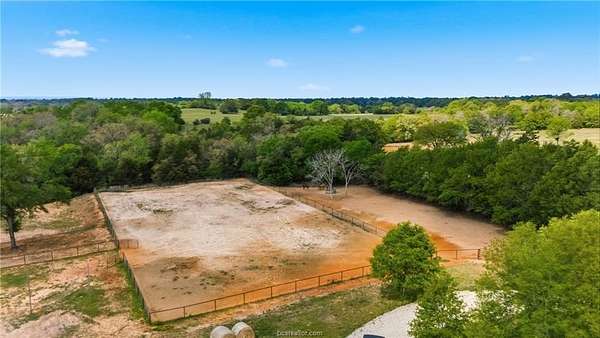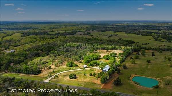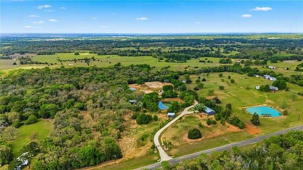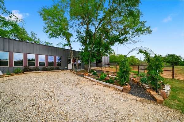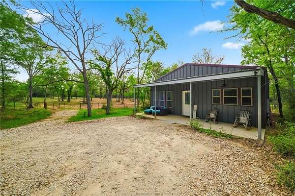 Set on nearly 18 acres of beautiful land, this exceptional property is designed for both equestrian and ranch living while offering comfort, versatility, and scenic charm. Fully fenced and cross-fenced with metal pipe fencing, the acreage features a balance of mature trees and open pasture. Two ponds enhance the setting, while three large pastures, three turnouts, and a loafing shed make this a turnkey setup for horses or livestock. The main living residence (1,665 sqft) showcases a modern, rustic aesthetic with stained concrete floors, soaring ceilings, and an open-concept layout. A full wall of windows floods the space with natural light and offers peaceful views of the acreage. Attached to the main home is a private apartment complete with its own entrance, living area, and full kitchen. Equestrians will appreciate the direct connection from the main structure to the barn, which includes five stalls and two tack rooms. A covered carport extends from the home, providing flexible space for parking, equipment storage, or outdoor entertaining. A second residence (1,369 sqft) adds even more value and functionality, featuring same high-end finish out. This residence has two bedrooms, one bathroom, full kitchen, laundry, and front porch. All of this is ideally located just 30 minutes from College Station, offering a great blend of rural privacy and accessibility. This is a rare opportunity to own a fully equipped, multi-residence ranch property ready to support your lifestyle.