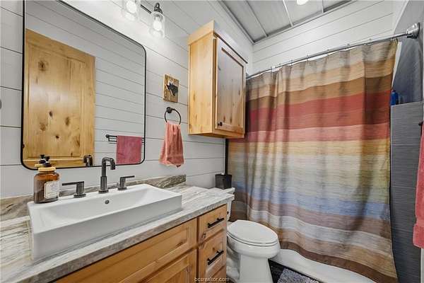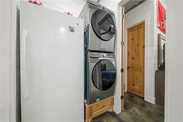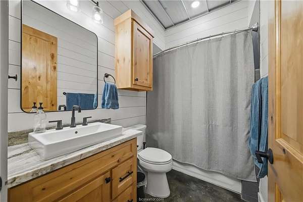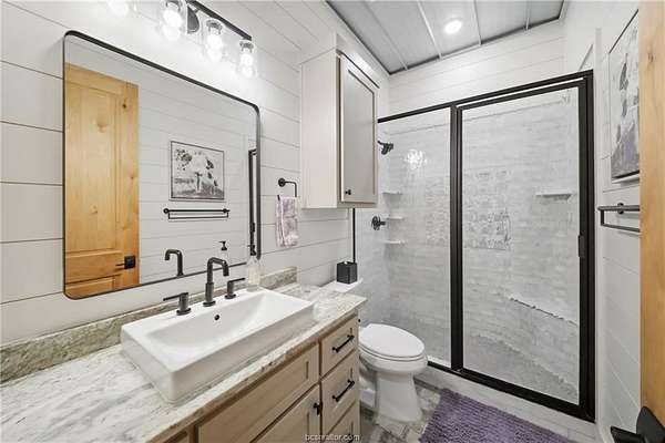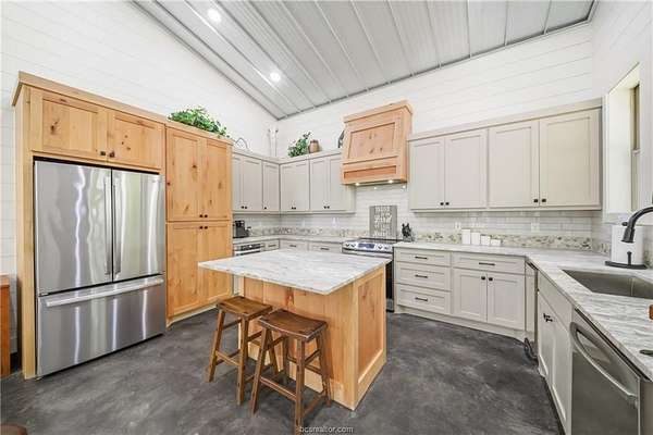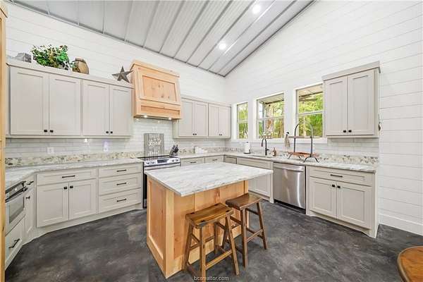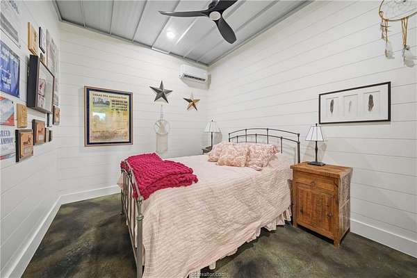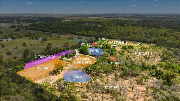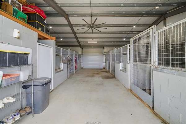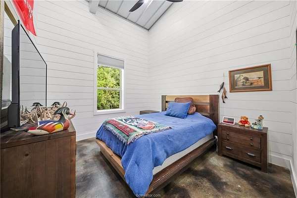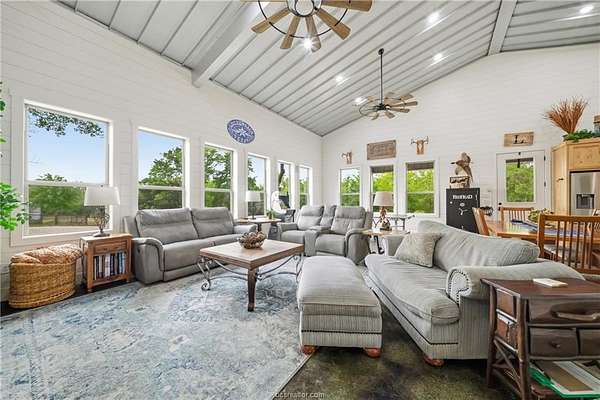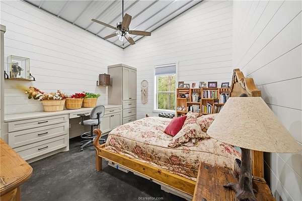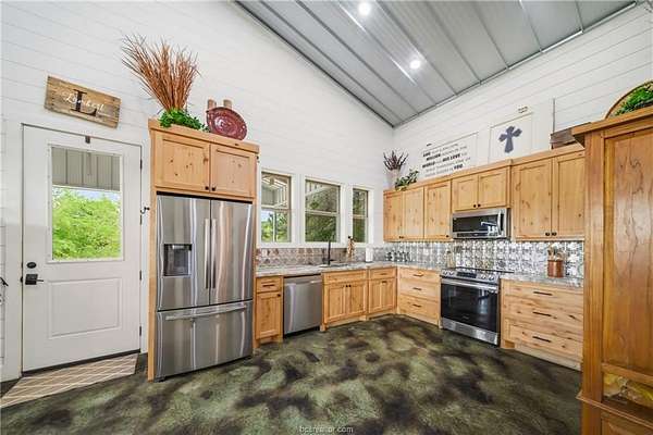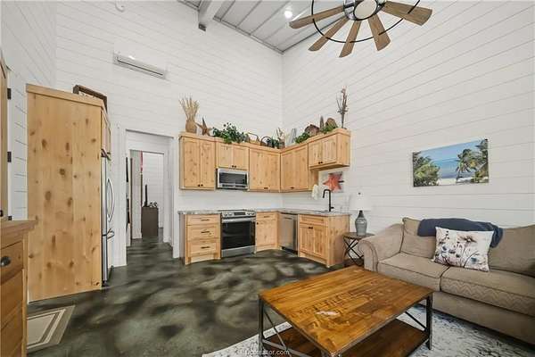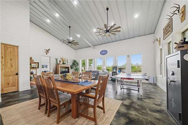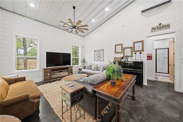 Set on nearly 18 acres of beautiful land, this exceptional property is designed for both equestrian and ranch living while offering comfort, versatility, and scenic charm. Fully fenced and cross-fenced with metal pipe fencing, the acreage features a balance of mature trees and open pasture. Two ponds enhance the setting, while three large pastures, three turnouts, and a loafing shed make this a turnkey setup for horses or livestock. The main living residence (1,665 sqft) showcases a modern, rustic aesthetic with stained concrete floors, soaring ceilings, and an open-concept layout. A full wall of windows floods the space with natural light and offers peaceful views of the acreage. Attached to the main home is a private apartment complete with its own entrance, living area, and full kitchen. Equestrians will appreciate the direct connection from the main structure to the barn, which includes five stalls and two tack rooms. A covered carport extends from the home, providing flexible space for parking, equipment storage, or outdoor entertaining. A second residence (1,369 sqft) adds even more value and functionality, featuring same high-end finish out. This residence has two bedrooms, one bathroom, full kitchen, laundry, and front porch. All of this is ideally located just 30 minutes from College Station, offering a great blend of rural privacy and accessibility. This is a rare opportunity to own a fully equipped, multi-residence ranch property ready to support your lifestyle.