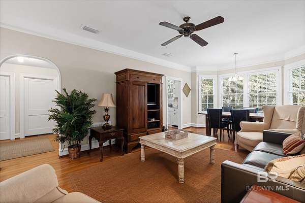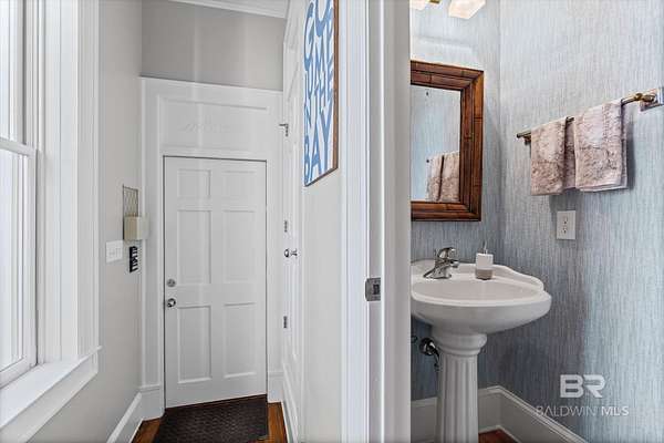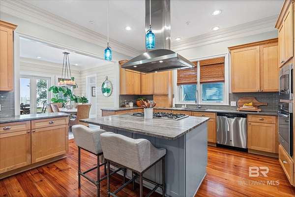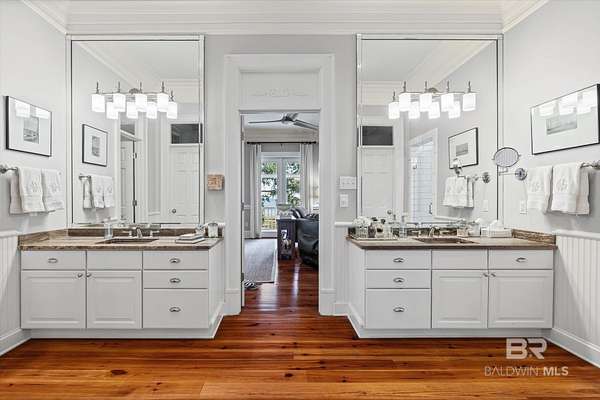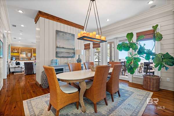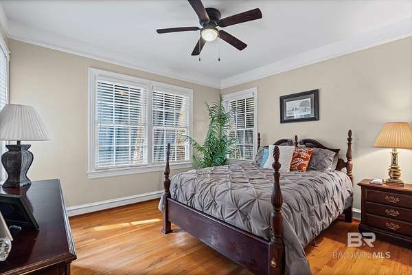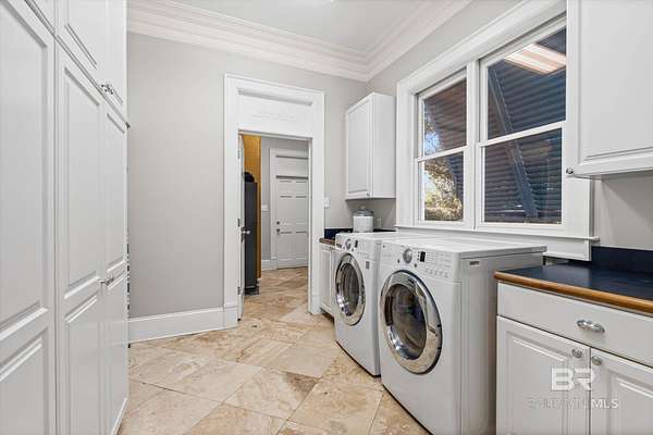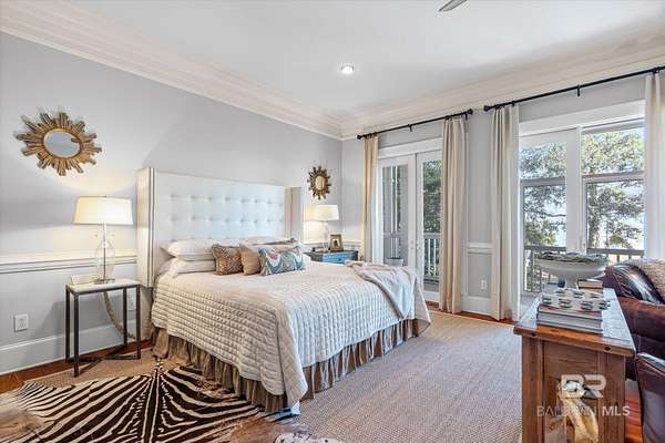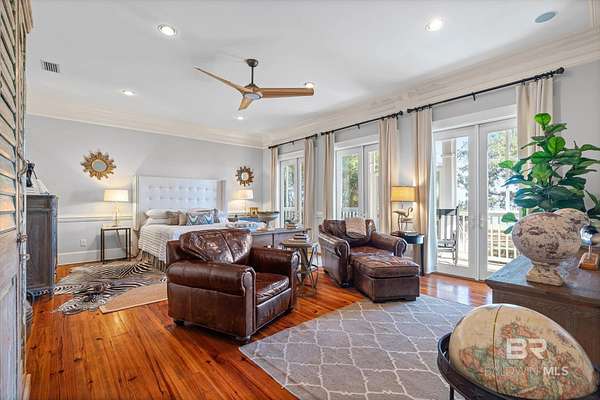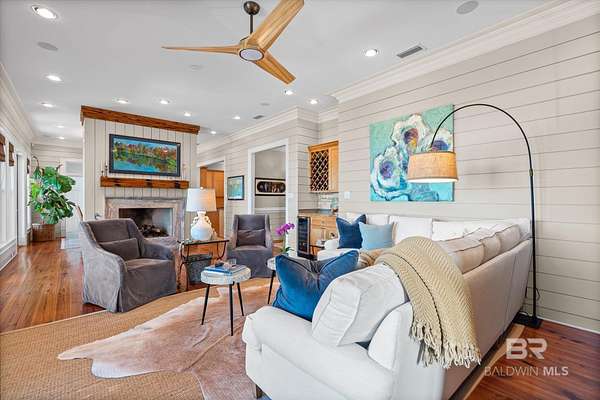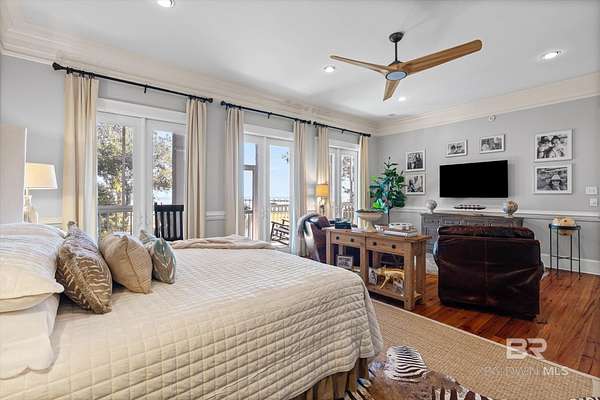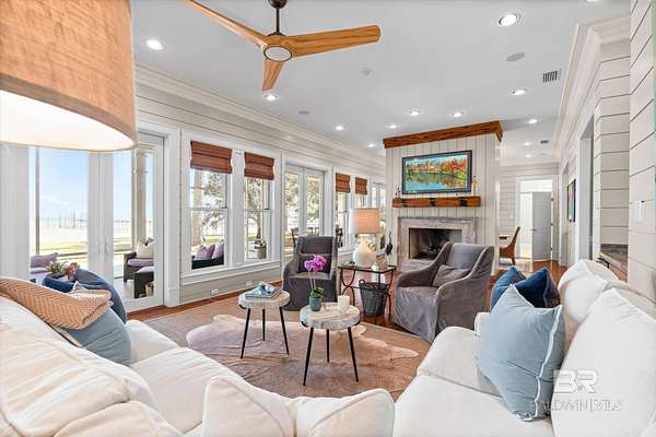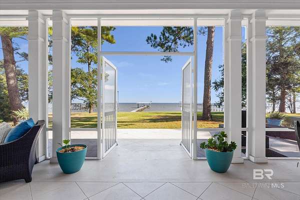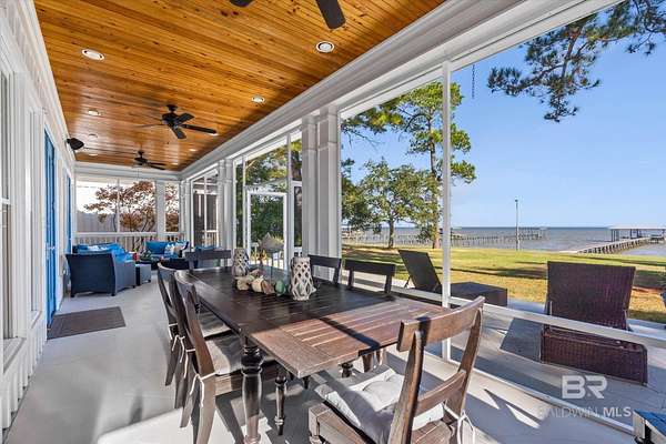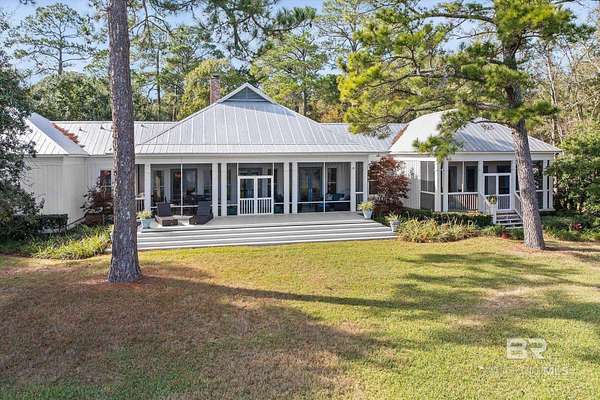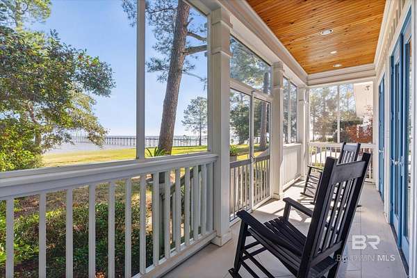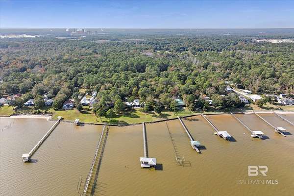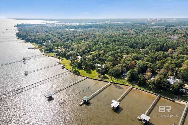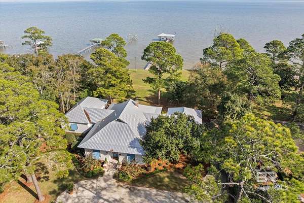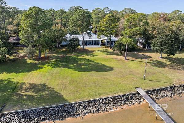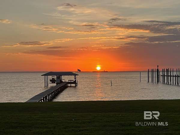 Custom Bayfront Home on Hollinger's Island | +-3 Acres |157' waterfront! Breathtaking Sunrise Views. Welcome to Solitude,where timeless Southern elegance meets unmatched privacy on Hollinger's Island. This custom, classic bay-style home sits on approx 3 acres and showcases picturesque sunrise views over beautiful Mobile Bay. From the moment you enter the charming dog trot-style foyer, you're welcomed by a stunning, uninterrupted view of the water. Flanking the entry are the guest BR's, formal dining room, and a beautifully designed kitchen--creating an inviting,functional flow for both everyday living and entertaining.Thoughtful craftsmanship is evident throughout the home. The custom-designed five-piece crown molding in the foyer sets the tone for the refined Southern character found in every room. Additional features such as shiplap wall accents,heart pine floors,custom Decora cabinetry, and transoms over every interior door enhance the home's authenticity, bringing natural light and traditional Southern architecture together seamlessly. Travertine countertops and a matching fireplace surround add a touch of natural elegance that complements the home's coastal charm. The spacious master suite provides a serene retreat with bay views and generous closets. A 2-car garage with storage room leads into a convenient mudroom--great for tools, outdoor gear, etc. Step outside and embrace the beauty of waterfront living. Enjoy quiet mornings on the screened-in porch as the sun rises or unwind with a fiery sunset on the wharf. A boat lift provides effortless access to the bay, nearby rivers, and the majestic Gulf of America--for boating, fishing, and exploration. Completing this exceptional property is a charming 2BR, 1BA guest cottage, great for extended family, visiting friends, or potential rental income. Custom-built, meticulously maintained, and rich with character, this estate offers a truly exceptional coastal lifestyle. Buyer to verify all info Buyer to Buyer to verify