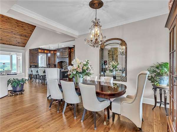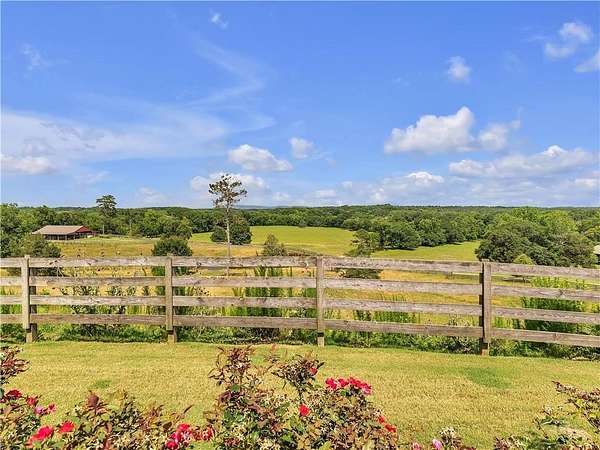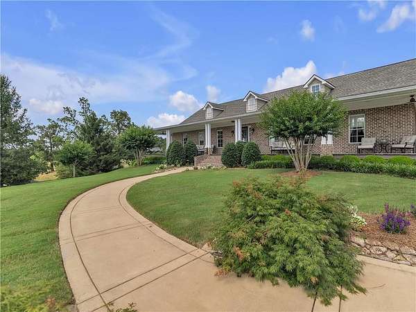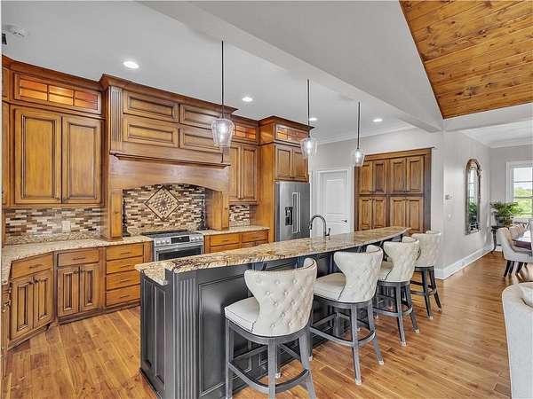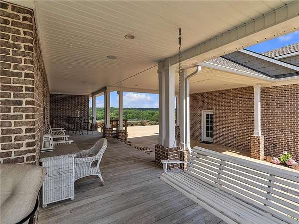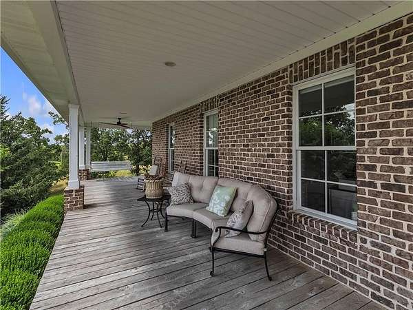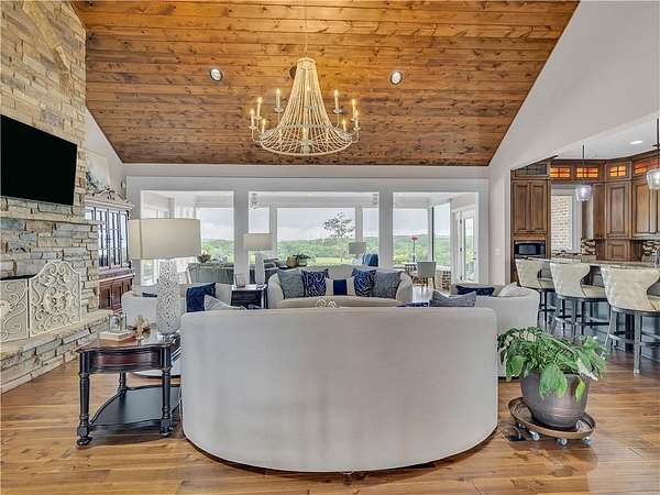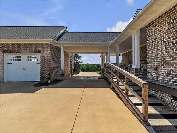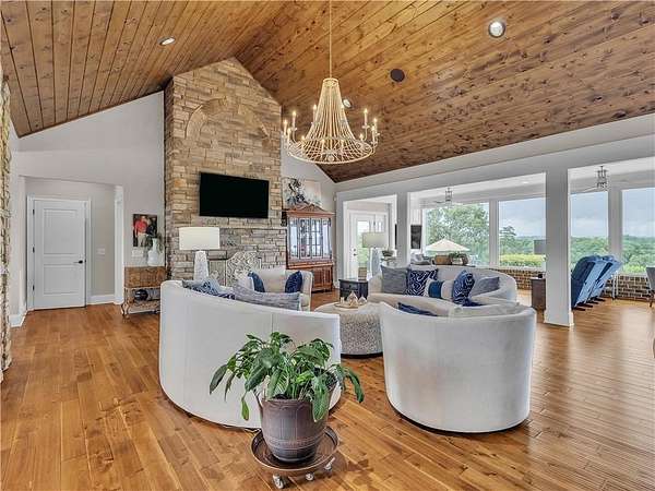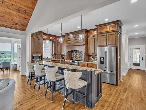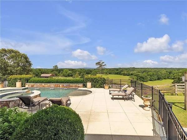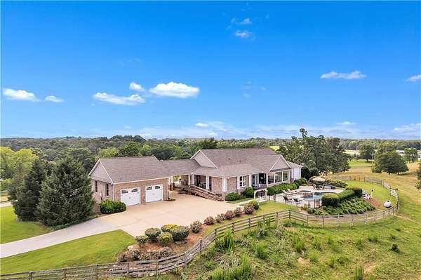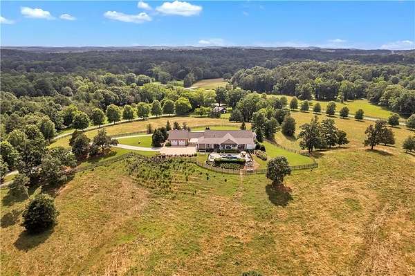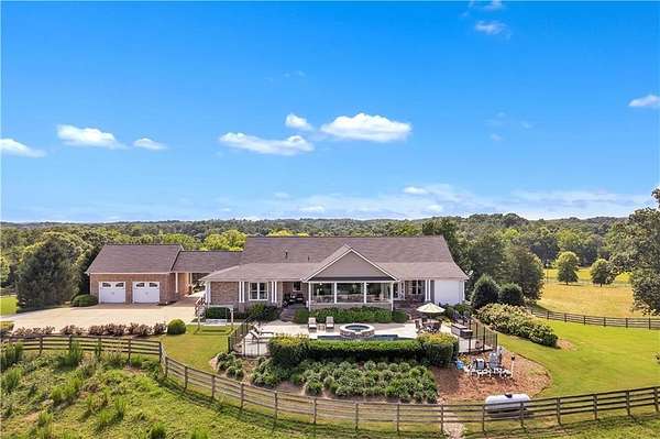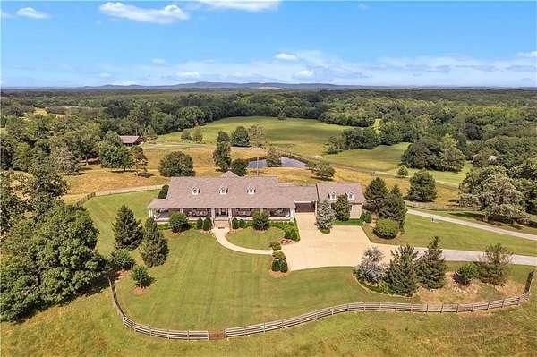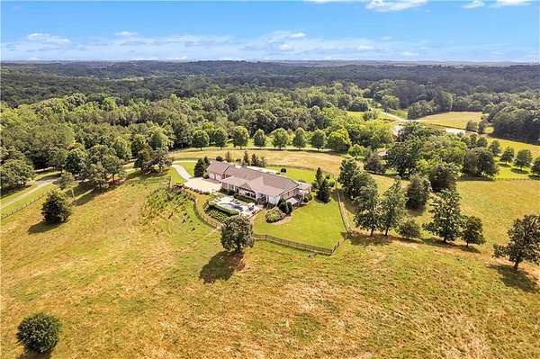 STEP INTO TIMELESS ELEGANCE! This impressive property features a stately front elevation and a beautifully manicured lawn, setting the tone for what's inside. A welcoming brick front porch with traditional columns and cozy sitting areas invites guests in. This custom-built home offers refined finishes, expansive living spaces, and stunning views from every angle. The main level boasts a light-filled open floor plan with warm hardwood floors, soaring wood-planked ceilings, and a grand stone fireplace anchoring the spacious living room. A dramatic chandelier and full-height windows frame sweeping landscape views, blending indoor luxury with outdoor beauty. The sunroom is a serene retreat that perfectly frames the rolling countryside through expansive picture windows, bringing in natural light and stunning views. Designed for comfort and relaxation, it features wood flooring, neutral walls, and ample space for multiple sitting areas. Whether you're enjoying a quiet morning coffee or gathering with guests, this bright and inviting space provides a seamless connection to the outdoors while maintaining year-round comfort. The gourmet kitchen is a chef's dream, featuring richly stained custom cabinetry, granite countertops, a striking tile backsplash, stainless steel appliances, and a large island with bar seating-ideal for both cooking and entertaining. An elegant formal dining room and adjacent sitting area create an inviting setting for gatherings. The oversized primary suite offers a serene retreat with vaulted wood ceilings, private access to the patio, and a spa-inspired ensuite bath. Here you'll find dual vanities with granite countertops, a built-in makeup station, a soaking tub, and a walk-through tile shower with multiple showerheads and a bench. Ample storage, custom built-ins, and designer touches complete the space. Additional guest rooms on the main floor are spacious and thoughtfully appointed, and the guest bathroom is beautifully updated with stylish cabinetry and tile finishes. Also enjoy the ease of electric shades on most of the main floor windows. The finished basement level expands your living and entertaining options with a partial kitchen, large recreation area, media space, game area, private guest suite, and a full bath-perfect for multi-generational living or hosting guests. In the backyard, a luxurious gunite in-ground pool with a raised spa and waterfall feature provides the perfect spot to relax and entertain, all set against panoramic countryside views. The beautifully manicured landscaping and fenced pastures enhance the serene setting, while multiple seating areas and walk-out basement patio add to the home's functionality and flow.. The spacious driveway includes a breezeway that connects to a detached two-car garage offering even more convenience. Additional parking space in the back ensures plenty of room for guests or multiple vehicles. Tucked away in a peaceful setting just minutes from town, this exceptional property offers the perfect blend of privacy and convenience.