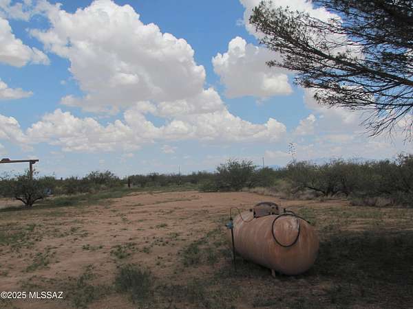 Near the foothills of the Dragoon Mountains! This custom-built 2BR/2Ba stucco home is on 10 fenced acres. Custom doors and cabinets throughout. Both BR have a bathroom, walk-in closet and door onto screened side patio. Open floor plan with exposed beam construction. Dining area has built-in hutch; kitchen has built-in rack for glassware above island/breakfast bar & pantry. Door leading from dining room outside toward carport. Laundry room next to kitchen has W/D, shelving and a window. Front patio, outside LR, is also screened. Outdoor fireplace & covered outdoor spot for BBQ. Hot tub just off the side patio (sold as-is). Large 20x30 metal shed; additional shed holds pressure tank for 3000 gal tank holding hauled water. Covered RV parking w/full hook-up. Located 4 miles from Sunsites.