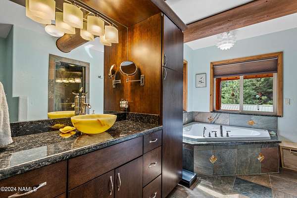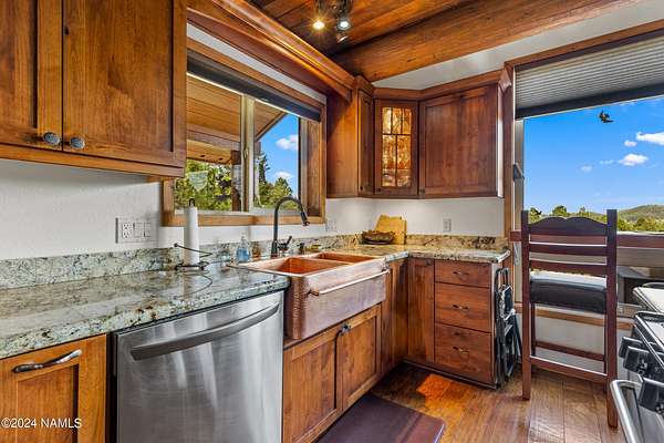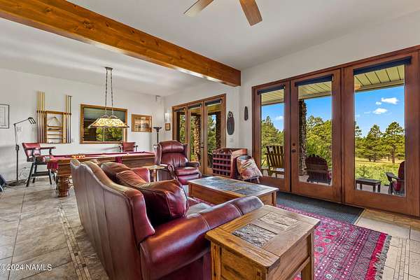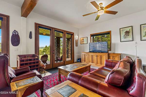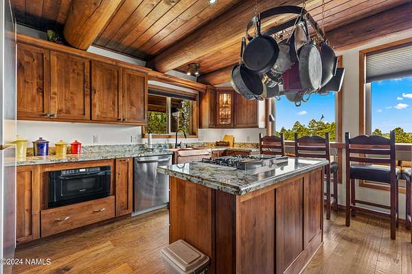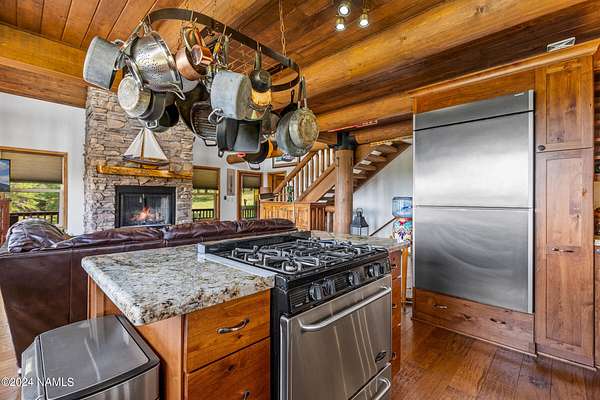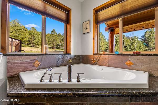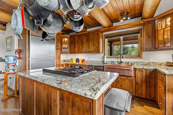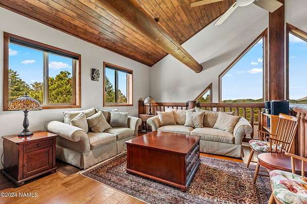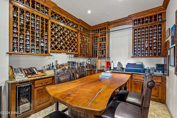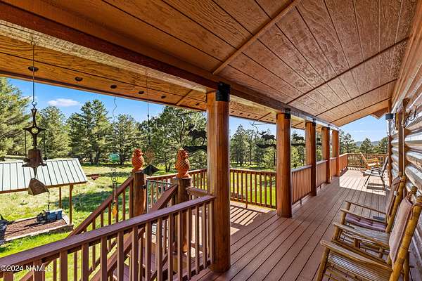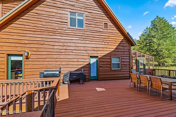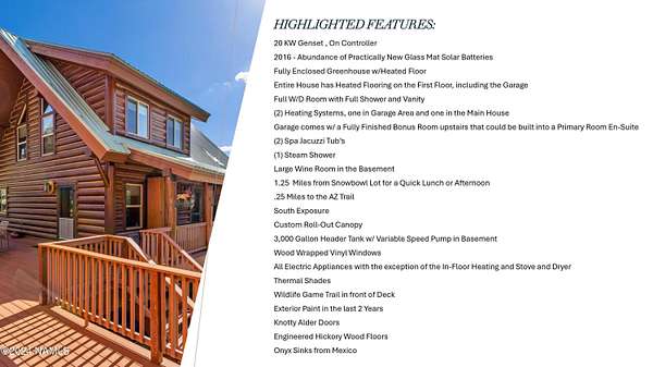 Step into your dream retreat--where the trail begins at your back door and luxury meets the treetops. Just 1.25 miles from Arizona Snowbowl and bordered by national forest, this custom log home is perfect for skiers, hikers, and lovers of mountain air. Rich hickory floors, a chef's kitchen, a wine room, and a wraparound deck make it ideal for hosting or relaxing after a day outdoors. Whether it's sunrise yoga on the deck or stargazing after a snowfall, this home delivers elevated Flagstaff living. NEED INSURANCE? Got you covered. Call agent for details. Insurer will write a new policy, buyer to verify. The open concept living area also features a custom stone grand fireplace, perfect for cozy gatherings on cooler evenings or snowy days and a basement with a separate wine room for the best of entertaining! For those seeking adventure, the National Forest beckons just beyond your doorstep, offering endless opportunities for hiking, biking, and wildlife watching from your expansive wraparound deck, which overlooks an active wildlife game trail. Just .25 miles from the Arizona Trail and only 1.25 Miles to the Snowbowl Lot, escape the ordinary and experience the magic of mountain living in this one-of-a-kind cabin in the woods - where every moment is infused with a sense of wonder and delight.