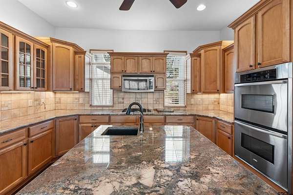 Nestled inside the gated Ridge Creek Place community, this 4-bedroom, 2.5-bath home with a 2-car garage sits high above South Tyler and delivers big views and even bigger lifestyle. Perfectly located just minutes from shopping, dining, and everything you need, you get the best of both worlds, privacy, space, and convenience, all on a rare 2.27 acres inside the city. The elevated setting is what really sets this property apart. The back patio and balcony take full advantage of the ridge line, creating sweeping hilltop views over Hollytree Golf Course, and on the 4th of July, you've got front-row seats to fireworks without ever leaving home. The backyard is built for living and entertaining. A recently added swimming pool anchors the space, with plenty of room left over for kids, pets, gardens, or future plans. It's the kind of outdoor setup that feels like a private retreat while still being minutes from town. Inside, the home is bright, open, and thoughtfully laid out. The upgraded kitchen features granite countertops, quality appliances, a large island, and a breakfast bar, ideal for everyday living or hosting a crowd. The formal living and dining areas are flooded with natural light and framed by those incredible views, making them just as inviting as they are impressive. A bonus room adds flexibility as a home office, playroom, or media space. The primary suite sits privately at the back of the home, offering beautiful scenery, a spacious bath, and a generous walk-in closet. The additional bedrooms are well-sized with high ceilings, keeping everything light and airy throughout. Practical touches matter too, the laundry room is conveniently located between the main living space and the extended three-car garage, making daily life just a little easier. Acreage, gated privacy, elevated views, a pool, and a prime South Tyler location, this is one of those properties that doesn't come around often, schedule your showing today!