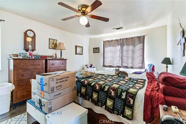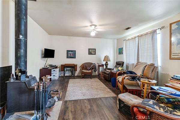 The property features a single-level home of approximately 1,724± square feet, offering four bedrooms and two bathrooms, built in 1995. Designed for both comfort and efficiency, the home includes an owned solar system that can reduce annual power costs to near zero. In addition to traditional forced air heating and cooling, comfort is enhanced with a whole house fan, ceiling fans, and a cozy wood stove in the living room. The open-concept kitchen features a large island and double doors that lead directly to the backyard, making indoor-outdoor living easy and functional.