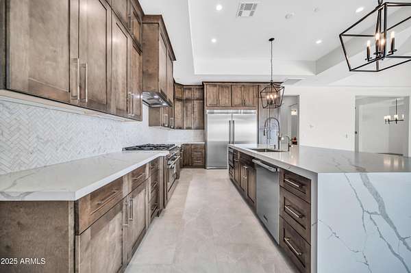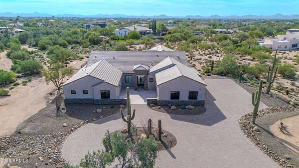 Stunning new luxury estate on 2+ acres with a private guest casita and no HOA. This custom 4 bed, 3.5 bath home features a refined split floorplan, soaring ceilings, designer lighting, and a multi-panel sliding glass wall opening to a resort-style backyard. The chef's kitchen offers custom cabinetry, premium appliances, oversized island, and a butler's pantry. The primary suite includes a sitting area, spa bath with walk-in wet room with shower, freestanding tub, and large custom closet. Outdoors enjoy a sparkling pool, water feature, travertine patios, and covered living. Epoxy 4-car garage with room to add an RV garage or toy barn. Casita includes 1 bed, 1 bath, living area, and kitchenette. Surrounded by saguaros and mountain views.