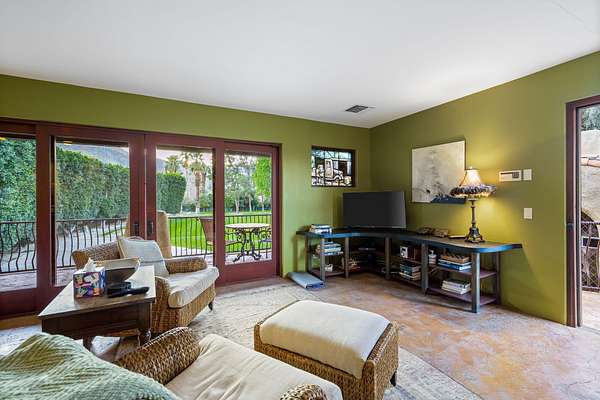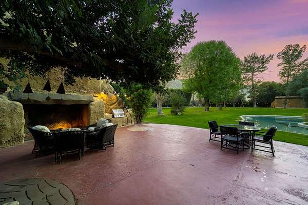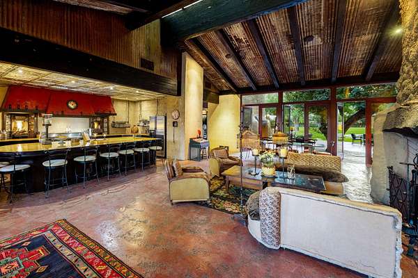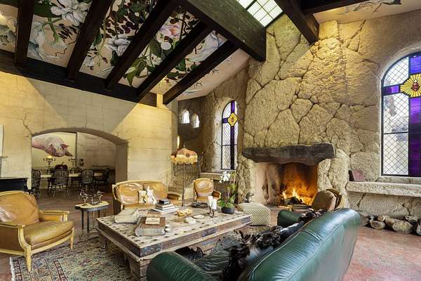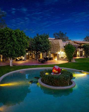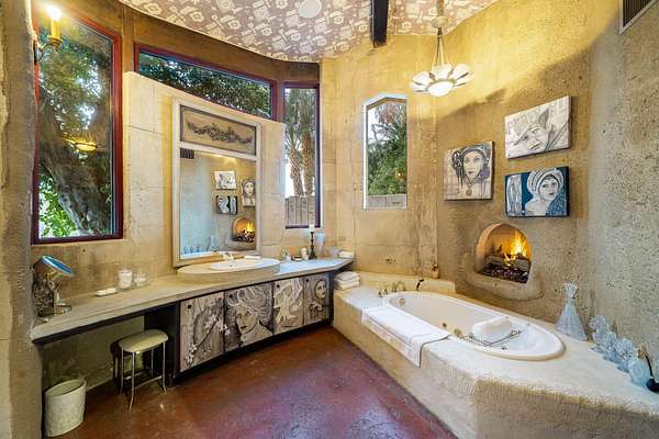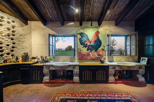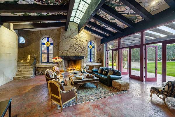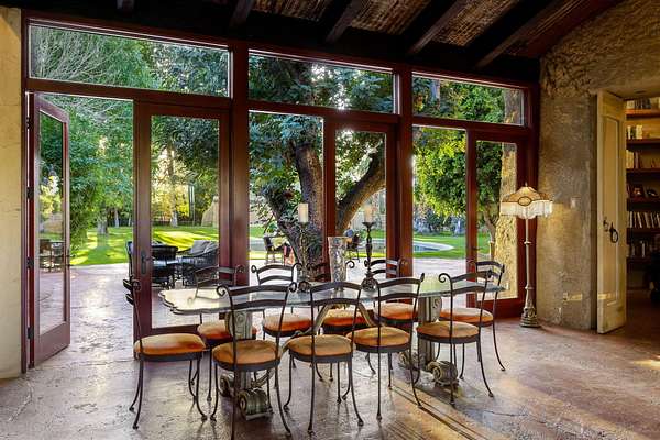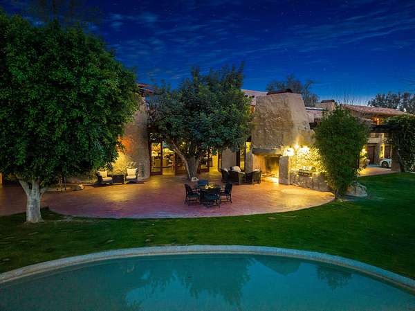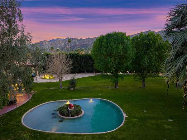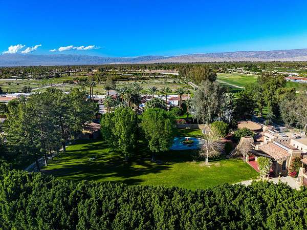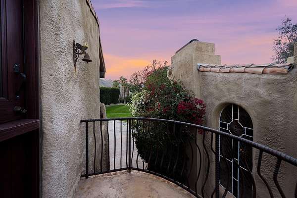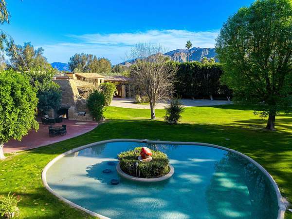 Welcome to The Adobe Hacienda, a private 1.5-acre gated estate in the heart of Rancho Mirage, offering unmatched character, artistry, tranquility, and the rare potential to be configured as an intimate equestrian-style retreat. This expansive property also offers an appealing opportunity for the noncommercial keeping of horses, goats, and smaller livestock, subject to city and county regulations. Designed by renowned architect Jim McIntosh, this 8,990 sq ft custom-built compound features 2 spacious bedrooms, a library, a grand kitchen, multiple living areas, 2 dining areas, and 3.5 bathrooms in the main home. Three detached casitas/studios-each with its own living quarters-create ideal spaces for guests, artists, staff, or a private retreat. A massive tandem-style garage accommodating over six cars makes this a car lover's dream. Crafted with 2-foot-thick rammed-earth walls and floors stained with red wine pigment, the estate blends strength and sustainability with beauty. Imported details include stained glass from Amsterdam, hand-forged ironwork from London's Barclays Bank, and sinks and doors from England's Cotswolds. A powder room ceiling of peacock feathers and hand-painted details throughout adds whimsy and soul. Lush courtyards, romantic balconies, a saltwater lagoon-style pool, a bird aviary, and custom storybook-inspired garden walls invite outdoor living, all framed by panoramic mountain views.