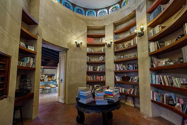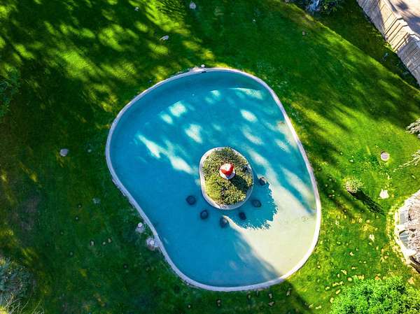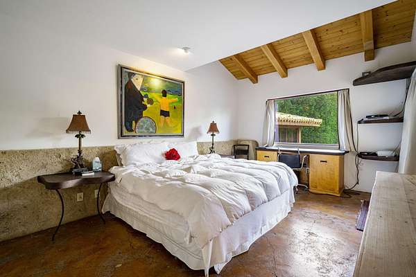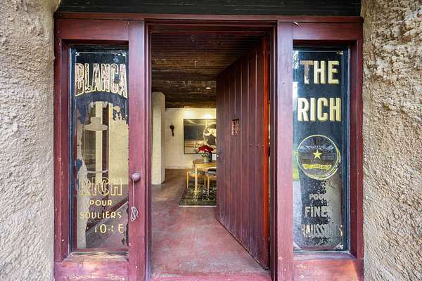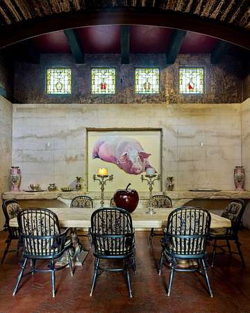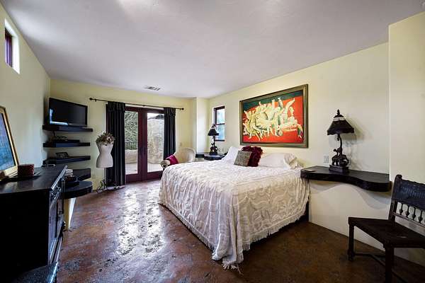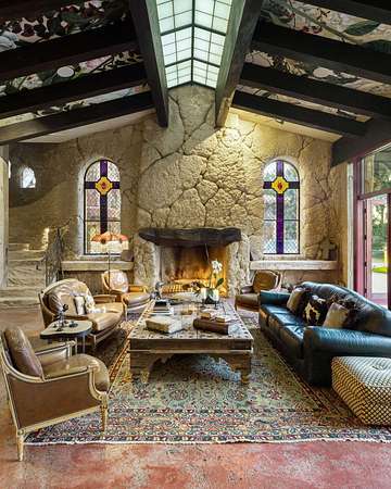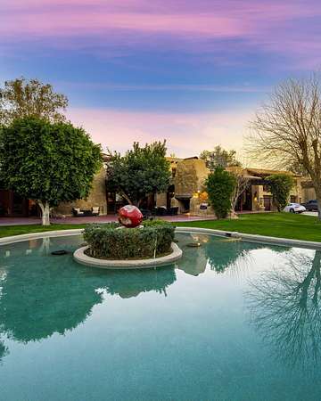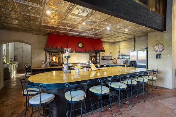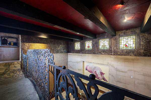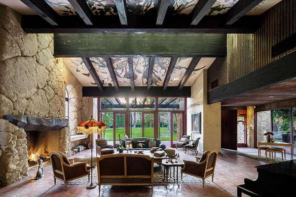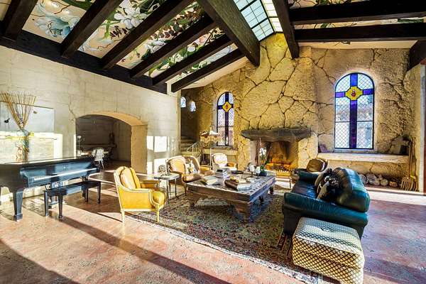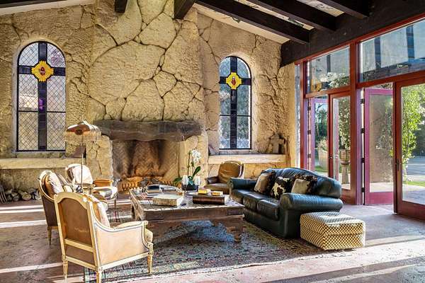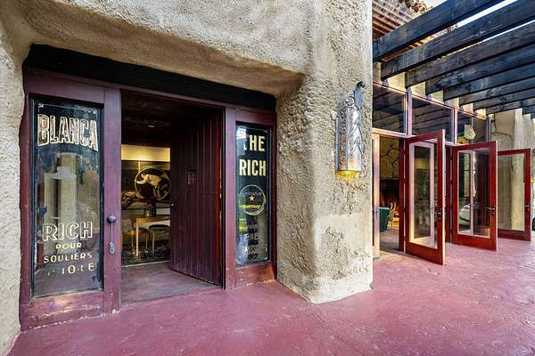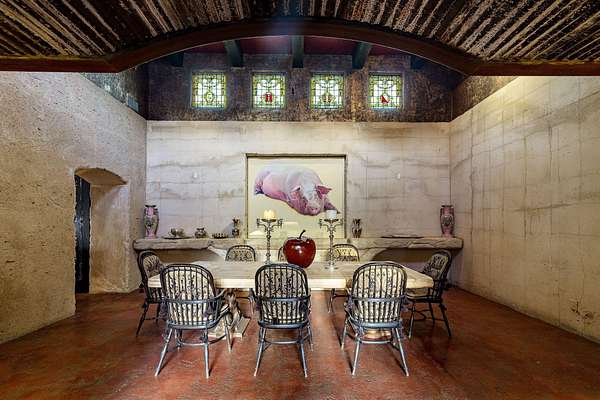 Welcome to The Adobe Hacienda, a private 1.5-acre gated estate in the heart of Rancho Mirage, offering unmatched character, artistry, tranquility, and the rare potential to be configured as an intimate equestrian-style retreat. This expansive property also offers an appealing opportunity for the noncommercial keeping of horses, goats, and smaller livestock, subject to city and county regulations. Designed by renowned architect Jim McIntosh, this 8,990 sq ft custom-built compound features 2 spacious bedrooms, a library, a grand kitchen, multiple living areas, 2 dining areas, and 3.5 bathrooms in the main home. Three detached casitas/studios-each with its own living quarters-create ideal spaces for guests, artists, staff, or a private retreat. A massive tandem-style garage accommodating over six cars makes this a car lover's dream. Crafted with 2-foot-thick rammed-earth walls and floors stained with red wine pigment, the estate blends strength and sustainability with beauty. Imported details include stained glass from Amsterdam, hand-forged ironwork from London's Barclays Bank, and sinks and doors from England's Cotswolds. A powder room ceiling of peacock feathers and hand-painted details throughout adds whimsy and soul. Lush courtyards, romantic balconies, a saltwater lagoon-style pool, a bird aviary, and custom storybook-inspired garden walls invite outdoor living, all framed by panoramic mountain views.