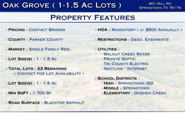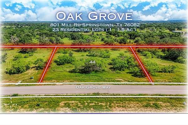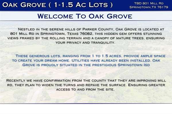These generous lots, ranging from 1 to 1.5 acres, provide ample space to create your dream home. Utilities have already been installed. Oak Grove is proudly situated in the Springtown Independent School District, making it an ideal place for families.