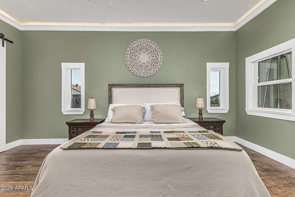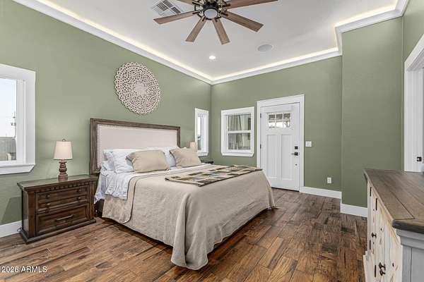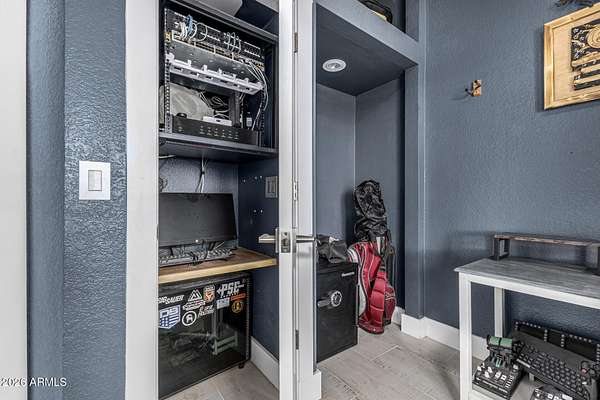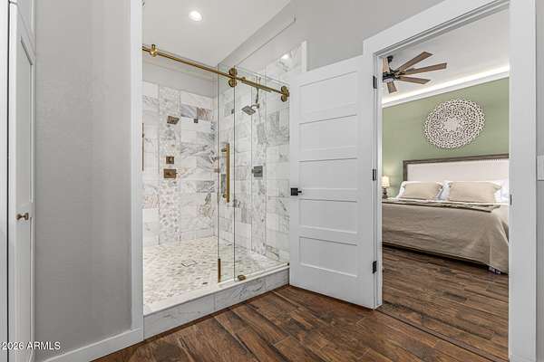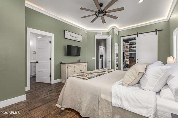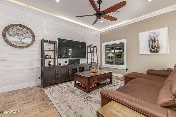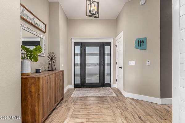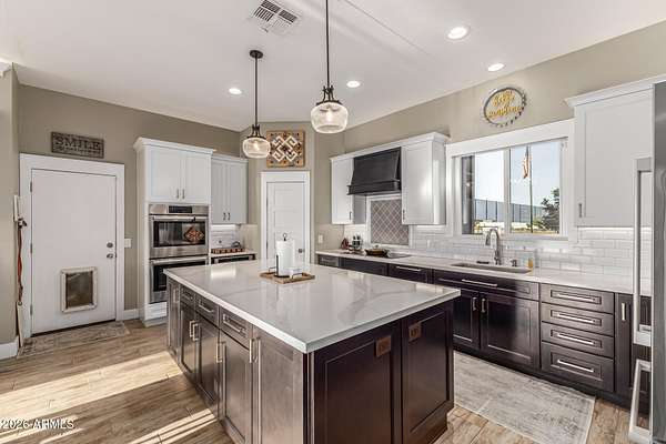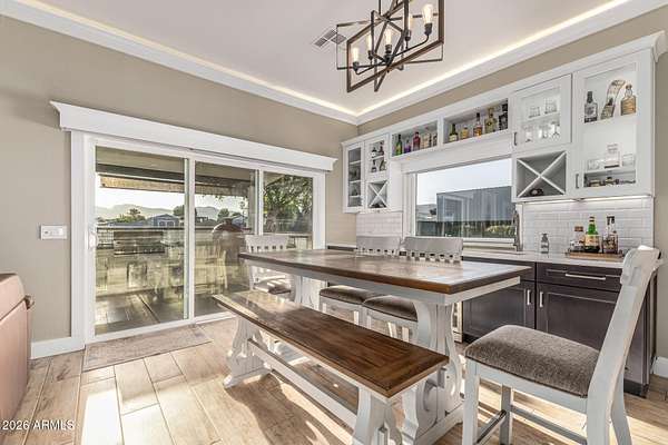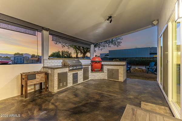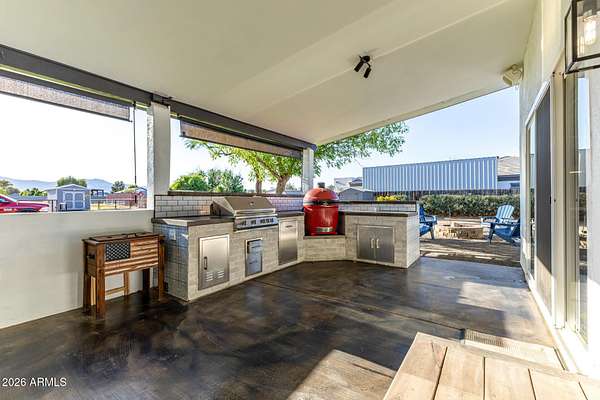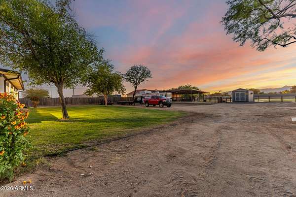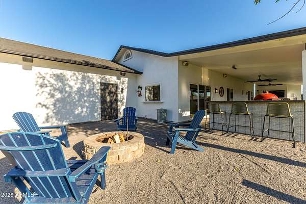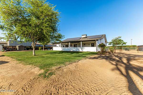 Stunning Fully Renovated Horse Property! Welcome to this beautifully updated 3-bedroom, 2-bathroom home situated on approximately 2 irrigated acres in Waddell. Perfect for equestrian enthusiasts or those seeking peaceful country living with modern luxury, this turn-key property offers all the updates and endless outdoor enjoyment. Step inside the completely renovated interior featuring tile flooring throughout, soaring ceilings, and an open, light-filled layout. The gourmet kitchen is a chef's dream with an oversized Quartz island, high-end appliances including an induction cooktop, premium cabinetry with Rev-a-Shelf organizers, and a convenient KitchenAid drawer. High end wet-bar with a wine and beverage center just off the kitchen with a pass-through window makes this space special. The primary suite is a true retreat, with a huge, customized walk-in closet, a luxurious bathroom with a marble wet room shower and a unique Hot Tools drawer. Two additional bedrooms provide flexibility for family, guests, or use as a home office. Other notable interior upgrades include new windows, crown molding, led accent lighting and network wiring throughout the home, walk-in pantry, soft close cabinets and electric roller shades on the windows. Outdoor living shines here! Relax and entertain under your covered patio with outdoor speakers, built in electric fireplace and flat screen tv. The outdoor kitchen features a built-in BBQ and space for a smoker. The backyard landscape includes a gas fire-pit, grass, and shade trees. Enjoy the newly landscaped front yard with low maintenance shrubs and thoughtful landscape lighting. The expansive grounds in back feature an irrigated pasture complete with a trotting track and a 4-stall pole barn. Three 12x24 stalls, one serving as a hay stall with double gates to easily back in a trailer. The 4th stall is oversized 24'x50'. Additional equestrian amenities include an air-conditioned tack shed, hitching rail, automatic waterers, outdoor fans for year-round comfort and a chicken coop. Fully paid solar panels ensure low utility costs and energy efficiency. The front gated entry has a convenient circular driveway with plenty of room up front to park your guest's vehicles, trailers, tractors, RV's and more. Mountain views, ample parking and useful shelving in the garage plus plenty of room to roam make this a rare find in the Phoenix West Valley.
