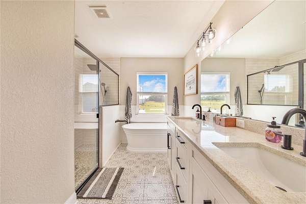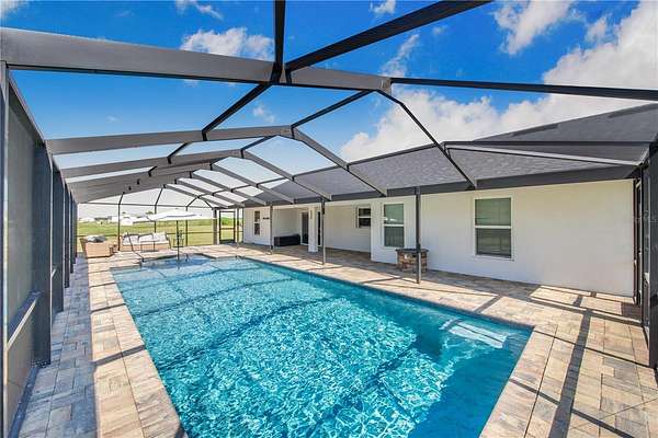 Enjoy an enclosed saltwater pool with tanning ledge, screened hot tub house, and brick paver deck. Inside, the split floor plan features 9'6" ceilings, LVP flooring, a gas fireplace, and a gourmet kitchen with granite countertops, farmhouse sink, stainless appliances, gas stove, and pot filler. Tankless hot water heater and is pre-wired for a whole house generator. The master suite boasts a walk-in closet, standalone tub, and walk-in shower. Perfect for livestock or a private retreat, this property blends luxury, functionality, and country charm.