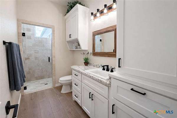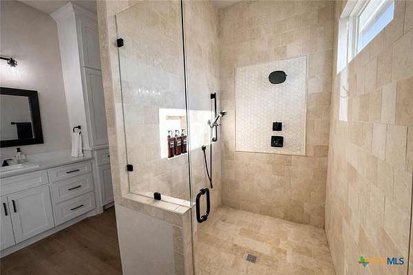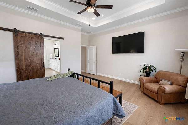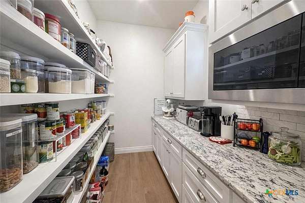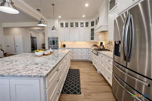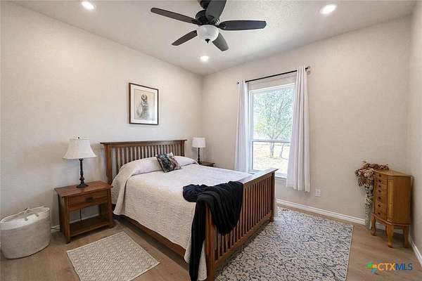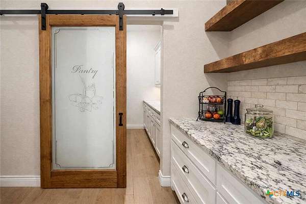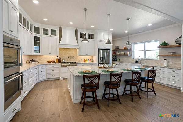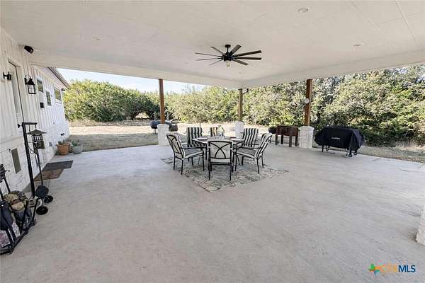 Private custom home on approximately 11 ag-exempt acres with sweeping Hill Country views, exceptional privacy, and high-end construction throughout. Thoughtfully engineered and beautifully finished, this property offers modern systems, quality craftsmanship, and usable land in a peaceful setting. The home features 10-foot ceilings and wood-look tile flooring throughout. All rooms are generously sized with walk-in closets, and a flexible office space can easily convert into a fourth bedroom. The chef's kitchen includes premium Thermador appliances with double convection ovens, cooktop, dishwasher, exterior-vented hood, pot filler, custom cabinetry with hidden island storage, limestone backsplash, and a spacious dining area ideal for entertaining. The living area is centered around a fireplace with gas starter, birch wood beam and mantle, and a 7.1 surround-sound system. A dedicated media and network closet supports hard-wired connections in every room, including the office. The primary suite offers a walk-in travertine tile shower, quartz countertops in the bath and closet, built-in hampers, charging outlets, and dedicated ventilation. Granite countertops are featured throughout the rest of the home, with crown molding in main living areas. Construction highlights include spray-foam insulation in all walls and attic, two tankless water heaters, an approximately 800-foot well with a complete soft-water system, aerobic septic, underground electric, lightning surge protection on all panels, gutters, and a Lennox HVAC system. Outdoor features include a 30x30 covered patio designed to capture country views, mature oak trees, extensive cedar clearing, a 65x50 workshop with exhaust fans, wired for welder and compressor (100 amp, 220V) and keyless entry, and a chicken coop. A rare opportunity for buyers seeking privacy, views, and quality infrastructure on acreage.
