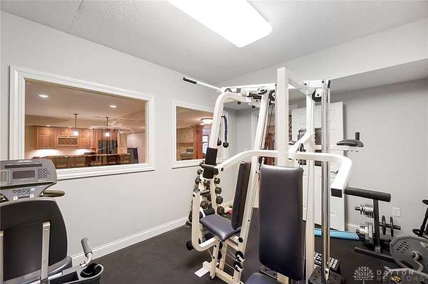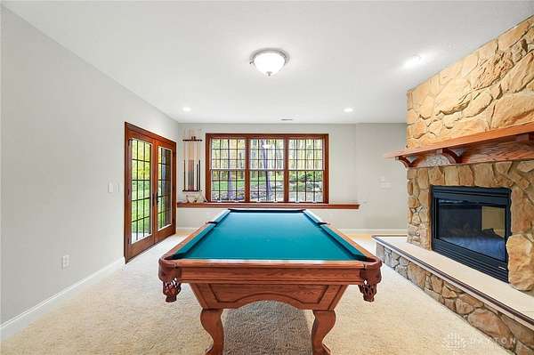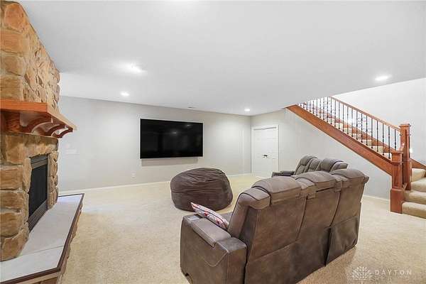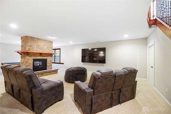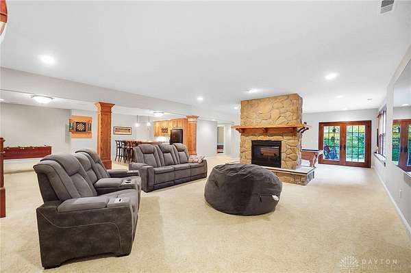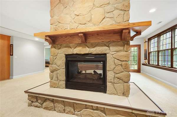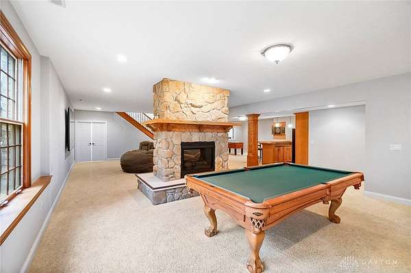 The open staircase leads to a fully finished lower level, designed for recreation and comfort. This space features a second full kitchen, a large family room, a game room, and a two-sided fireplace that adds warmth and charm. Two additional bedrooms with full-size windows, a full bath, an exercise room with padded flooring, and a massive unfinished storage area round out the lower level.