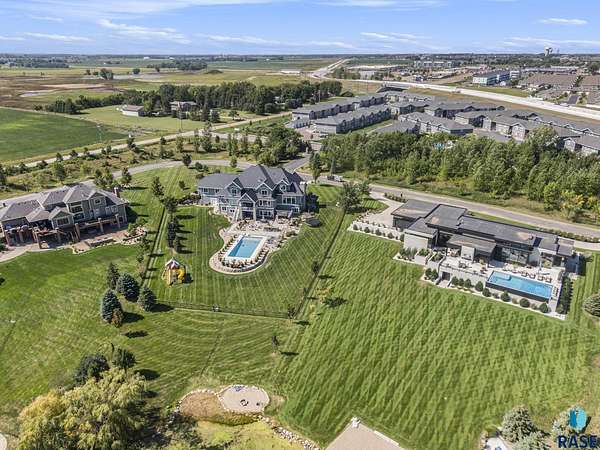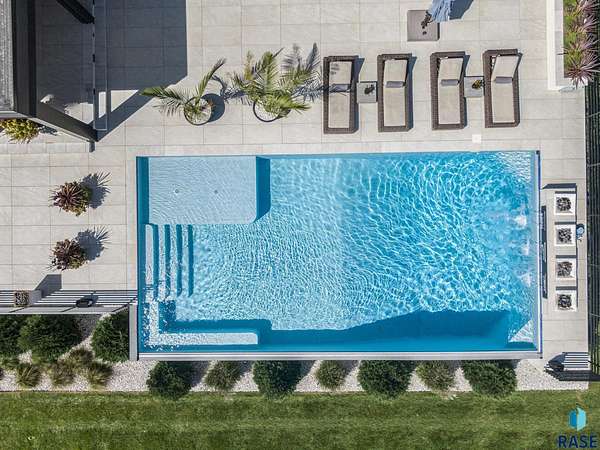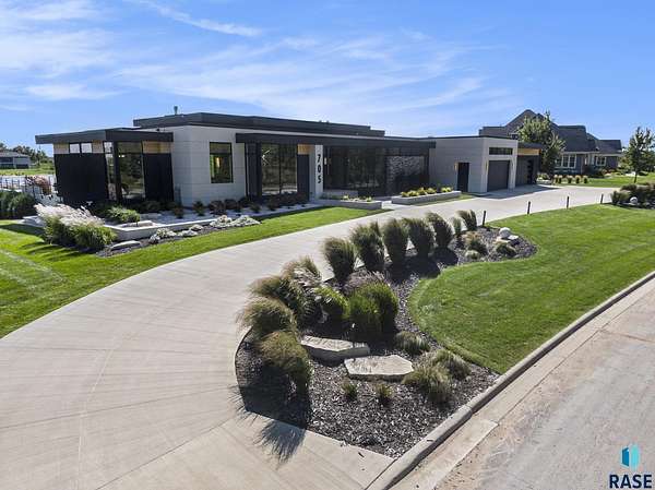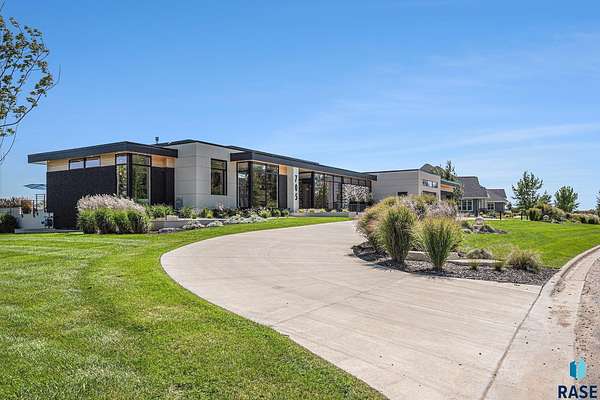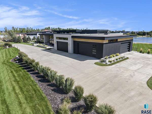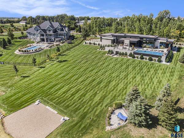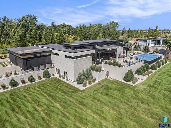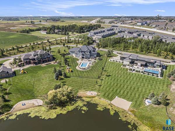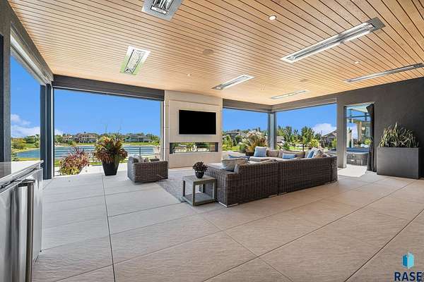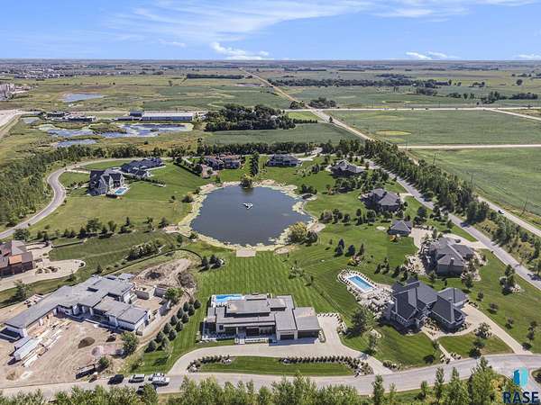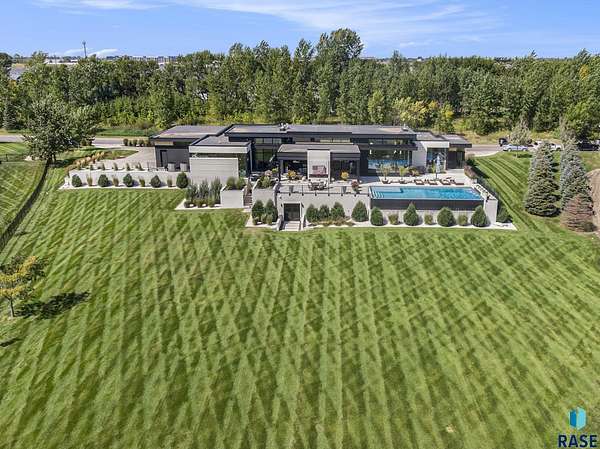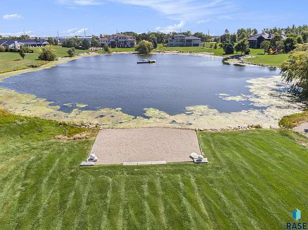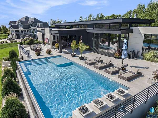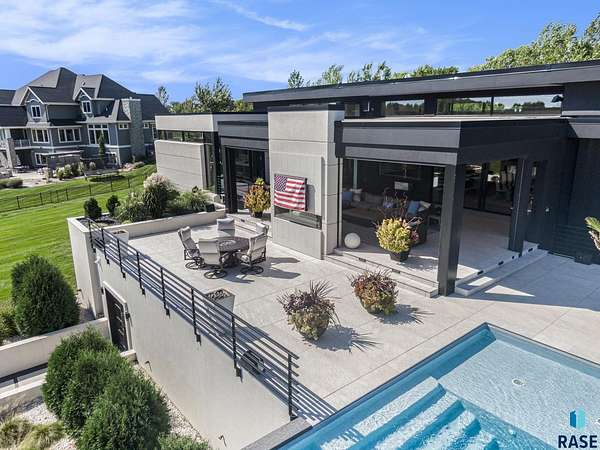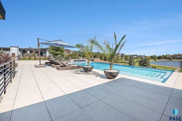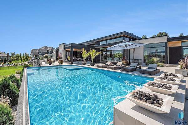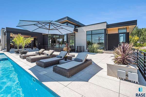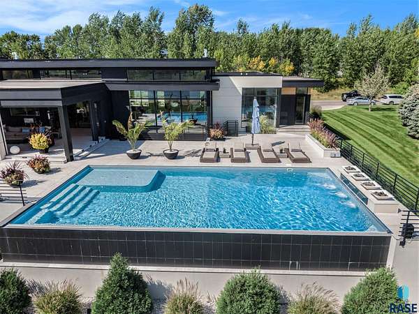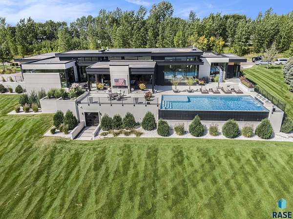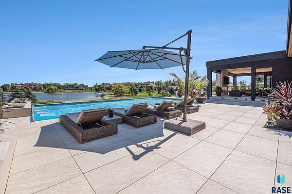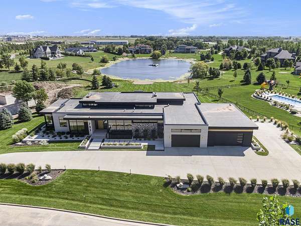 Come enjoy luxurious living in this rambling 1.6 acre waterfront lot on Silver Pond, the desirable gated development hidden in a resort style in neighborhood in Southern Sioux Falls! Single-story living offers practical elegance in this Executive Ranch home odorned with a resort style pool complete fire bowls, water features and private sundeck with room to lounge! Superior location for shopping and close to Harrisburg Freshman Academy and bordering a private stocked fishing pond. Enjoy spectacular views of Silver Pond and the swimming pool. Step from the 8 foot tall front entrance doorinto an interior embrace that includes an impressive entryway, an open layout, window light complemented by stylish remote control blinds, neutral decor, notable ceiling styles (including tray, coffered, and beamed), and four gas fireplaces (living room, primary bedroom, basement, and covered outdoor kitchen). Delectable notions become fully baked realities in the elegant, spacious island chef's kitchen, with natural light, premium Thermador appliances including a built in Espresso machine, dekton counters with marble backsplash, and ample pantry space. The kitchen opens seamlessly onto the dining room, living room, patio, and backyard. The feature-rich Master bedroom includes a walk-in closet, a linen closet, mini bar with sink and ref, sitting space, and a private bath with a curbless shower and jetted whirlpool. The other three bedrooms, distributed on multi-levels for privacy, are unique, quiet, ensuite, and designed with plenty of closet space. Finished basement serves as a rec room, multi-purpose room, guest quarters, and home theater as well as a wine cellar, sauna and steam shower. Attached 6-car garage with epoxy floor, floor drain, separate workshop and stair entry to the lower level. The circular driveway means no backing up. Exterior includes a tiled, covered patio with it's own outdoor kitchen, ceiling heaters, automatic screening and gas fireplace to enjoy the views of the pond and the pool!