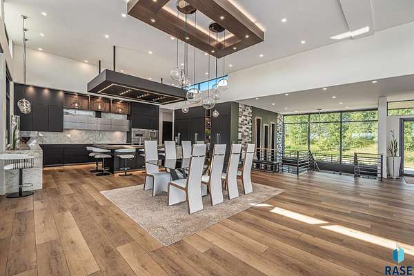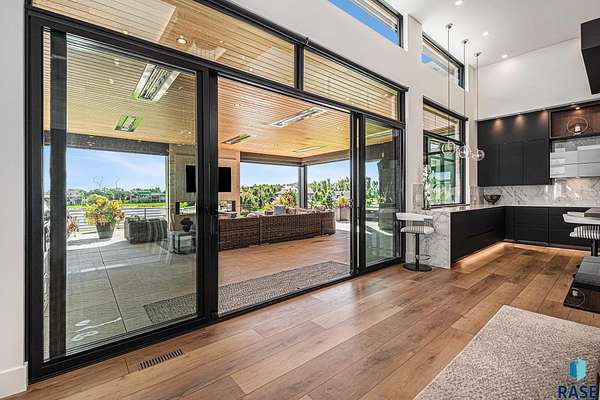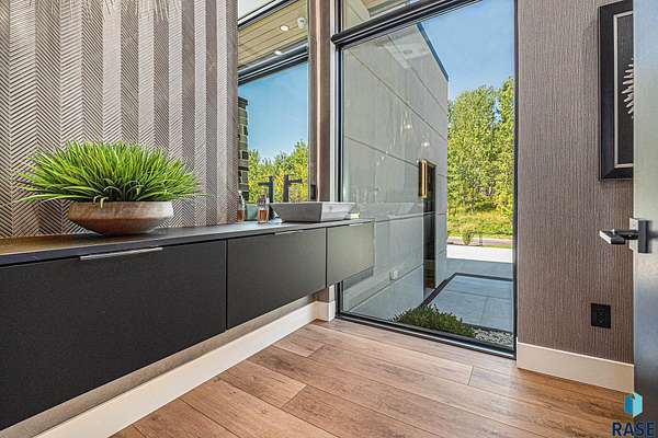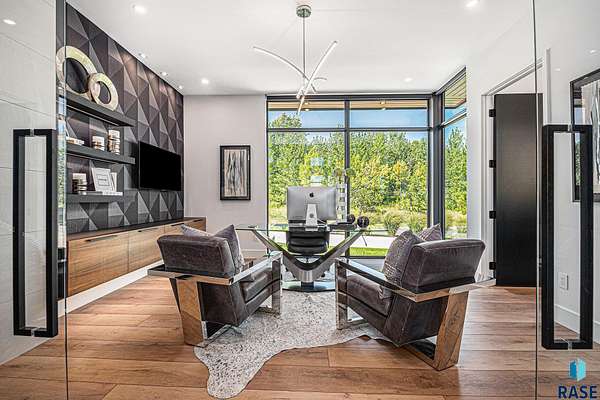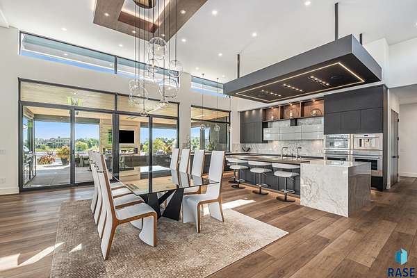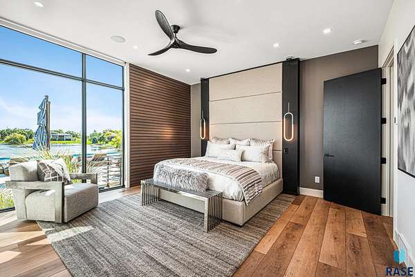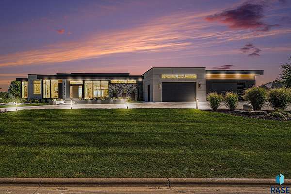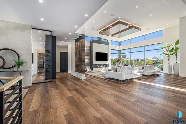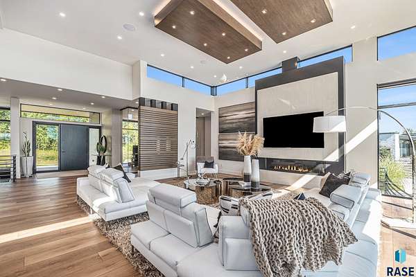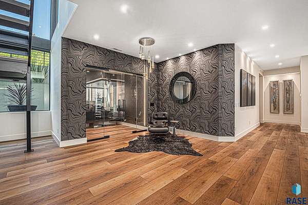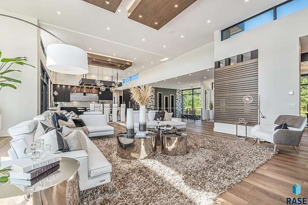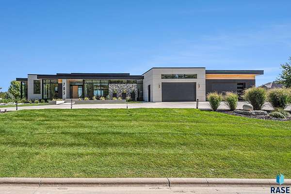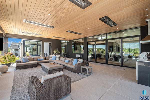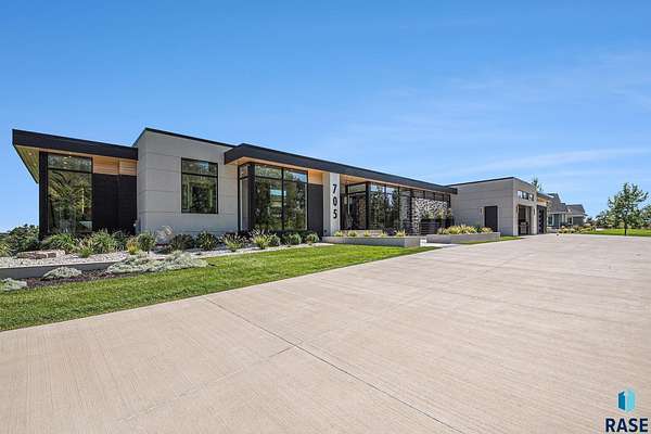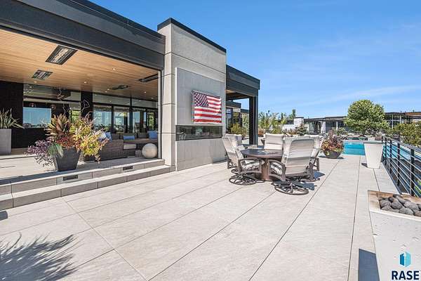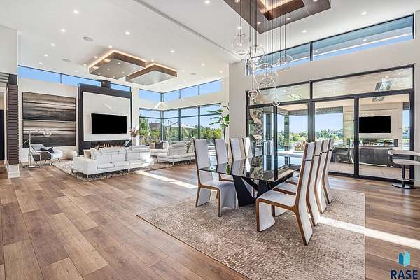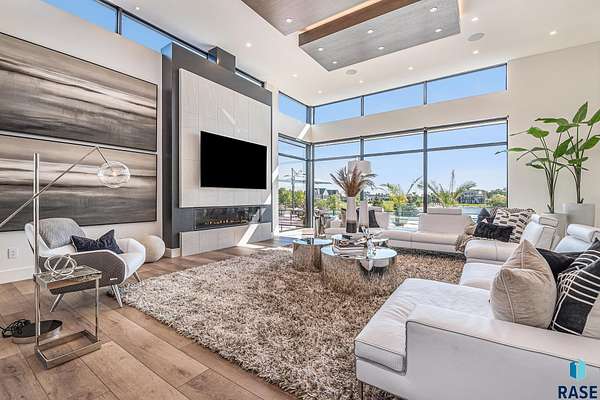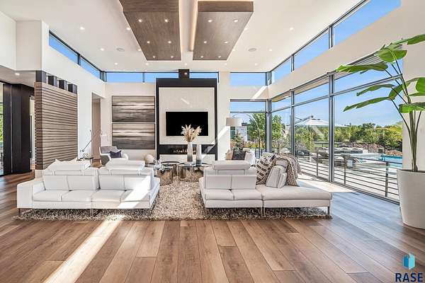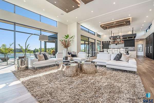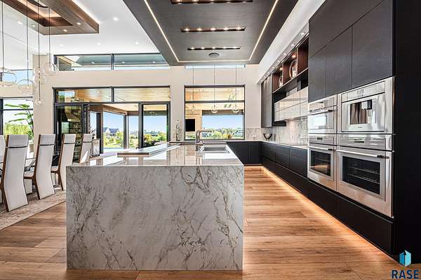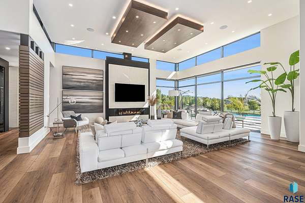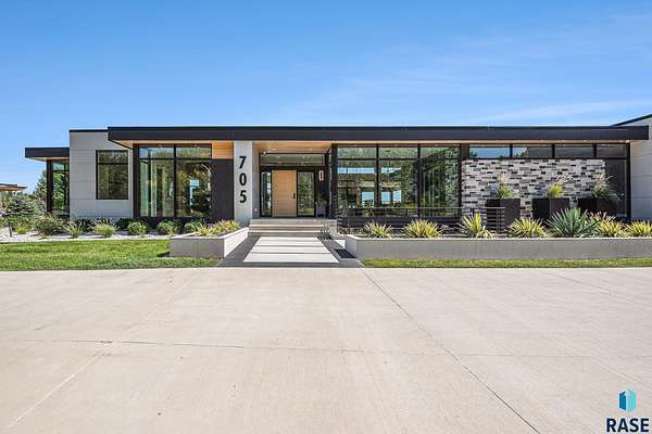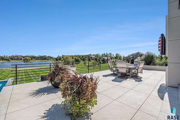 Come enjoy luxurious living in this rambling 1.6 acre waterfront lot on Silver Pond, the desirable gated development hidden in a resort style in neighborhood in Southern Sioux Falls! Single-story living offers practical elegance in this Executive Ranch home odorned with a resort style pool complete fire bowls, water features and private sundeck with room to lounge! Superior location for shopping and close to Harrisburg Freshman Academy and bordering a private stocked fishing pond. Enjoy spectacular views of Silver Pond and the swimming pool. Step from the 8 foot tall front entrance doorinto an interior embrace that includes an impressive entryway, an open layout, window light complemented by stylish remote control blinds, neutral decor, notable ceiling styles (including tray, coffered, and beamed), and four gas fireplaces (living room, primary bedroom, basement, and covered outdoor kitchen). Delectable notions become fully baked realities in the elegant, spacious island chef's kitchen, with natural light, premium Thermador appliances including a built in Espresso machine, dekton counters with marble backsplash, and ample pantry space. The kitchen opens seamlessly onto the dining room, living room, patio, and backyard. The feature-rich Master bedroom includes a walk-in closet, a linen closet, mini bar with sink and ref, sitting space, and a private bath with a curbless shower and jetted whirlpool. The other three bedrooms, distributed on multi-levels for privacy, are unique, quiet, ensuite, and designed with plenty of closet space. Finished basement serves as a rec room, multi-purpose room, guest quarters, and home theater as well as a wine cellar, sauna and steam shower. Attached 6-car garage with epoxy floor, floor drain, separate workshop and stair entry to the lower level. The circular driveway means no backing up. Exterior includes a tiled, covered patio with it's own outdoor kitchen, ceiling heaters, automatic screening and gas fireplace to enjoy the views of the pond and the pool!