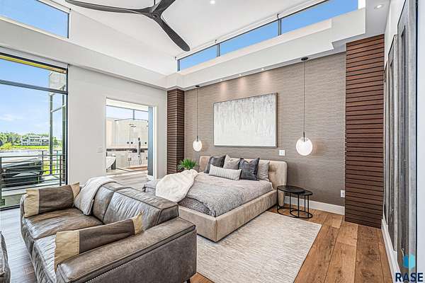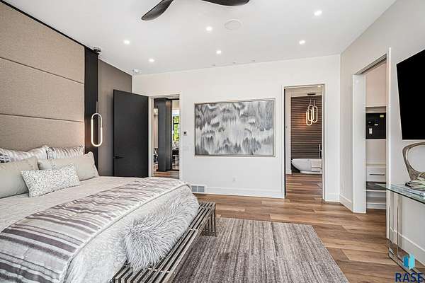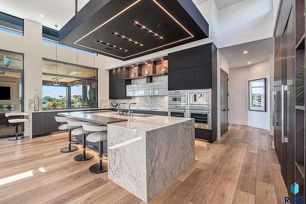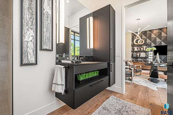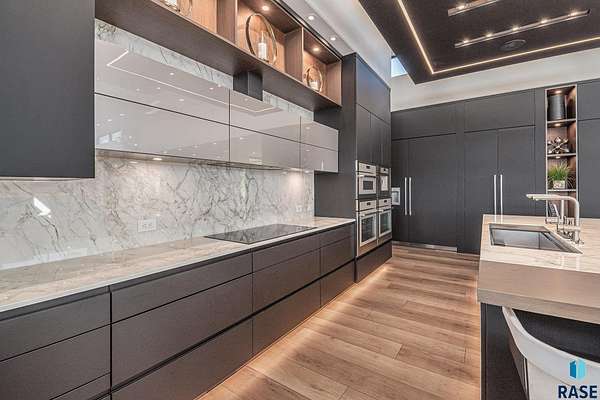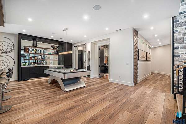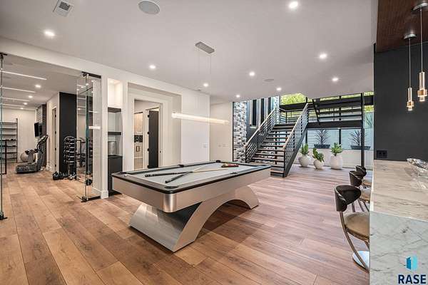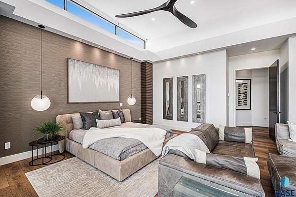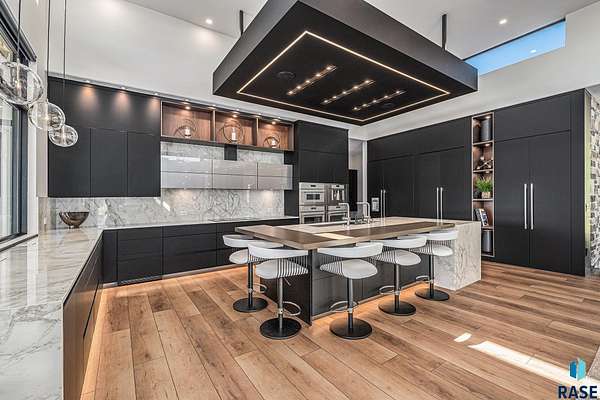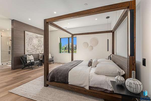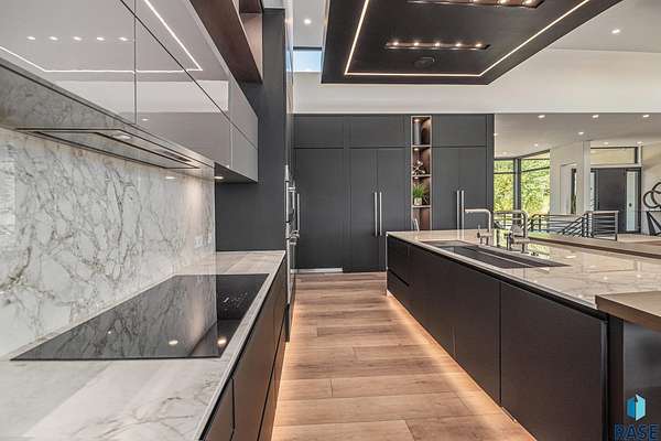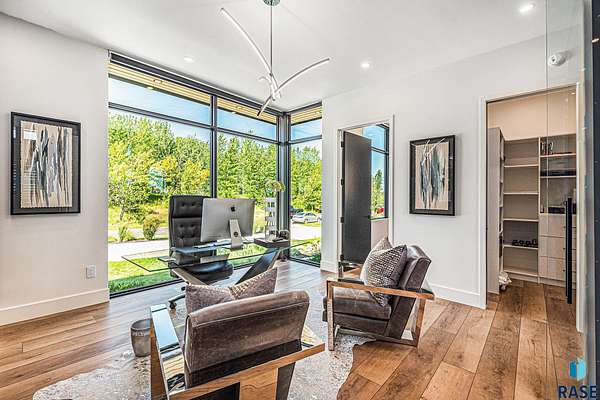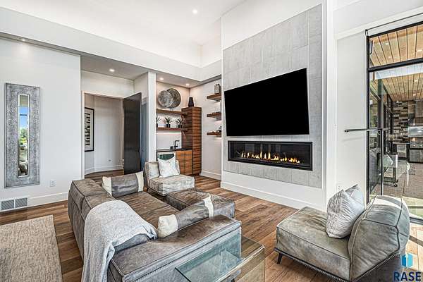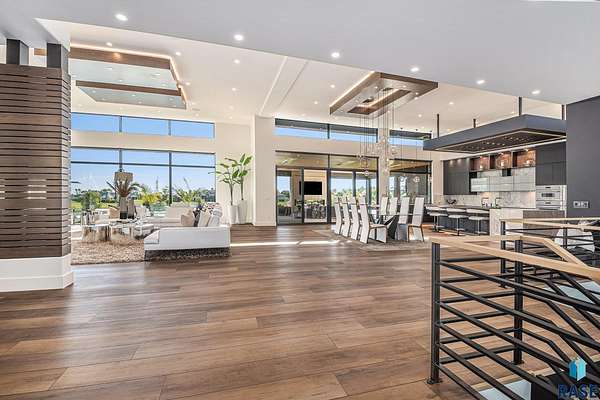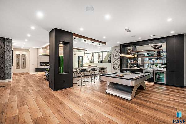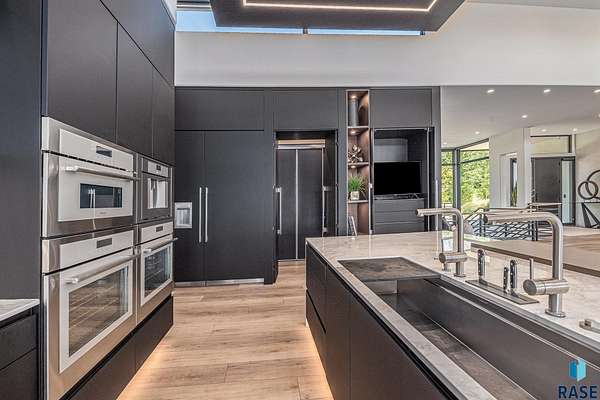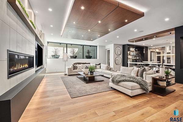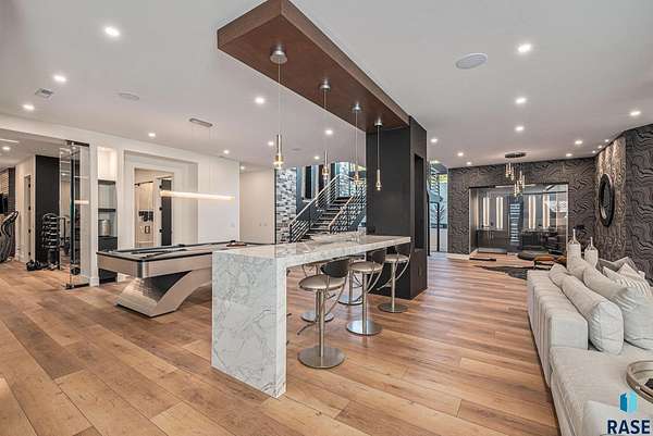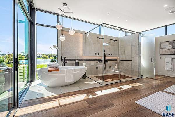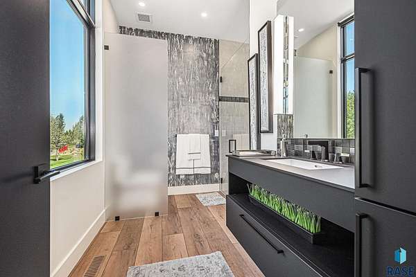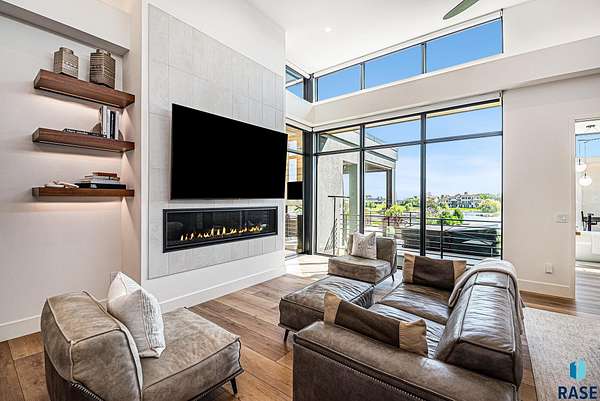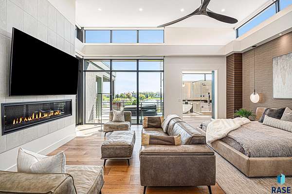 Come enjoy luxurious living in this rambling 1.6 acre waterfront lot on Silver Pond, the desirable gated development hidden in a resort style in neighborhood in Southern Sioux Falls! Single-story living offers practical elegance in this Executive Ranch home odorned with a resort style pool complete fire bowls, water features and private sundeck with room to lounge! Superior location for shopping and close to Harrisburg Freshman Academy and bordering a private stocked fishing pond. Enjoy spectacular views of Silver Pond and the swimming pool. Step from the 8 foot tall front entrance doorinto an interior embrace that includes an impressive entryway, an open layout, window light complemented by stylish remote control blinds, neutral decor, notable ceiling styles (including tray, coffered, and beamed), and four gas fireplaces (living room, primary bedroom, basement, and covered outdoor kitchen). Delectable notions become fully baked realities in the elegant, spacious island chef's kitchen, with natural light, premium Thermador appliances including a built in Espresso machine, dekton counters with marble backsplash, and ample pantry space. The kitchen opens seamlessly onto the dining room, living room, patio, and backyard. The feature-rich Master bedroom includes a walk-in closet, a linen closet, mini bar with sink and ref, sitting space, and a private bath with a curbless shower and jetted whirlpool. The other three bedrooms, distributed on multi-levels for privacy, are unique, quiet, ensuite, and designed with plenty of closet space. Finished basement serves as a rec room, multi-purpose room, guest quarters, and home theater as well as a wine cellar, sauna and steam shower. Attached 6-car garage with epoxy floor, floor drain, separate workshop and stair entry to the lower level. The circular driveway means no backing up. Exterior includes a tiled, covered patio with it's own outdoor kitchen, ceiling heaters, automatic screening and gas fireplace to enjoy the views of the pond and the pool!