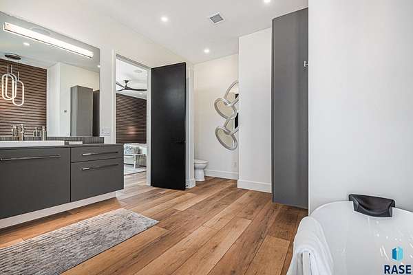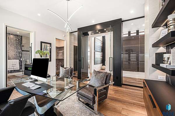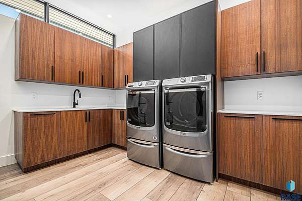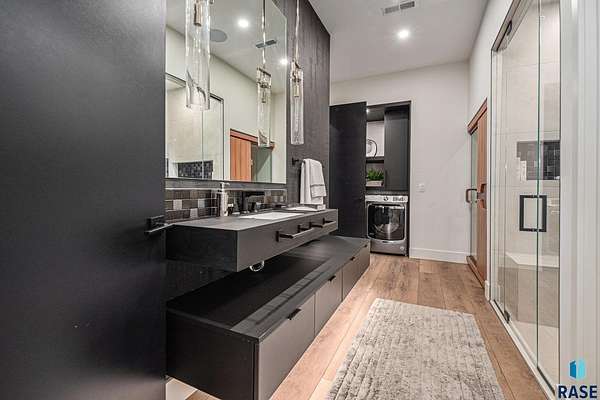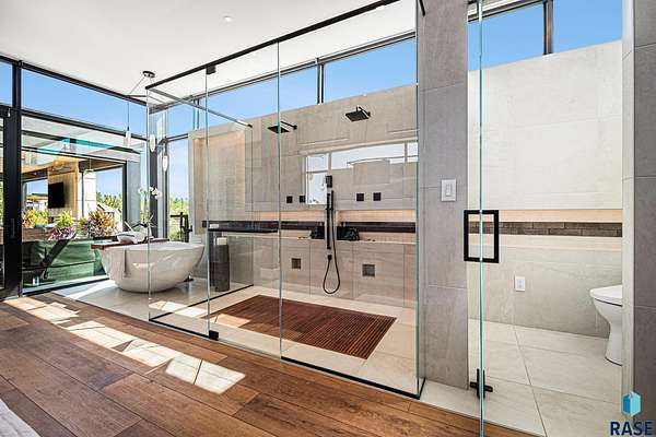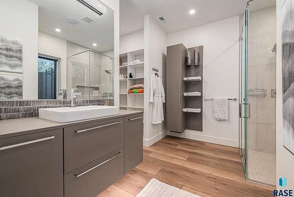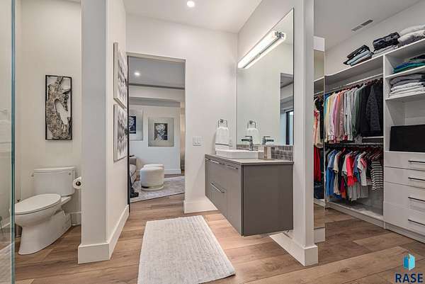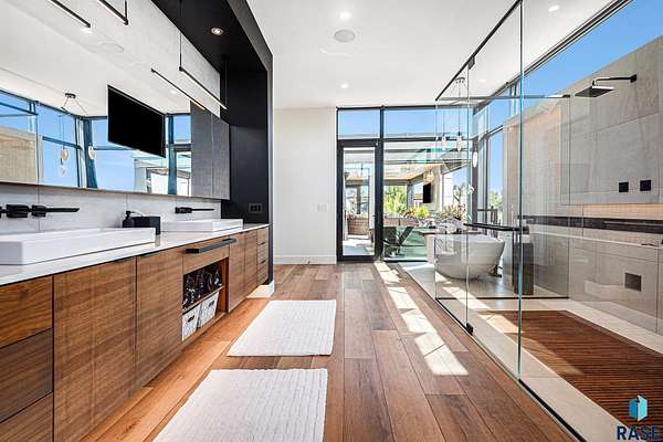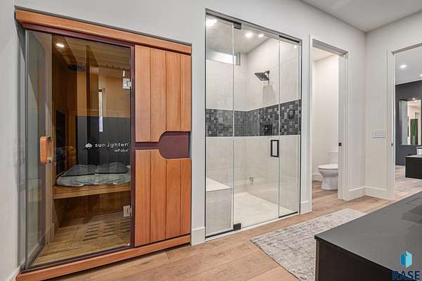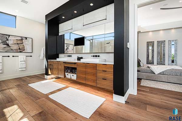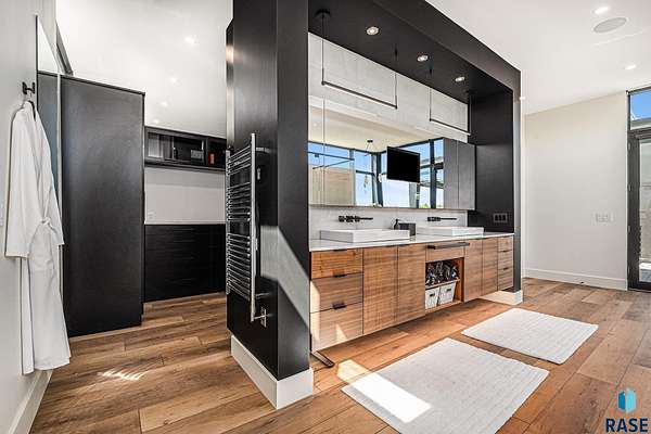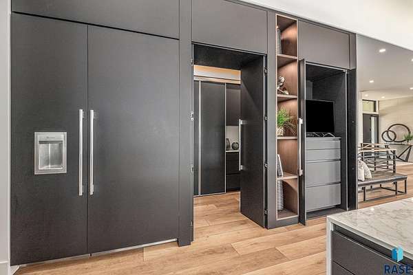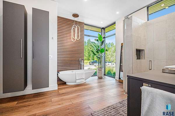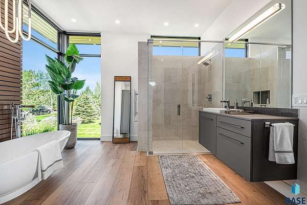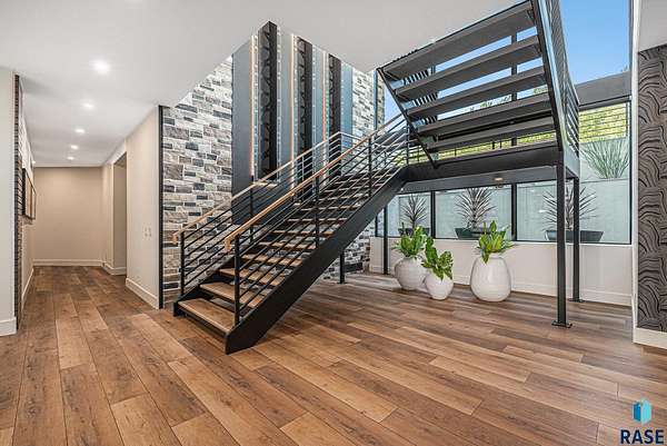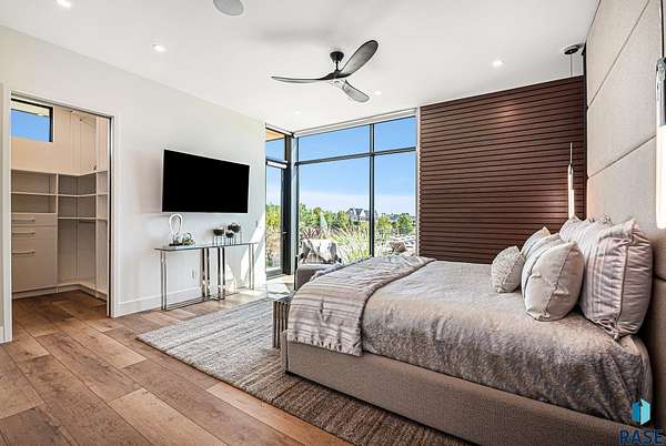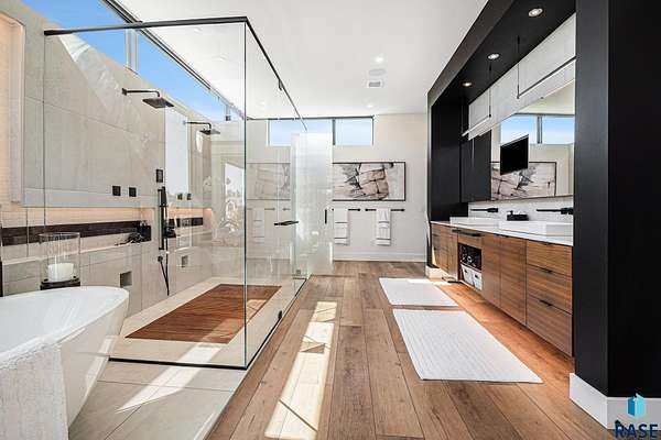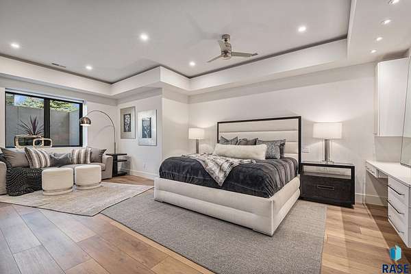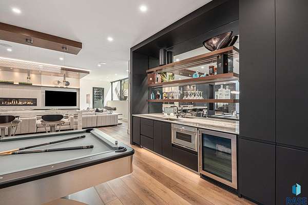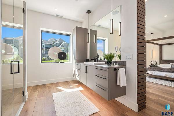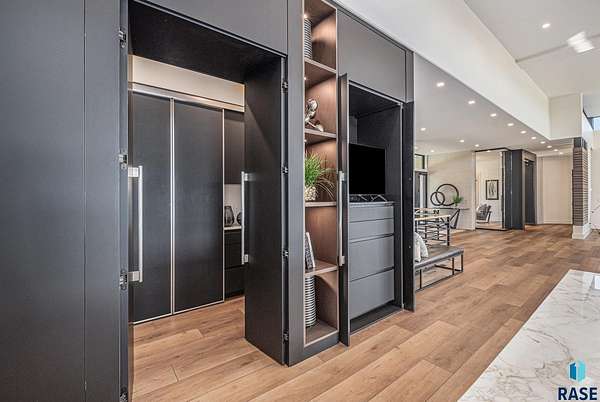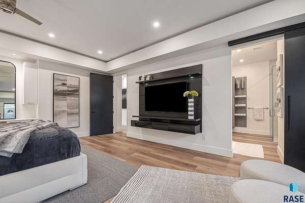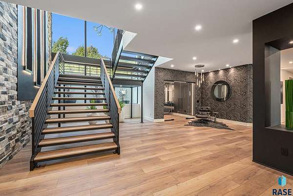 Come enjoy luxurious living in this rambling 1.6 acre waterfront lot on Silver Pond, the desirable gated development hidden in a resort style in neighborhood in Southern Sioux Falls! Single-story living offers practical elegance in this Executive Ranch home odorned with a resort style pool complete fire bowls, water features and private sundeck with room to lounge! Superior location for shopping and close to Harrisburg Freshman Academy and bordering a private stocked fishing pond. Enjoy spectacular views of Silver Pond and the swimming pool. Step from the 8 foot tall front entrance doorinto an interior embrace that includes an impressive entryway, an open layout, window light complemented by stylish remote control blinds, neutral decor, notable ceiling styles (including tray, coffered, and beamed), and four gas fireplaces (living room, primary bedroom, basement, and covered outdoor kitchen). Delectable notions become fully baked realities in the elegant, spacious island chef's kitchen, with natural light, premium Thermador appliances including a built in Espresso machine, dekton counters with marble backsplash, and ample pantry space. The kitchen opens seamlessly onto the dining room, living room, patio, and backyard. The feature-rich Master bedroom includes a walk-in closet, a linen closet, mini bar with sink and ref, sitting space, and a private bath with a curbless shower and jetted whirlpool. The other three bedrooms, distributed on multi-levels for privacy, are unique, quiet, ensuite, and designed with plenty of closet space. Finished basement serves as a rec room, multi-purpose room, guest quarters, and home theater as well as a wine cellar, sauna and steam shower. Attached 6-car garage with epoxy floor, floor drain, separate workshop and stair entry to the lower level. The circular driveway means no backing up. Exterior includes a tiled, covered patio with it's own outdoor kitchen, ceiling heaters, automatic screening and gas fireplace to enjoy the views of the pond and the pool!