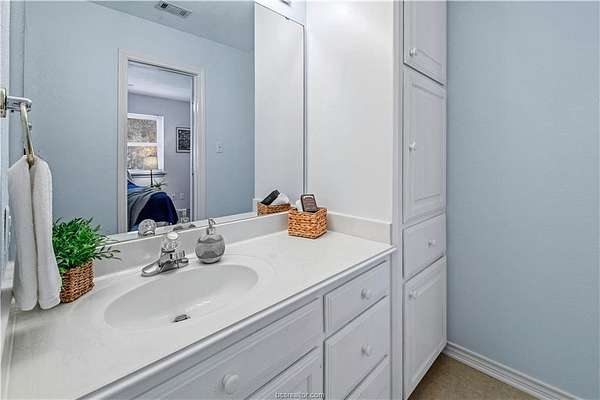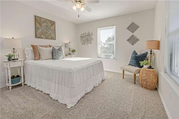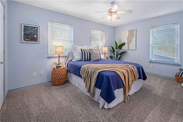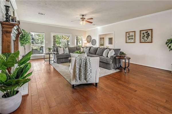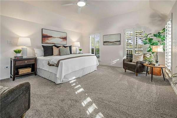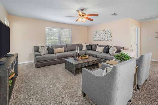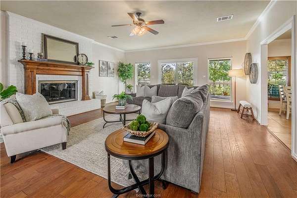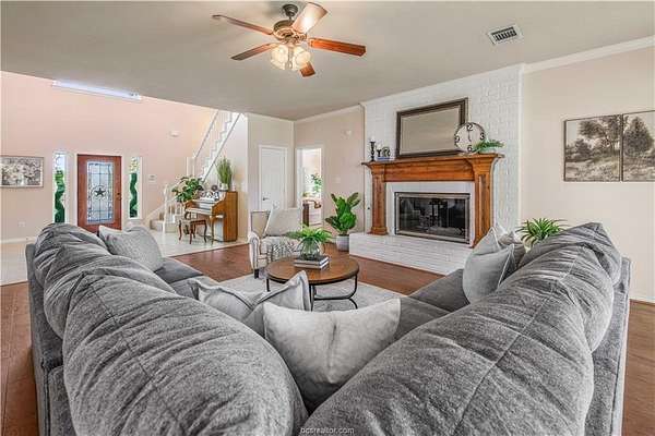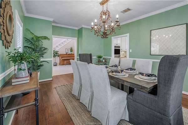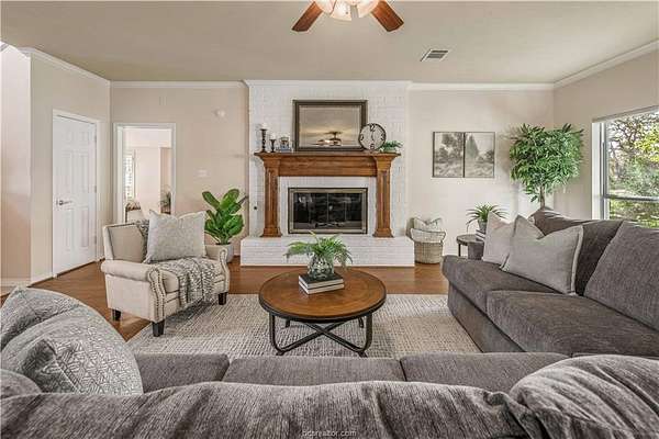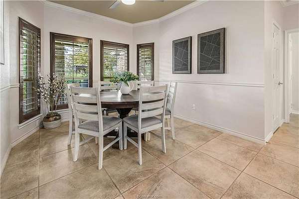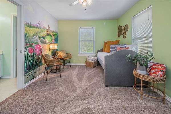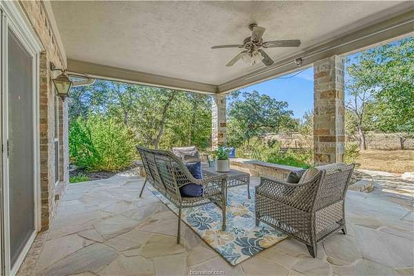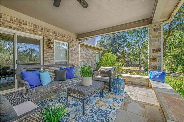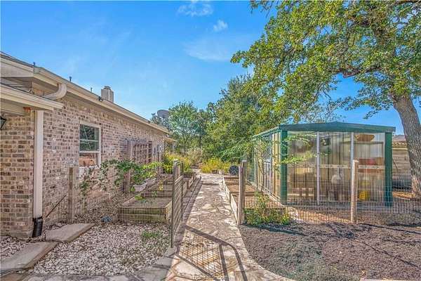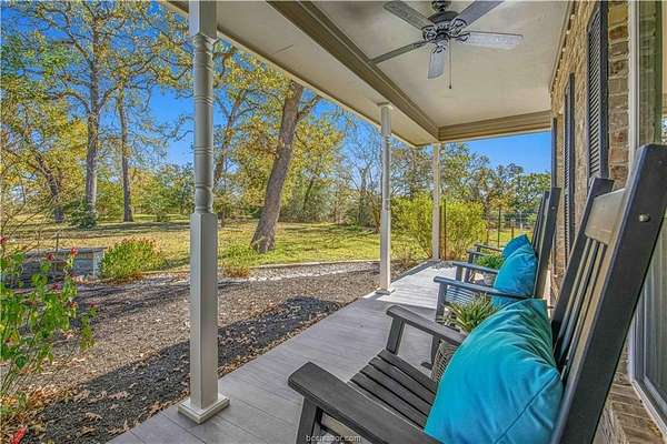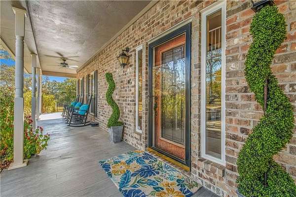 This beautiful 5-bedroom, 3.5-bath home is located on a private, serene 10.91 acre setting in south College Station. The front wrap-around porch and back patio offer peaceful views of the towering native trees, foliage, and wildlife. The grand foyer and welcoming living room set the tone for this unique home. The living room is anchored by a beautiful fireplace and wall of windows providing warm, natural light. Just beyond, a breakfast nook invites slow mornings and casual meals, positioned just off of the kitchen. The kitchen is both functional and elegant, featuring granite countertops, a generous island for gathering, and a large walk-in pantry. Just off of the foyer and living room, the formal dining room makes a statement with its chandelier and refined crown molding, ideal for hosting holidays or special occasions. The spacious primary suite offers gorgeous views of the surrounding acreage and a functional bathroom with enormous walk or roll in shower. Upstairs, a spacious second living area offers a flexible retreat for movie nights, play space, or quiet relaxation. Four spacious bedrooms provide ample room for guests or multigenerational living. One bedroom includes a private en-suite bath, while two others share a convenient Jack-and-Jill bathroom. Outside, the lifestyle continues with a covered patio for entertaining or enjoying peaceful mornings. A charming gazebo, garden area, greenhouse, and thoughtfully landscaped flowerbeds complete this private escape.