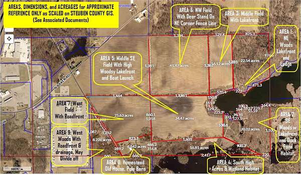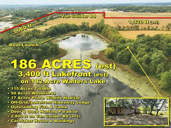 186 ACRES, 3,400 FEET OF LAKEFRONT ON 182-ACRE WALTERS LAKE: With deep woods, open areas, and multiple secluded building sites along the lake, this exceptional property lies in the heart of Indiana's scenic 101 Lakes region in Steuben County. This extraordinary 186-acre parcel offers a rare blend of natural beauty, recreational opportunity, and legacy potential. Featuring over 3,400 feet of private lakefront on 182-acre Walters Lake, plus more than 2,400 feet of natural wetland shoreline with no public access, this fishing and wildlife haven is a true sanctuary for hunters, naturalists, and conservationists alike. The property includes 115 acres of productive tillable ground currently in crops, 50 acres of woodlands, and 17 acres of prime wildlife habitat, making it a deer and duck hunting paradise. A secluded, off-grid hunting lodge is tucked away in the woods, surrounded by elevated terrain ideal for multiple private building sites, and even includes a private boat launch. The property also features a caretaker's 3-bedroom homestead, a barn and a 40x64 pole barn with a $15,000 seller concession offered for remodeling. Adding to its unique appeal, the owner reports a level area once used as a private landing strip, perfect for aviation enthusiasts or future development. With 2,800 feet of road frontage on Van Guilder Road with frontage on both sides of the road, the property is just one mile from restaurants, two miles from the I-69/I-80/90 interchange, and three miles from the charming town of Fremont. This hidden gem offers unmatched privacy with convenient access. Opportunities to own a parcel of this size, with over 3,400 feet of lakefront, an additional 2,400 feet of natural wetland shoreline, woodlands, farmland, and more, are exceedingly rare. Possible terms considered for well-qualified buyers.