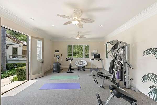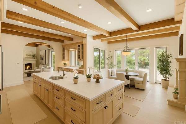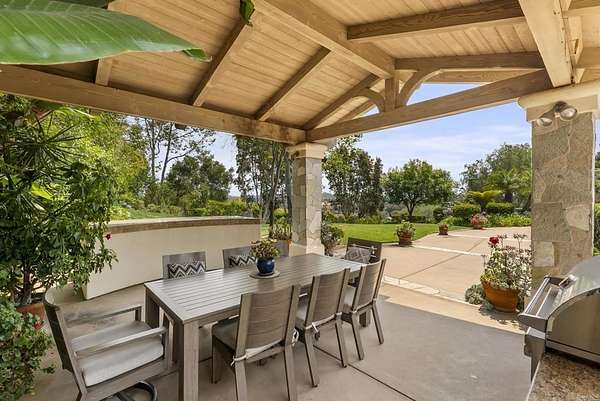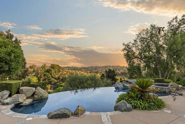 Welcome to 7057 Rancho Cielo, a stunning single-level estate perfectly positioned in the prestigious Covenant of Rancho Santa Fe. Encompassing over three serene acres, this architectural treasure captures uninterrupted southern mountain views and offers a lifestyle defined by privacy, elegance, and effortless California living. Behind a private gated entry, a long circular driveway winds through manicured gardens, setting the stage for the refined residence within. Spanning 8,424 square feet, the home offers both formal and informal living and dining spaces, designed for seamless entertaining and everyday comfort. Walls of glass invite natural light and frame pastoral vistas, while a 160-bottle climate-controlled wine room with adjacent bar elevates gatherings with friends and family. Five bedrooms and seven baths, plus a detached 432-square-foot casita currently outfitted as a gym, provide versatile accommodations for guests, work, or recreation. Outdoors, the resort-style grounds inspire connection and relaxation with a vanishing-edge pool and spa, covered outdoor kitchen, multiple lounge and dining areas, and a charming family orchard. All of this is set within minutes of the Rancho Santa Fe Village, award-winning schools, and world-class golf, making 7057 Rancho Cielo not just a home, but a statement in luxury and the art of single-level living.