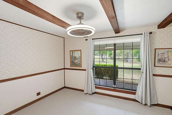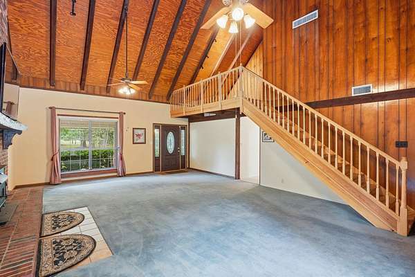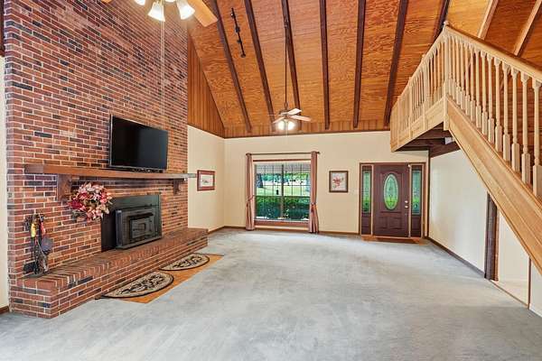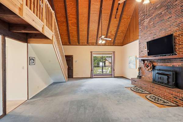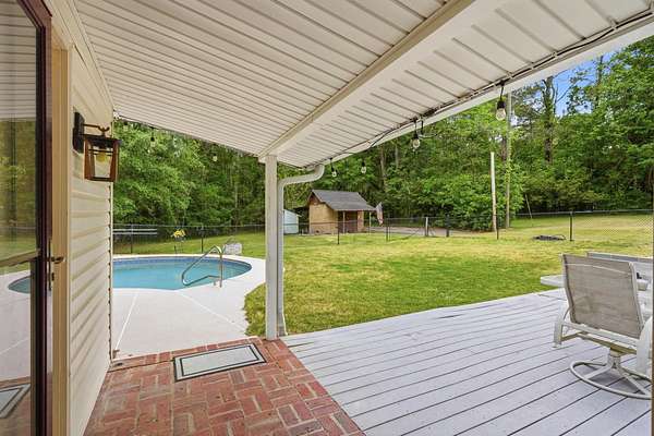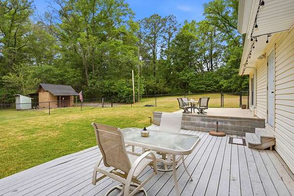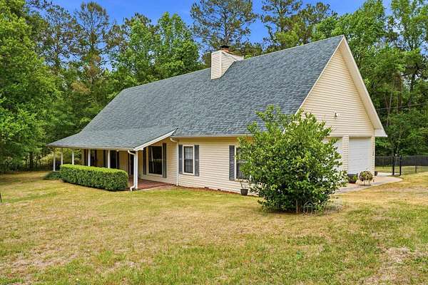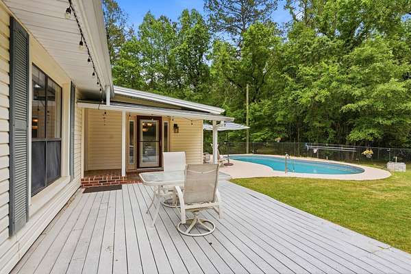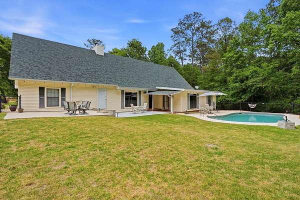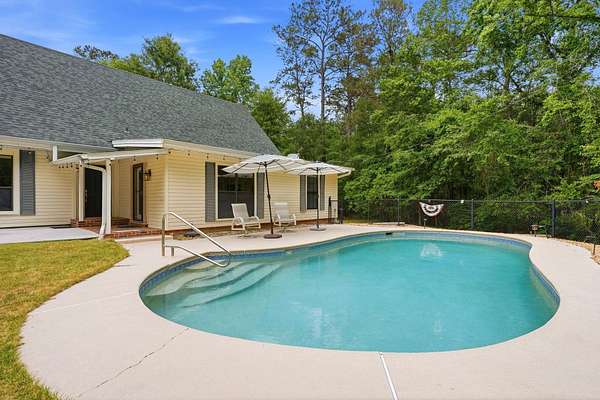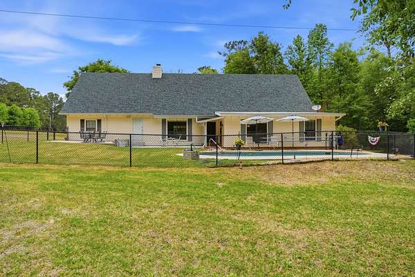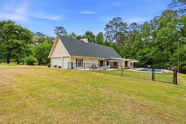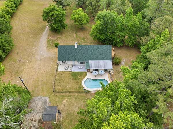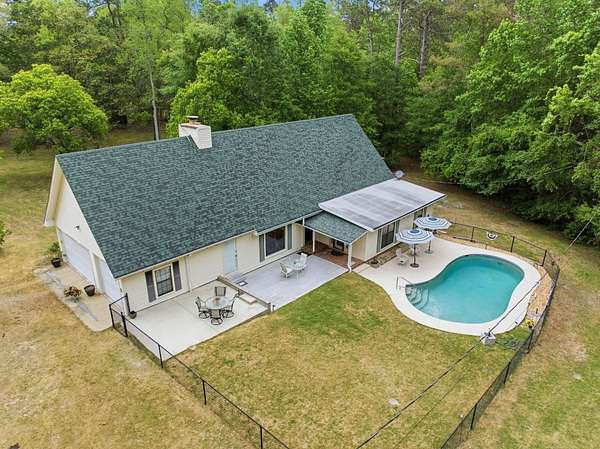 Est $2,744/moBeautiful pool home on 4+ acres with gorgeous oaks trees surrounding the property! This home has 4 bedrooms, 2 bathrooms, and a 3-car garage! Relax on the rocking chair front porch and watch the sunset. The living room has soaring vaulted wood ceilings and a cozy fireplace making it the perfect place for entertaining, and the kitchen has brick floors adding to the southern charm. Additional features include a loft space upstairs perfect for an office or play area, large indoor laundry room, storage shed, back patio and deck for grilling and entertaining, and a fence around the pool. This home is a must-see!!