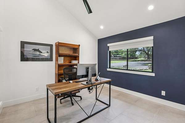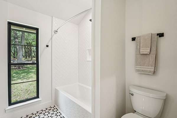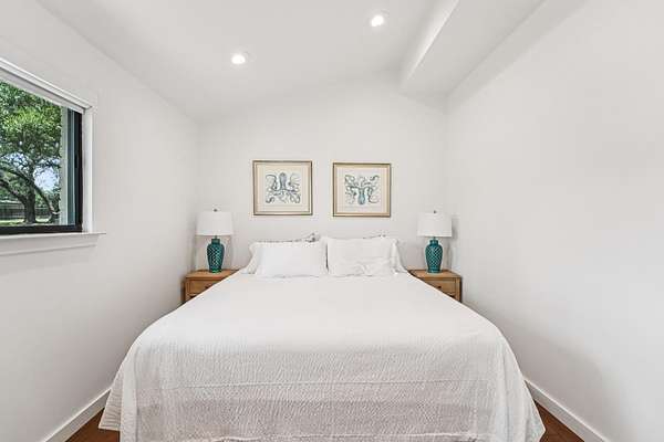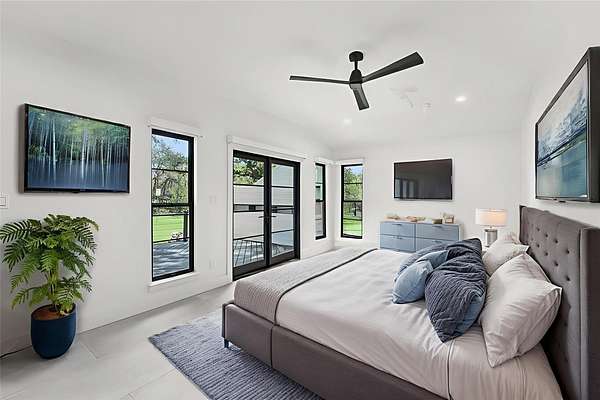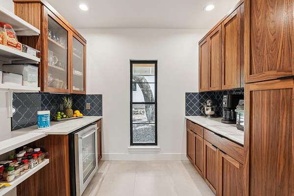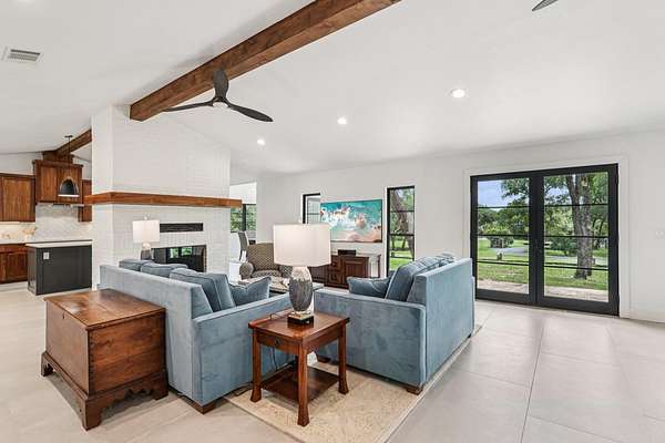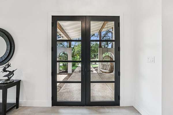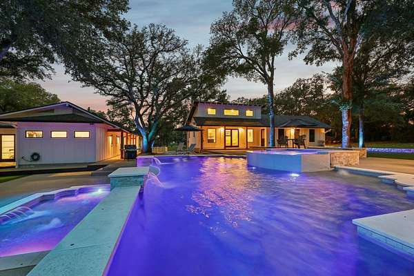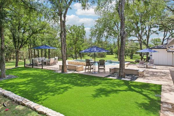 Tucked behind a private gate on 4 oak-studded acres in the coveted North Lake community, 707 Harbor Dr is more than just a home-it's a sanctuary where nature, luxury, and recreation coexist in perfect harmony. This thoughtfully reimagined 3-bedroom, 2-bathroom main residence spans 2,500 square feet and has been completely transformed from the studs up between 2019-2020. Originally crafted in 1978, the home now showcases a stunning modern design infused with timeless materials and meticulous attention to detail. Raised ceilings and Marvin black-framed windows flood the space with natural light, while wide-plank 48"x24" tile floors and solid-core doors add a touch of quiet luxury throughout. At the heart of the home, the gourmet kitchen commands attention with custom walnut cabinetry, sleek Quartz countertops, a granite composite sink, and premium stainless appliances-including a 5-burner induction cooktop and built-in Bosch WiFi coffee maker. The living area features dramatic cathedral ceilings, and the dining room rises to an impressive 12 feet, making gatherings both grand and comfortable. The primary suite is a true retreat, offering double doors to a shaded patio and a spa-like ambiance amid the tranquil landscape. The recent 2022-23 addition of a fully finished 600 sq ft guest house elevates the experience for visitors or multi-generational living. With its own bedroom, bathroom, kitchenette, and living space, guests can enjoy views of the resort-style, multi-tiered pool and hot tub, which flow seamlessly into an expansive sun-shelf and catch basin waterfall feature. Surrounding it all is lush, high-grade artificial turf for year-round vibrancy and minimal upkeep. And for those seeking activity and entertainment, an extended paved area leads to a custom pickleball court-perfect for spirited games with friends or neighbors. A paved drive and ample parking make hosting a breeze, while the short drive to Lake Georgetown offers endless outdoor adventures nearby.