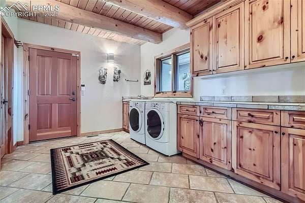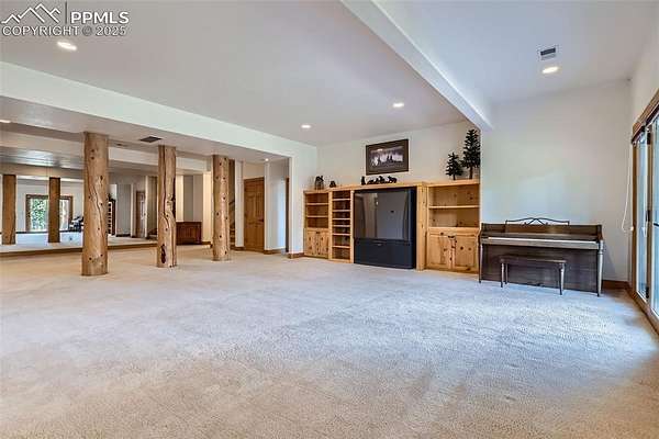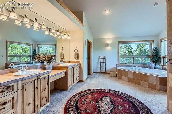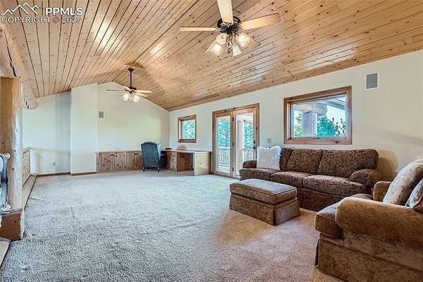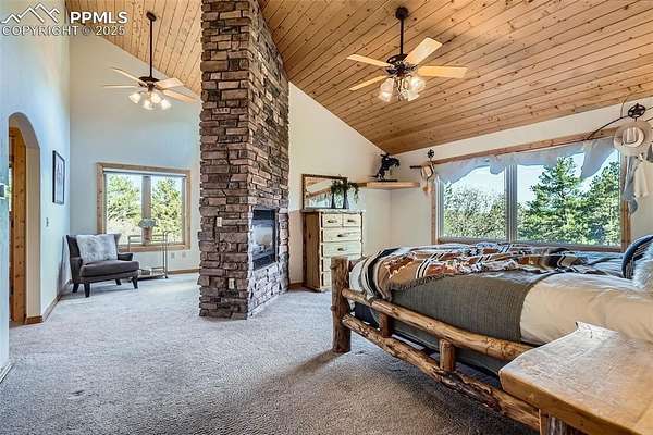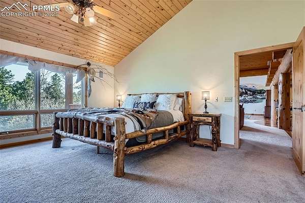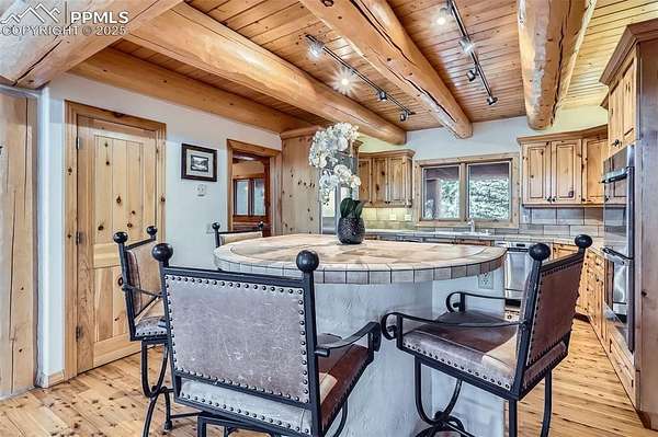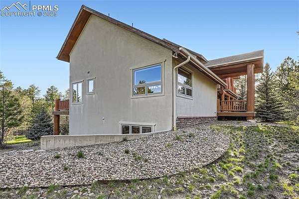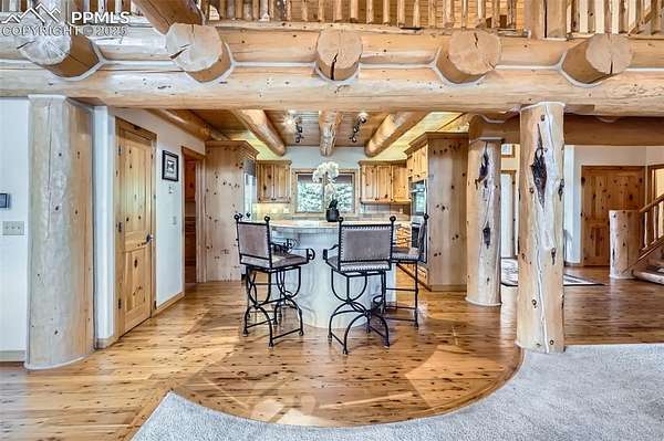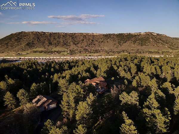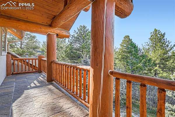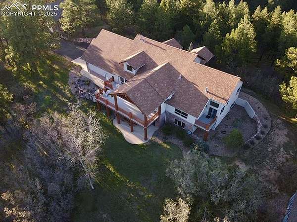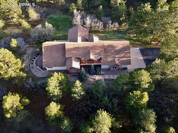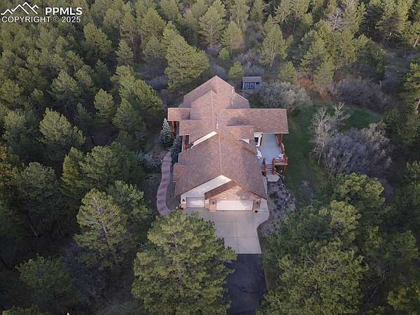 Discover the perfect blend of luxury and tranquility in this expansive 5,135 square foot home featuring 4 spacious bedrooms, 5 bathrooms, and breathtaking panoramic views. Designed for both comfort and entertaining, the open-concept layout includes center island kitchen with knotty pine custom cabinets, elegant dining area with a custom mural, and multiple living spaces with large windows that bring the outdoors in. Bonus open living area in the loft with a built-in office space and a covered patio with stunning views. Main level family room features soaring t&g ceilings with 18' log beams and a 3 sided floor to ceiling stone gas fireplace. Large Primary bedroom retreat complete with a gas fireplace, sitting area, private deck, and large walk-in closet. 5 piece primary bath includes separate sinks, cabinets and counter space, jetted soaking tub and walk-in twin head steam shower. Walkout basement boasts a huge great room with built-in entertainment center. 3 additional bedrooms and 2 baths. The home includes both an oversized attached 3-car garage and an additional 3-car detached heated garage, perfect for car enthusiasts, workshops, or extra storage. Enjoy ultimate privacy and space with 35 pristine acres, ideal for equestrian use, outdoor recreation, or simply soaking in the natural beauty. Outdoor living space is abundant with a garden level back patio, covered front porch and expansive back deck perfect for entertaining or relaxing and enjoying the views, trees and wildlife. This rare property offers the feel of a secluded mountain escape while remaining just minutes from town amenities in nearby Larkspur, Castle Rock or Monument. Whether you're looking for a full-time residence, vacation property or investment opportunity, this property delivers unmatched value and potential. Situated perfectly between Denver International Airport and Colorado Springs Airport for added convenience.