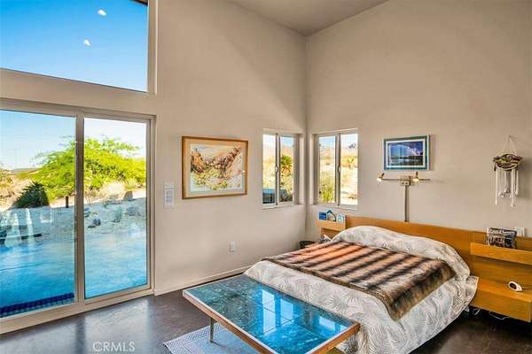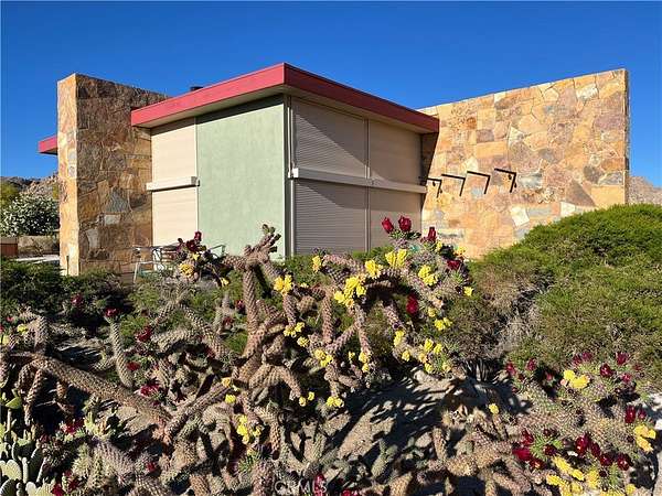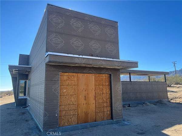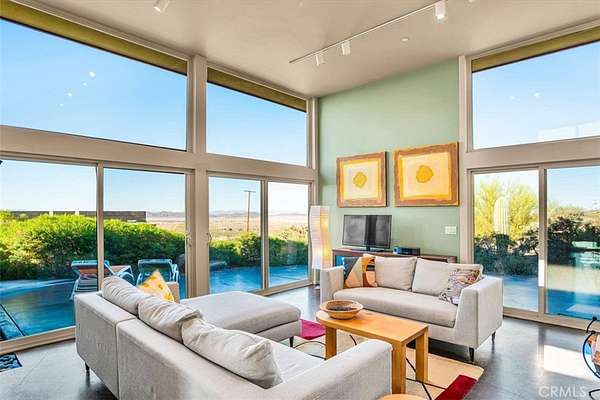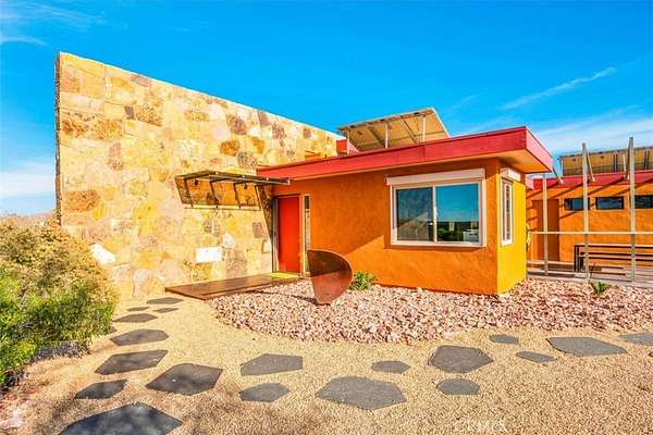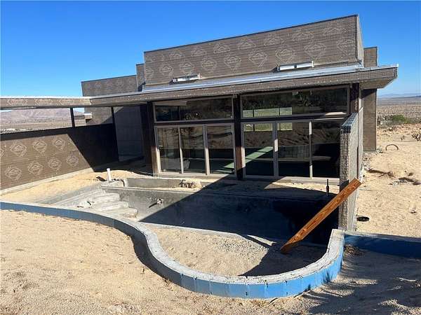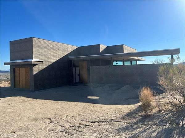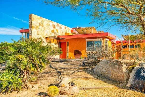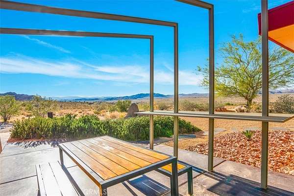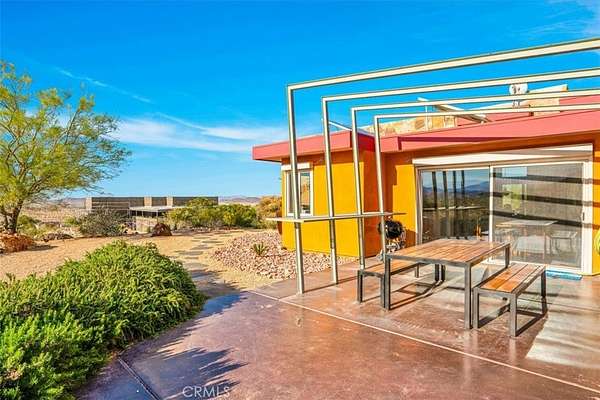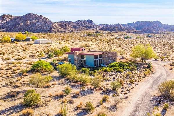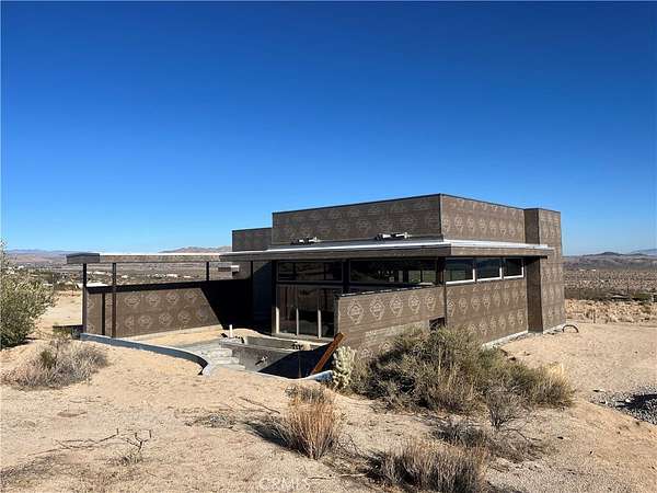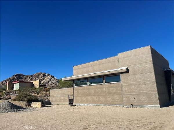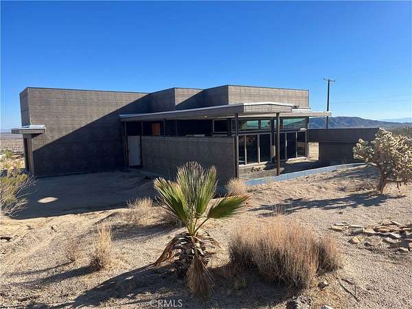 Villa Bajada--A Timeless Architectural Retreat in South Joshua Tree. Perched high near the Joshua Tree National Park boundary, on two contiguous parcels totaling 4.23 acres. Live with nature in this superb mid-century style modern gem while creating your personal studio for art, music, meditation, and entertainment. The main house is a 2007 built 1181 square foot 2-bedroom, 1 bath home with kitchen, dining room, living room, garage and features paid solar panels to reduce utility costs. Nearby the home, an unfinished 1108 square foot building flex space / art or yoga studio, featuring central HVAC, bathroom, another room and garage, plus in-ground pool--an opportunity to complete to taste with the original contractor still available and permit active. Surrounding the home, multiple patios and lush native landscaping create outdoor living spaces including a spa for moonlit dips and stargazing. This unique pied-a-terre makes a fantastic vacation getaway or a full-time residence or income / rental property. Rarely does a property of this vision come available. Villa Bajada is more than a home--it's a living piece of art. Come experience this rare desert refuge now.