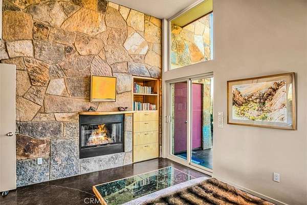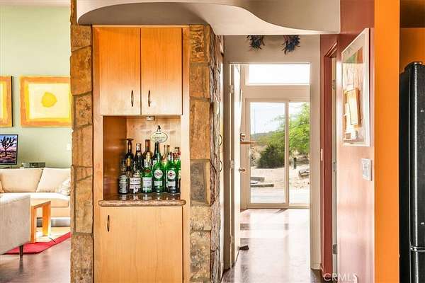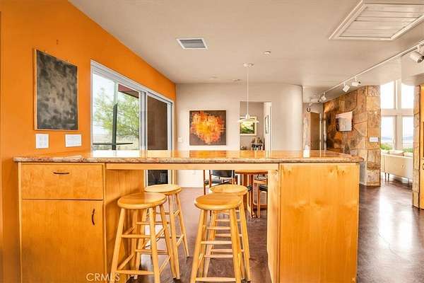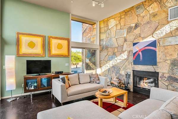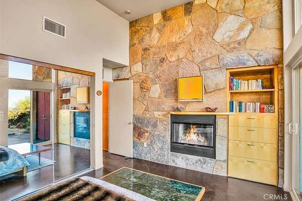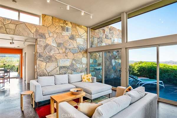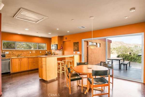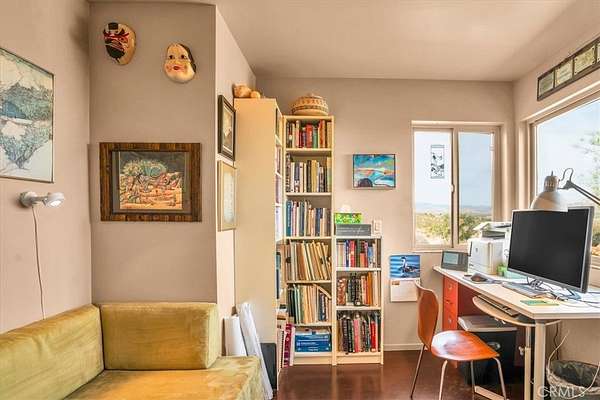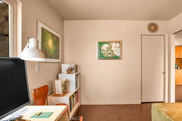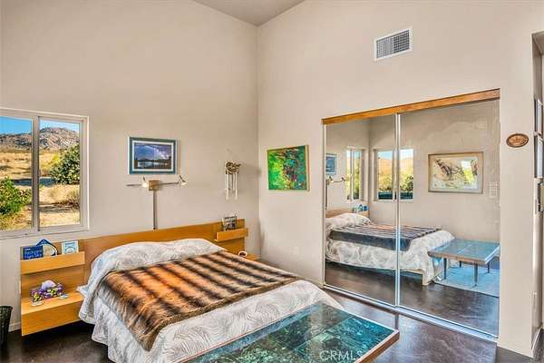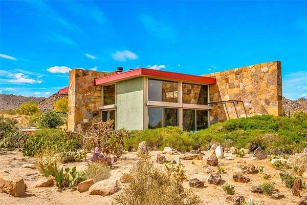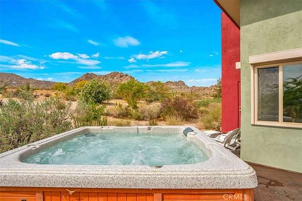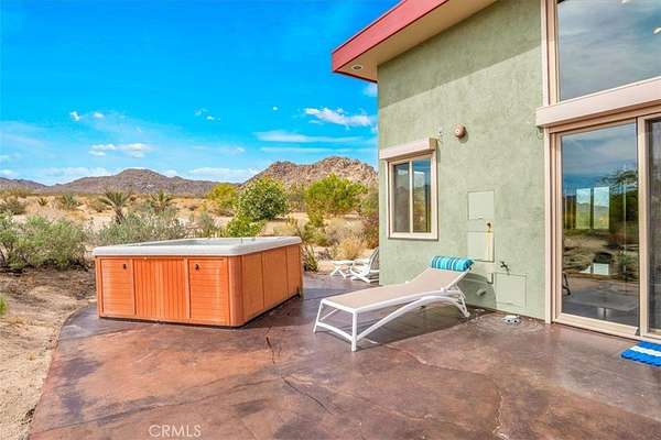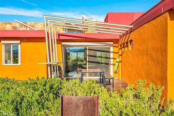 Villa Bajada--A Timeless Architectural Retreat in South Joshua Tree. Perched high near the Joshua Tree National Park boundary, on two contiguous parcels totaling 4.23 acres. Live with nature in this superb mid-century style modern gem while creating your personal studio for art, music, meditation, and entertainment. The main house is a 2007 built 1181 square foot 2-bedroom, 1 bath home with kitchen, dining room, living room, garage and features paid solar panels to reduce utility costs. Nearby the home, an unfinished 1108 square foot building flex space / art or yoga studio, featuring central HVAC, bathroom, another room and garage, plus in-ground pool--an opportunity to complete to taste with the original contractor still available and permit active. Surrounding the home, multiple patios and lush native landscaping create outdoor living spaces including a spa for moonlit dips and stargazing. This unique pied-a-terre makes a fantastic vacation getaway or a full-time residence or income / rental property. Rarely does a property of this vision come available. Villa Bajada is more than a home--it's a living piece of art. Come experience this rare desert refuge now.