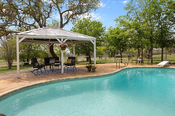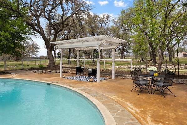 Motivated Sellers welcome offers on this fantastic 39+ acre ag-exempt, unrestricted Texas Hill Country ranch. With panoramic views that stretch for miles, this property offers the rare opportunity with a second build site, if you're looking to build additional structures. Move right in, enjoying the updated ranch home and the land to put cattle, horses or your 4H projects. The recently updated ranch house that's full of charm has 3 bedrooms, a dedicated office, and open-concept living spaces, it's ideal for everyday living and weekend entertaining. The kitchen is a showstopper-featuring black honed granite counters, double ovens, a coffee and wine bar, pantry, and serene views overlooking the in-ground pool. The primary suite bathroom offers a Swedish soaking tub, oversized walk-in shower, and a private enclosed patio perfect for morning coffee or sunset views across the ranch. Multiple patio areas invite you to host gatherings, relax under pergolas, or simply unwind in the in-ground pool. An added plus is a separate guest cabin offering guests a charming stay with a full kitchen and bath. Use it for an Airbnb and offset costs. The entire property is fully fenced & cross fenced.