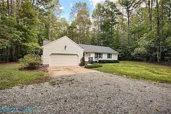 Just 5 minutes from Gloucester Courthouse, this 1,428 sq ft home is nestled on 5 acres in Kings Trace and offers a comfortable split-bedroom layout with an open, airy design. The great room combines the foyer, kitchen, living, and dining areas to create a welcoming space for everyday living and entertaining. The kitchen features quartz countertops, stainless steel appliances including a gas range, an R/O drinking water filter, pantry, and abundant cabinet space. The living area is highlighted by a cozy gas fireplace, adding warmth and charm. Additional features include a tankless water heater, whole-house water filtration system with softener (maintained by Fire & Water), generator plug, and a two-car garage with at ceiling storage shelves. The property also includes a shed with a separate storage area and is wired for electricity. Recent updates include a new roof in 2023, HVAC system in 2020, water pump in 2024, and fresh interior paint in 2024. The crawl space was encapsulated with a dehumidifier in 2019 (managed by Lamb Exterminating). Cox internet is available. Pride of ownership is evident throughout this well-maintained home, offering peaceful country living with convenient access to town.