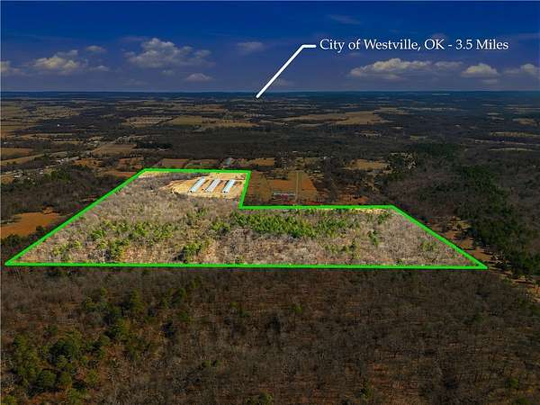59.42 Ac +/- | Poultry Farm Opportunity - Hunting - Investment Potential. Discover the endless possibilities with this 59.42 ac m/l tract ideally located less than 5 miles from Westville and only 20 miles to Siloam Springs. The property features three chicken houses that are no longer in operation but provide excellent large-scale storage or workshop space. Utilities are well established with gas ran to all chicken houses, two water wells, rural water, and a water filtration system already installed. A 1,728 sq ft (per CH) 2 bed, 2 bath home sits on the property and would make a great rental, employee housing, or primary residence. Additional improvements include a greenhouse and two septic systems. The land itself is a strong mix of function and recreation. Fiber internet is available, offering modern connectivity in a peaceful country setting. Whether you're looking for an investment property, hunting retreat, farm, or development opportunity - this tract checks all the boxes. Owner financing available.