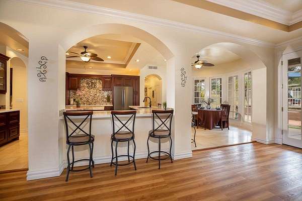 The kitchen is designed for serious cooking and entertaining, featuring black stainless appliances, quartz countertops, three refrigerators, two ovens, two dishwashers, a walk-in pantry, a butler's pass-through with a coffee station, and a bar area. Indoors, a newly upgraded laundry room adds everyday convenience. Outdoors, a low-maintenance saltwater pool and spa sit against the vast 47,000-acre Pu'u Wa'awa'a Forest Reserve for unmatched privacy and natural beauty.