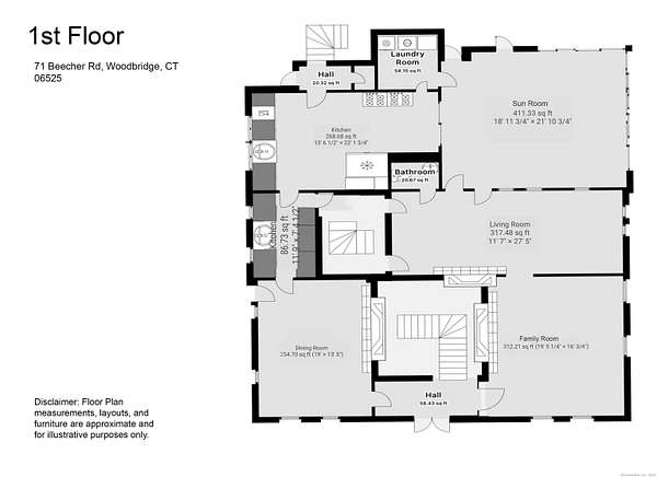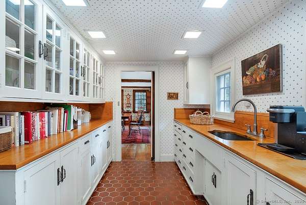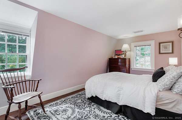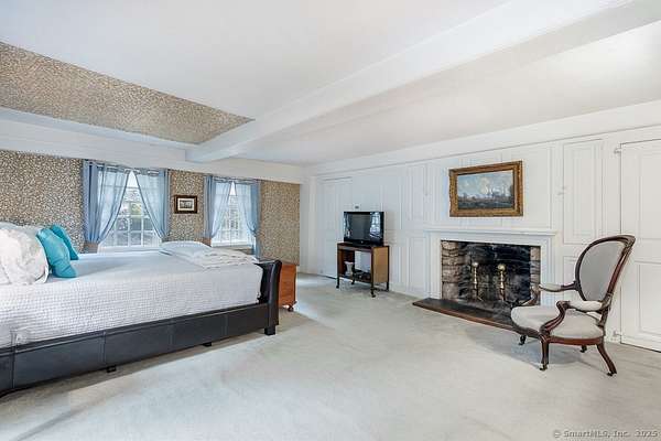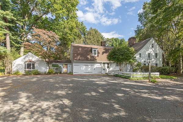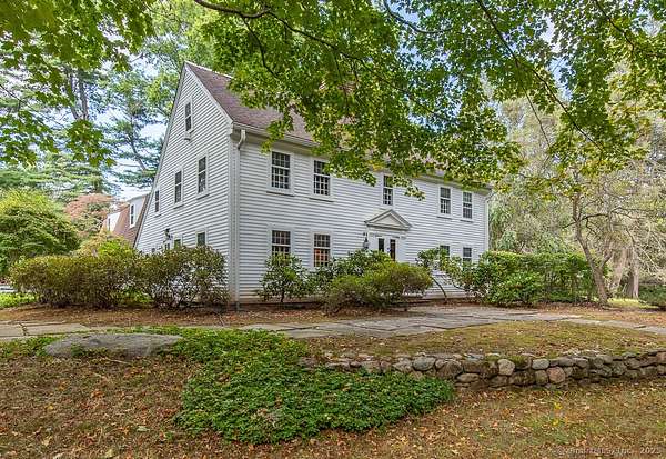 The Nathaniel Parks House circa 1706. Originally built in Guilford, CT, and painstakingly relocated to Woodbridge in 1934. This 5 Br, 3.5 bath, retains all of its original character, including wide plank floors, hand-hewn beams, and a striking double-leaf entry framed by fluted pillars and a pedimented gable. Thoughtful rear additions, including a gambrel wing with garage, were added during the move. Barn-style garage doors and a welcoming covered breezeway connect the main home to an additional wing. Inside, a fieldstone fireplace serves as the stunning focal point of the living area, complemented by exposed wooden beams that enhance the home's historic charm. The eat-in kitchen opens to a sunlit family room with soaring ceilings, four oversized skylights, and panoramic views overlooking the serene backyard. The primary suite features a full bath with a whirlpool jetted tub. Step outside to a brick patio overlooking 7.7 tranquil acres and a classic barn-perfect for storage. The property also includes an in-ground pool, which has not been opened in some time and presents an opportunity for restoration. Mature trees, lush landscaping, and a private setting create a picturesque environment. Large windows and a spacious layout provide generous natural light. A rare opportunity to own a historic Connecticut home full of character, warmth and elegance, in Woodbridge, close to restaurants, shops and Yale New Haven!