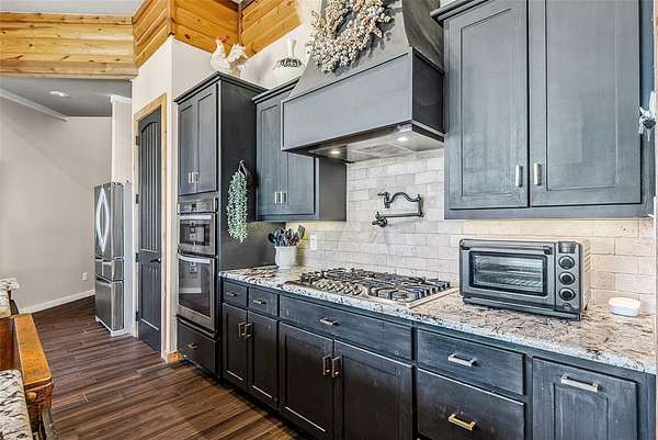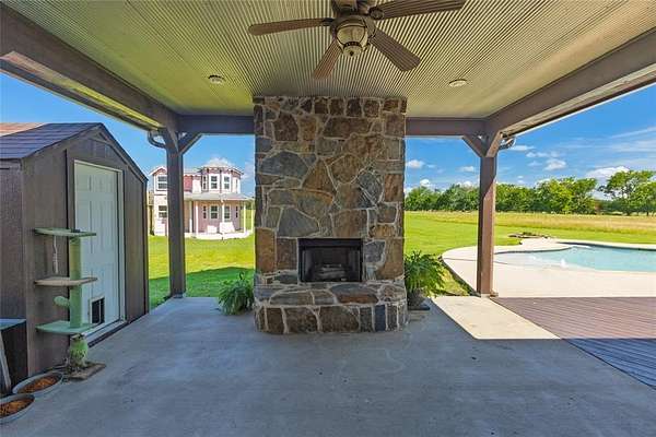 Country life awaits you with this gorgeous home sitting on 5 acres in Cumby, TX just one hour from Dallas! Upon entering the home you're welcomed by a large open floorplan including living, dining, and kitchen featuring huge windows overlooking an inground pool. Amenities include granite countertops, porcelain flooring, log interior walls, gas fireplaces, and more. The kitchen has a large breakfast bar, copper sink, gas stove, and walk-in pantry. Separate utility and half-bath between 2-car garage and kitchen make the perfect mud room. A spacious master suite has a huge walk-in closet, split vanities, and beautiful stand-in shower. This split-bedroom layout has two more bedrooms with walk-in closets and full bath in between. A large flex room upstairs could be a fourth bedroom, office, craft room, or game room, and includes a half-bath and a balcony overlooking the property. Land is in Ag use as a hay meadow. Lots of space to roam so bring those four wheelets and ATV's! Enjoy the beautiful backyard with the pool, deck and outdoor living space and for the kids there is a two-story playhouse with heat and AC!