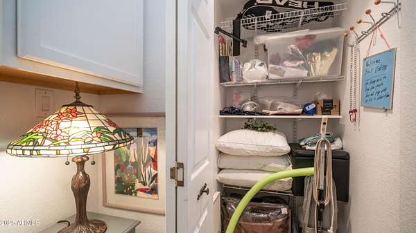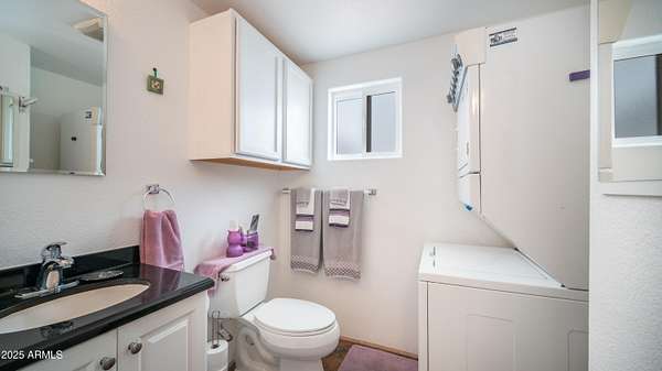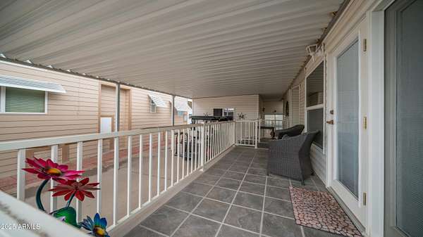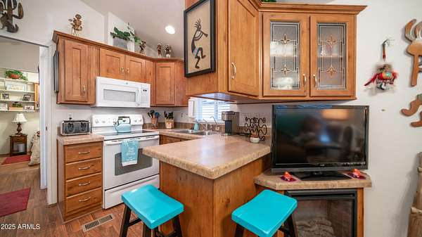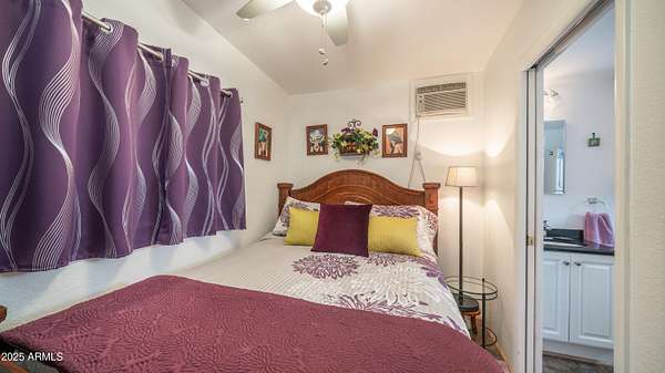 Get ready to live the dream in Golden Vista where you actually OWN the land & the only thing more excited than you will be your friends when they see this home with its bonus casita. Step onto the large tiled deck that practically begs you to sit down with a cup of coffee or maybe something stronger. Walk inside to a bright living area with vaulted ceilings, bay windows, real wood cabinets, laminate wood floors & an electric fireplace that gives instant cozy vibes without you having to chop a single log. The kitchen has everything you need including a flat top stove, microwave, fridge freezer, dishwasher, pantry & RO system so you can feel fancy while staying hydrated. The bedroom comes with a built in vanity desk, a lift & store bed that hides all your secrets, mirrored closets & enough storage to make you feel like a minimalist even if you are not. The full bathroom keeps everything comfortable while the hallway bonus closet gives you even more places to stash your stuff. Now let us talk about the casita because this little gem is like having your own guest suite, hobby room, nap zone or quiet escape depending on the day. It offers a half bath, stacked washer dryer, a wall AC unit, loads of storage & even a fridge freezer just in case you need backup snacks. Through the enclosed breezeway you will find a private patio area perfect for enjoying the Arizona weather while contemplating how you got so lucky to live here. This home is tastefully furnished, move in ready & placed in one of the most fun resort communities around. Golden Vista is packed with endless activities, friendly neighbors & good vibes at every corner. Come see it before someone else claims your future happy place.