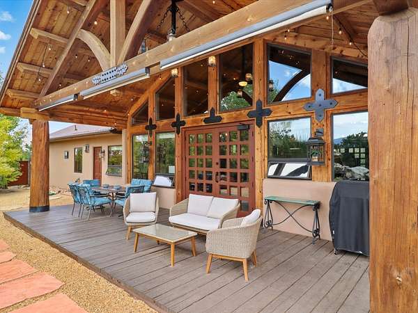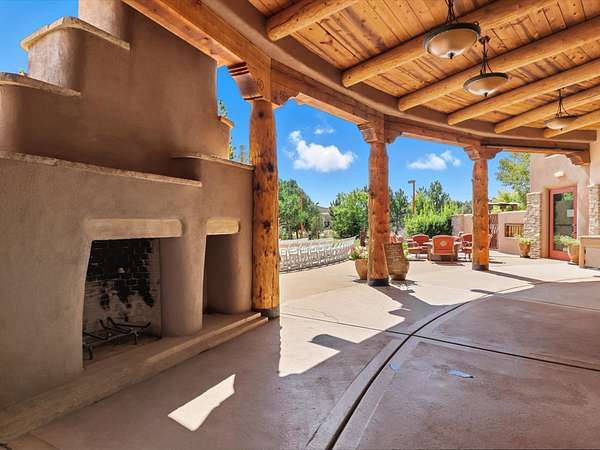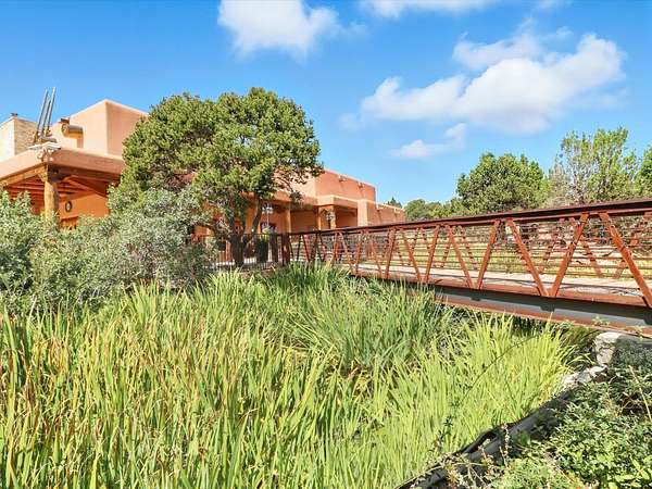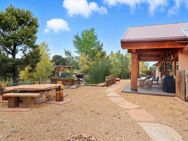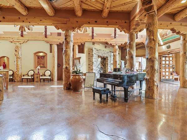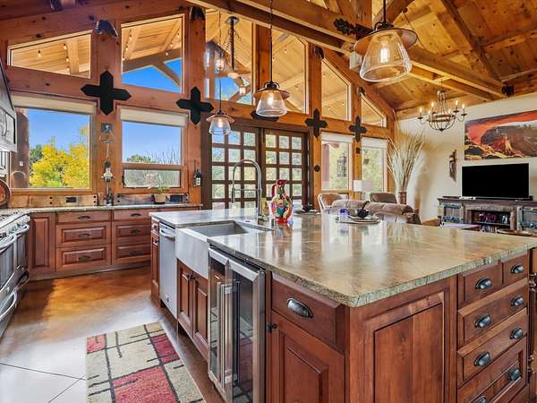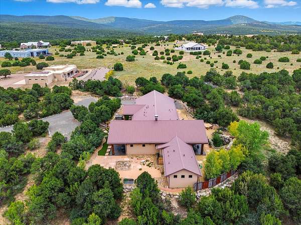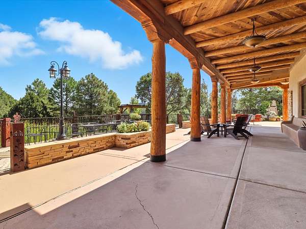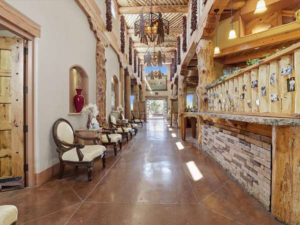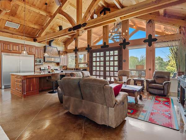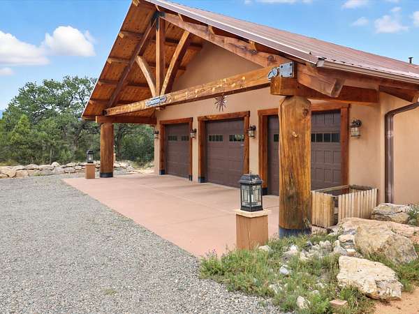 Country Lodge-Style Home in Gated Community Casually elegant lodge-style home in a country setting, designed to highlight 4 seasons with walls of windows, 20-foot wood ceilings, and massive trusses in the great room. Two living areas are divided by a two-way stacked stone fireplace, with a striking water feature inside the front entry. Interior features include concrete radiant-heated floors, wood vigas, and a chef's kitchen with 2 ranges, dishwasher, wine cooler, built-in refrigerator, rainforest quartz island, copper hood and backsplash, and a large pantry. A built-in china hutch adds to the custom design. The main suite includes a Jacuzzi tub, fireplace, and a large walk-in closet. Additional amenities feature a 1,369 sq. ft. 3+ car garage/workshop with shelving, porches at the front and back, and an outdoor hot tub. Backyard has a large koi pond with a water feature. Located in a gated, paved community with clubhouse amenities including walking trails, indoor pool, outdoor hot tub, sauna, gym, basketball, racquetball and tennis courts. Approximately 20 minutes east of Albuquerque.