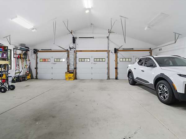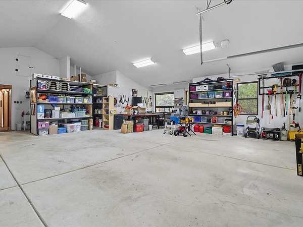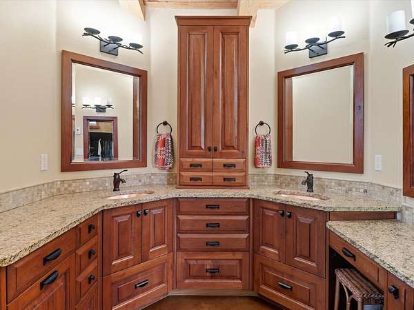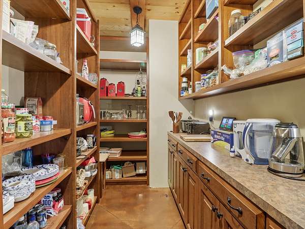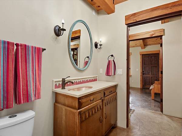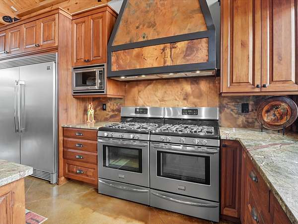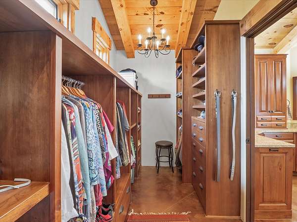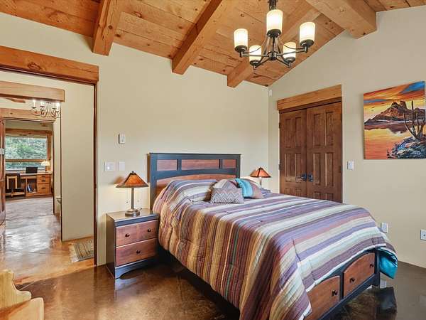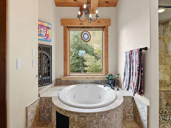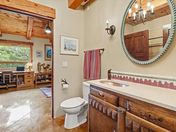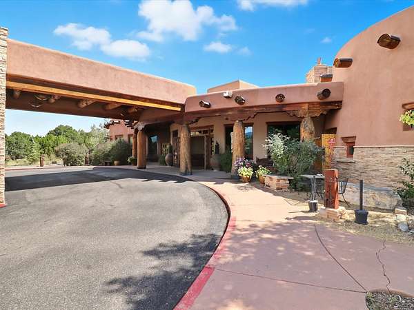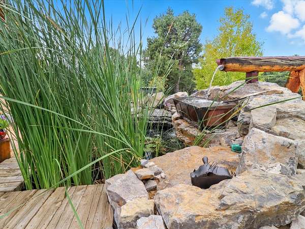 Country Lodge-Style Home in Gated Community Casually elegant lodge-style home in a country setting, designed to highlight 4 seasons with walls of windows, 20-foot wood ceilings, and massive trusses in the great room. Two living areas are divided by a two-way stacked stone fireplace, with a striking water feature inside the front entry. Interior features include concrete radiant-heated floors, wood vigas, and a chef's kitchen with 2 ranges, dishwasher, wine cooler, built-in refrigerator, rainforest quartz island, copper hood and backsplash, and a large pantry. A built-in china hutch adds to the custom design. The main suite includes a Jacuzzi tub, fireplace, and a large walk-in closet. Additional amenities feature a 1,369 sq. ft. 3+ car garage/workshop with shelving, porches at the front and back, and an outdoor hot tub. Backyard has a large koi pond with a water feature. Located in a gated, paved community with clubhouse amenities including walking trails, indoor pool, outdoor hot tub, sauna, gym, basketball, racquetball and tennis courts. Approximately 20 minutes east of Albuquerque.
