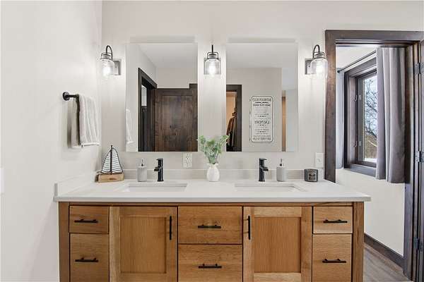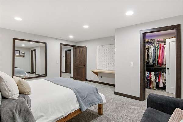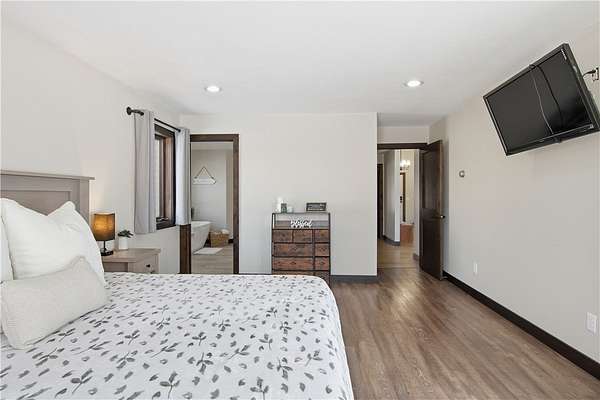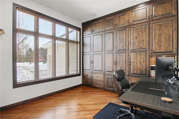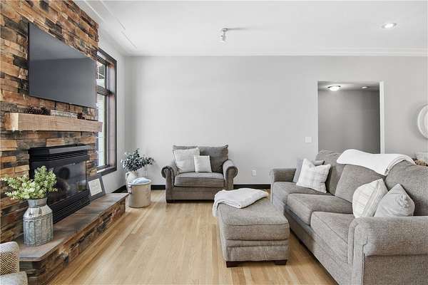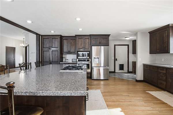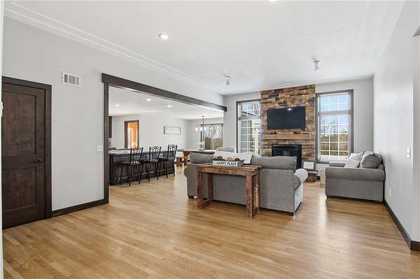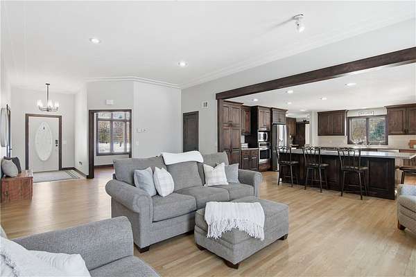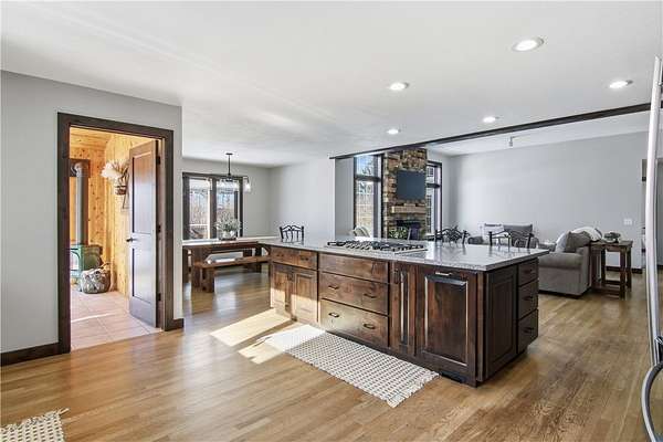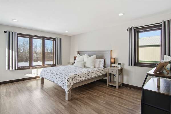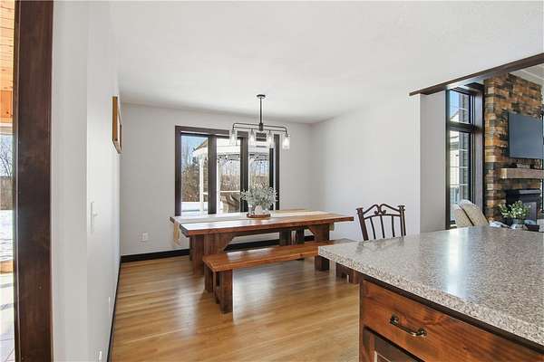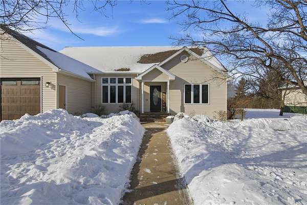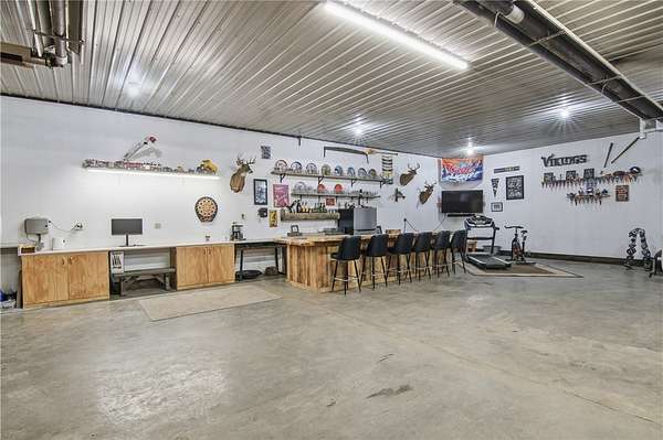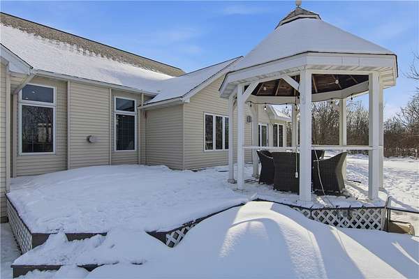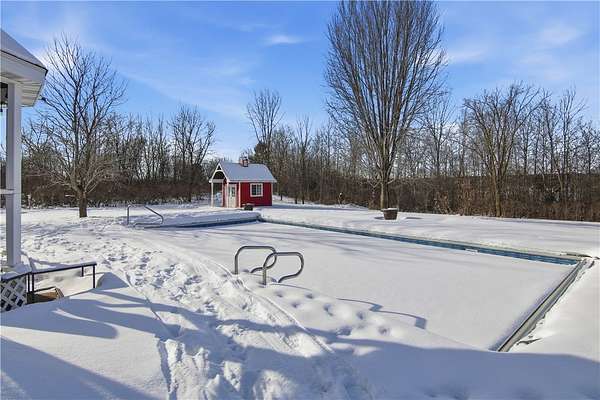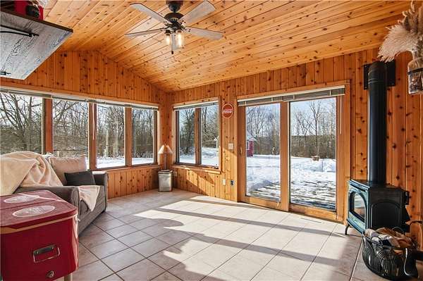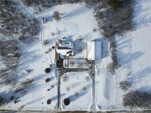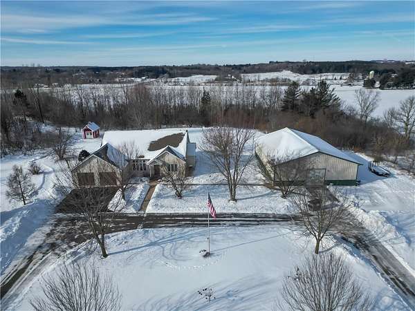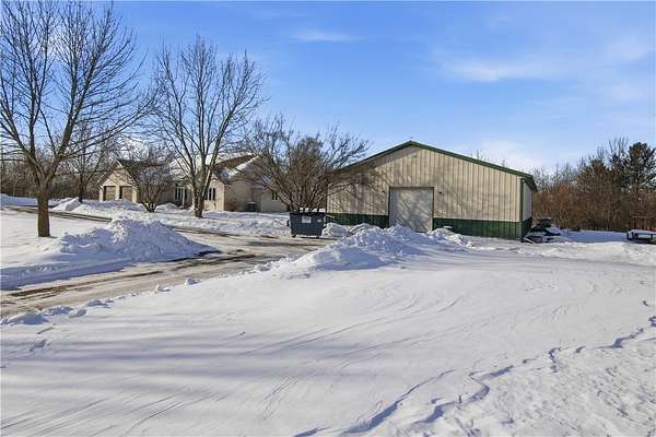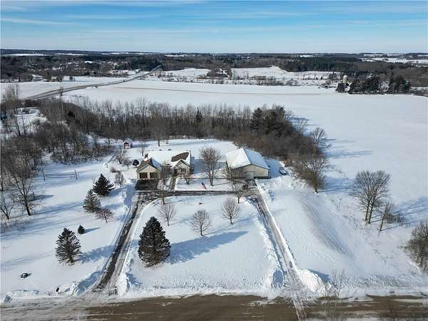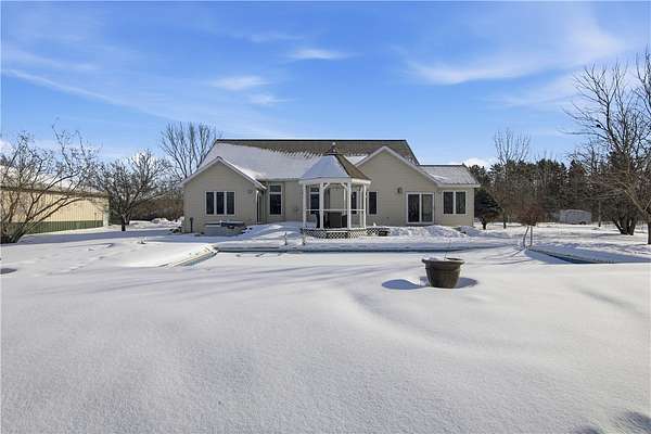 Rare opportunity to own a builder's custom ranch on 14 wooded acres just outside Woodville, WI, featuring groomed trails, abundant wildlife, and resort-style amenities, all less than an hour from the Twin Cities! The outdoor setting is designed for entertaining and relaxation with an inground heated pool, hot tub, sand volleyball court, gazebo, multiple gathering spaces, and peaceful wooded views. The wooded acreage and established trail system also offer excellent hunting opportunities. Inside, enjoy 10' ceilings, large windows, and a striking fireplace anchoring the open-concept layout. The chef's kitchen features a massive center island, gas cooktop, dining area, and exceptional custom soft-close cabinetry. The functional floorplan includes three spacious bedrooms, 2.5 bathrooms, a home office with built-ins, convenient laundry, generous storage, and a luxurious primary suite with soaking tub, walk-in shower and closet, and private deck access. A four-season sunroom offers year-round enjoyment of the natural surroundings. An insulated attached garage connects directly to the kitchen, while the impressive 44x60 heated and insulated detached garage/workshop offers over 2,500 square feet of flexible space with a custom bar, ideal for hobbies, entertaining, or additional living use. Privately located on a dead-end road just minutes from I-94. Home warranty valued at $825 is included for peace of mind. This is a rare chance to truly have it all!