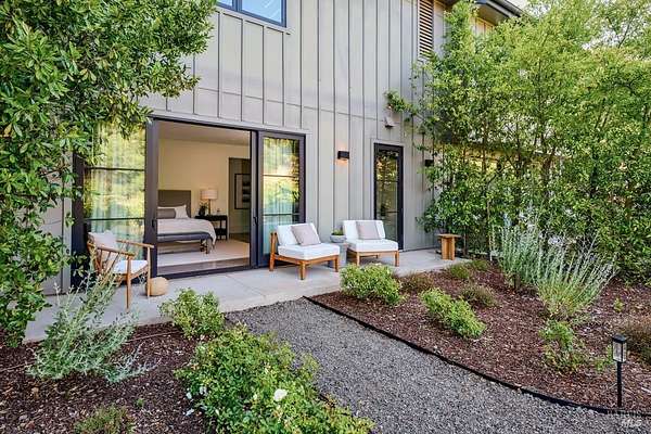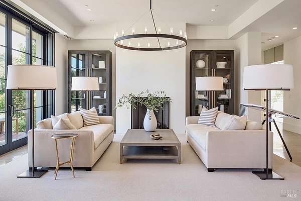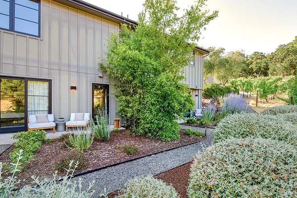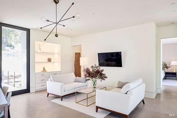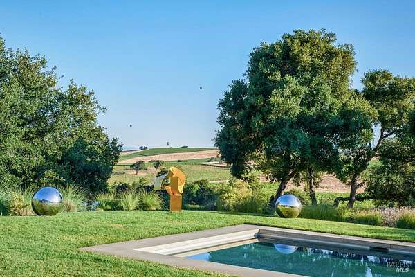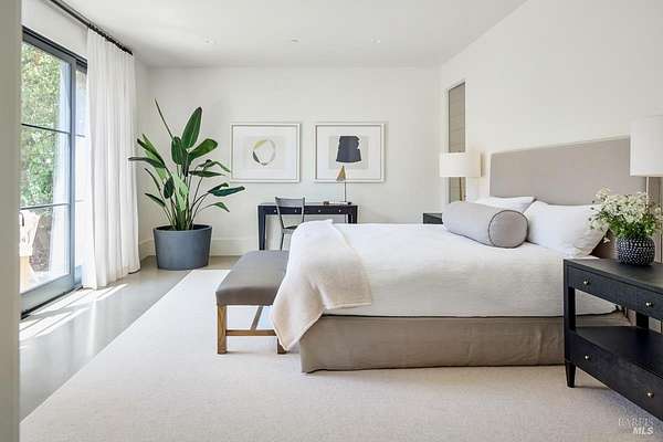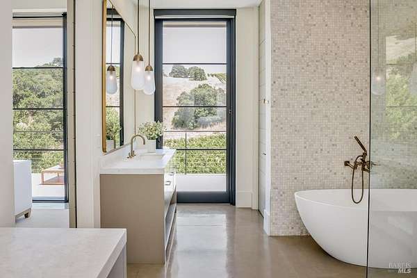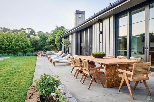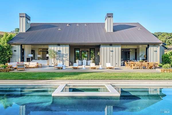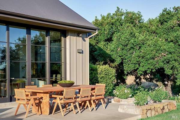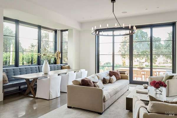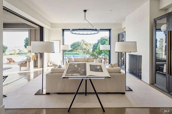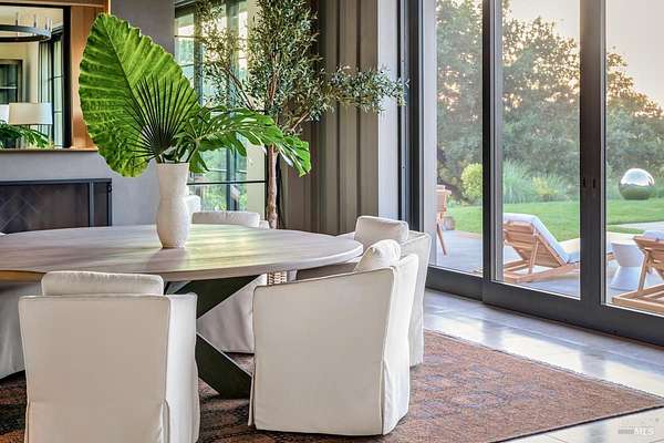 This magnificent estate's main home maximizes natural light and flow. Featuring three en-suite bedrooms, with a primary suite boasting a spa-style bath, walk-in closet, outdoor shower, and sun deck with vineyard and mountain views. The home includes a media room, sunroom, game room, gym, and an open-concept chef's kitchen with imported Italian cabinetry, scullery, BBQ deck, and family room overlooking the pool and spa. Expansive terraces lead to the pool area, offering vineyard views from almost every room. Additional features include a climate-controlled wine cellar, two-car garage with lift, and three fireplaces. The separate guest house mirrors the main residence's quality, offering two en-suite bedrooms and a full kitchen. Ten-foot, floor-to-ceiling windows frame oak trees and vineyards, and a cantilevered deck provides privacy and views. This extraordinary property is offered turnkey, fully furnished with high-end designer pieces, ready for immediate enjoyment. It's a modern Napa retreat, offering seclusion yet is just a 10-minute drive to downtown Napa and an hour from San Francisco