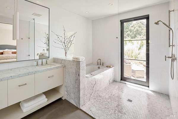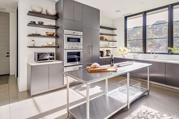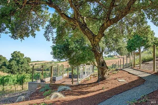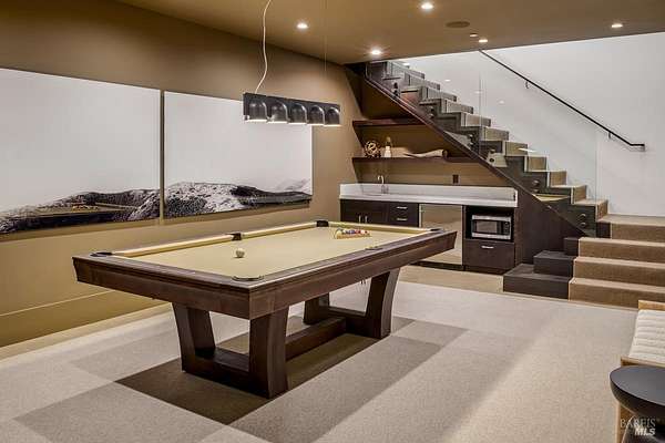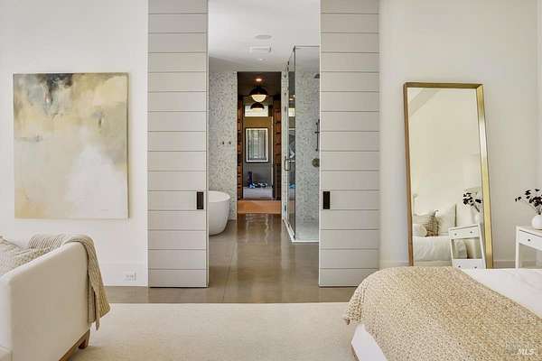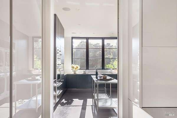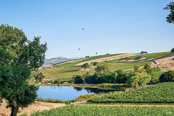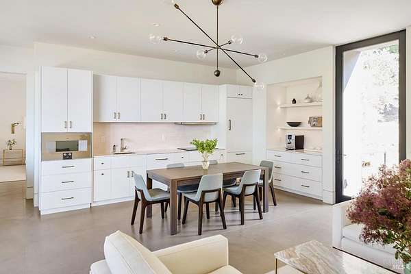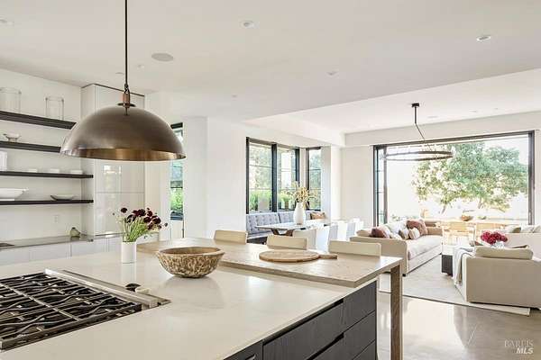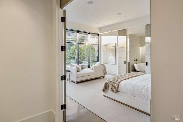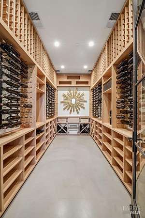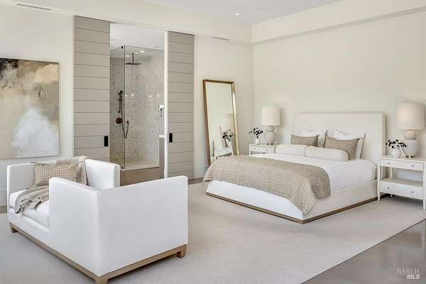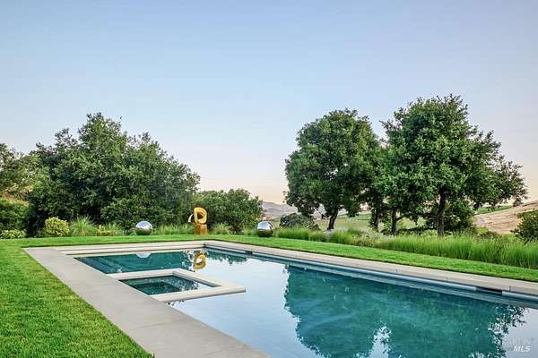 This magnificent estate's main home maximizes natural light and flow. Featuring three en-suite bedrooms, with a primary suite boasting a spa-style bath, walk-in closet, outdoor shower, and sun deck with vineyard and mountain views. The home includes a media room, sunroom, game room, gym, and an open-concept chef's kitchen with imported Italian cabinetry, scullery, BBQ deck, and family room overlooking the pool and spa. Expansive terraces lead to the pool area, offering vineyard views from almost every room. Additional features include a climate-controlled wine cellar, two-car garage with lift, and three fireplaces. The separate guest house mirrors the main residence's quality, offering two en-suite bedrooms and a full kitchen. Ten-foot, floor-to-ceiling windows frame oak trees and vineyards, and a cantilevered deck provides privacy and views. This extraordinary property is offered turnkey, fully furnished with high-end designer pieces, ready for immediate enjoyment. It's a modern Napa retreat, offering seclusion yet is just a 10-minute drive to downtown Napa and an hour from San Francisco