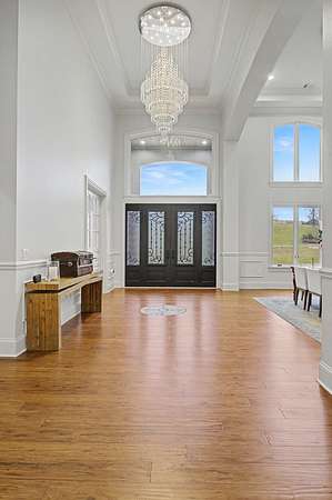 Set on over two acres in the rolling countryside of Arrington, this custom luxury estate blends grand architecture with warm, livable elegance. Designed with a combination of the European Baroque style with a blend of American traditional, creating a unique atmosphere of simple elegance with grace. The moment you enter, soaring ceilings, dramatic designer lighting, beautiful hardwood flooring, and handcrafted millwork create an unforgettable first impression, while a stunning round, ballroom-inspired living room anchors the home with curated finishes. At the heart of the home, the chef's kitchen is a showpiece built for effortless hosting, featuring double islands, dual sinks, a wet bar, walk-in serving and storage pantries and a full suite of professional-grade Viking appliances. Flowing seamlessly into a coffered-ceiling family room with stone fireplace creates the perfect gathering space. The main-level primary wing is a private retreat designed for total relaxation complete with spa-inspired bath showcasing a walk-through shower, dual vanities, private twin toilets, expansive walk-in closets, and a dedicated laundry. A light-filled sitting room with fireplace and built-in office is the perfect at home workspace. Every guest bedroom is en-suite, offering comfort for family and visitors alike. Outside, an expansive covered patio with fireplace and multiple TV stations extends the living space into a true outdoor oasis, ideal for year-round entertaining and quiet evenings overlooking the peaceful acreage. Just a short walk to Arrington Elementary and minutes from Arrington Vineyards, Franklin, and Nashville, this home offers the rare combination of luxury, space, and convenience.