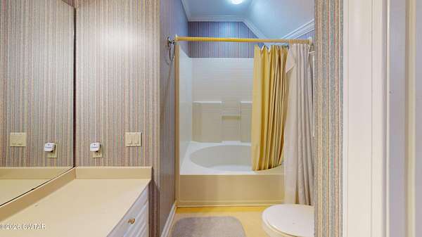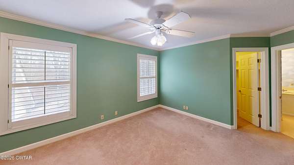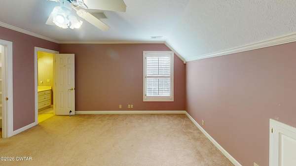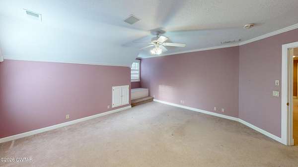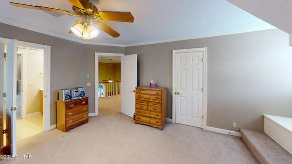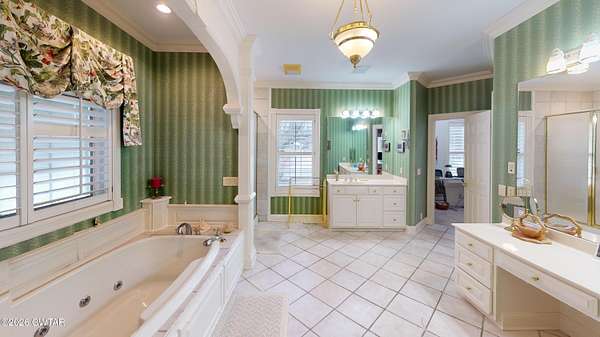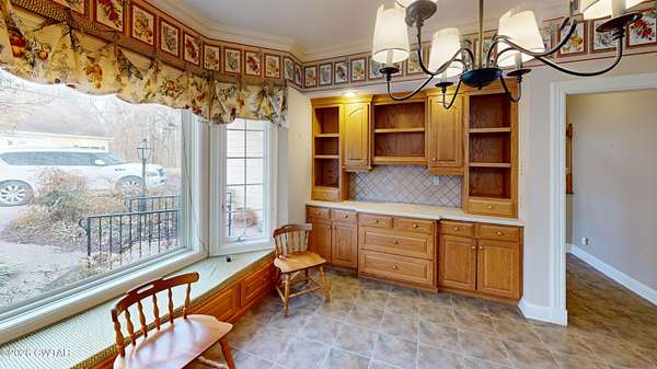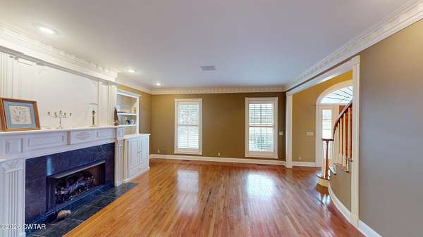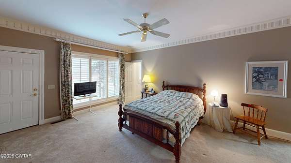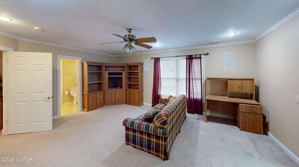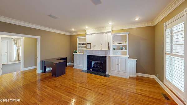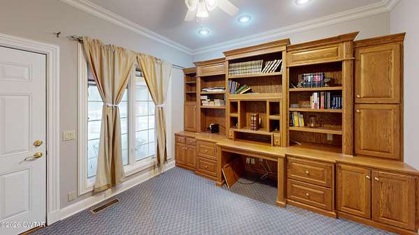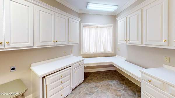 - Bookcases, Breakfast Bar, Ceiling Fan(s), Central Vacuum, Commode Room, Crown Molding, Double Vanity, Eat-In Kitchen, Entrance Foyer, Granite Counters, High Ceilings, Kitchen Island, Pantry, Primary Downstairs, Soaking Tub, Tub Shower Combo, Walk-In Closet(s)