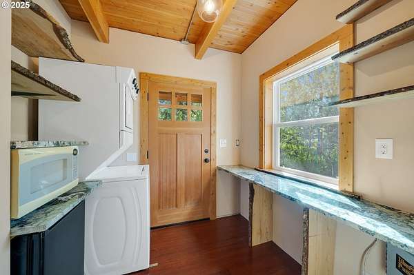 - Ceiling Fan, Hardwood Floors, Laundry, Skylight, Vaulted Ceiling, Washer Dryer