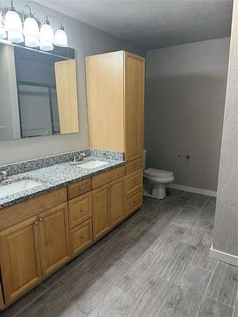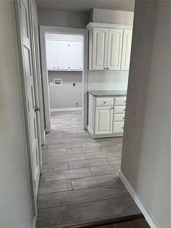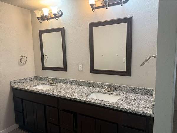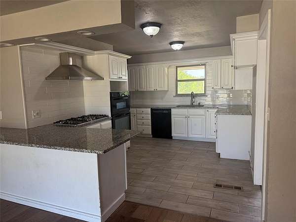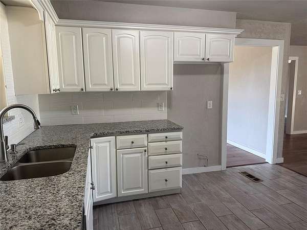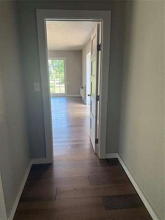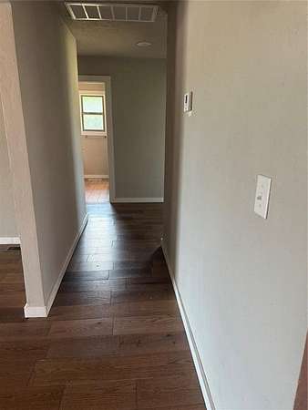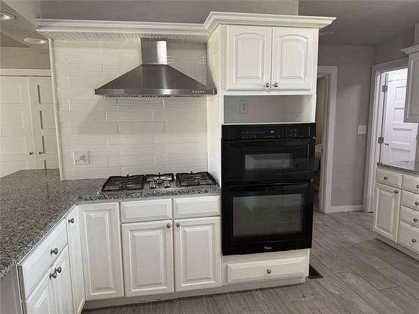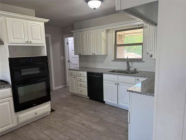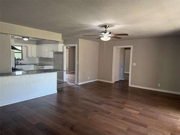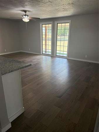 Large 4 bed 4 bath brick home on 1.6 ac in middle of Shawnee. Move in ready, the remodel includes newer wood laminate flooring through out home no carpet. Large kitchen with granite countertops, bathrooms updated as well, all newer doors and windows. It appears the original two car garage was converted into a second primary suite giving ample space for combined family living. A newer 2 car garage was added on the front of the home. There are two living areas one on front and one on back with open kitchen flowing into both. Has a formal dining room that overlooks a large deck and beautiful acreage. Enjoy wildlife and privacy while being in town and near amenities.