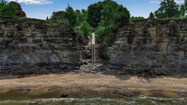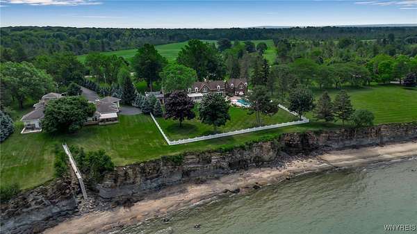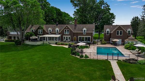 Experience luxury lakefront living on 2.5 acres of manicured grounds with 200 feet of private beachfront along Lake Erie. This extraordinary estate offers panoramic westerly views and breathtaking sunsets, just 20 minutes from downtown Buffalo. Featuring six bedrooms, five full baths, and two half baths, this meticulously maintained property includes a gracious foyer, formal living and dining rooms, and a library/office with built-in bookshelves. Enjoy entertaining with two full kitchens, including a possible first-floor in-law suite complete with its own kitchen, full bath, and laundry overlooking the lake and pool. The spa room with kitchenette opens to a heated swimming pool, gas fire pit, and wood-burning fireplace on the entertainment patio. A fully equipped gym is located above the carriage house. Additional highlights include a four-car garage, 600 amp electrical service, upgraded mechanicals, and a massive U-shaped exposed aggregate concrete driveway. One of the last Lake Shore Estates with a gradual walk-down beach and ocean-like views-this rare oasis is truly move-in ready. No detail has been left undone! Square footage is based on an appraisal.