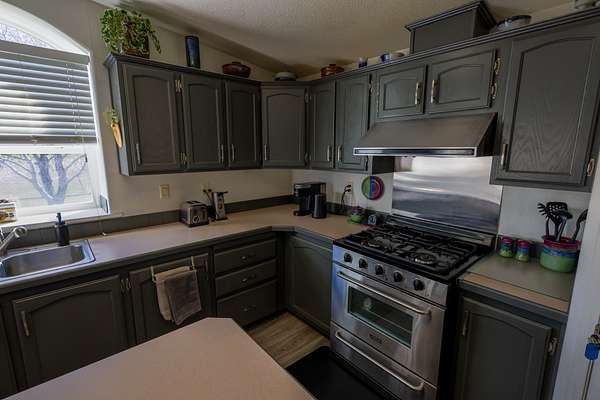 Upon entry, the interior showcases vinyl flooring with carpet accents in the bedrooms and family room. The family room is spacious with vaulted ceilings, wood stove, & built-in white hutch offering storage. The kitchen is well-appointed with a sizable pantry, an island for additional storage, & ample countertop space. The master suite features a walk-in closet & a private 3/4 bath, which is spacious and includes vanity storage and a walk-in shower.